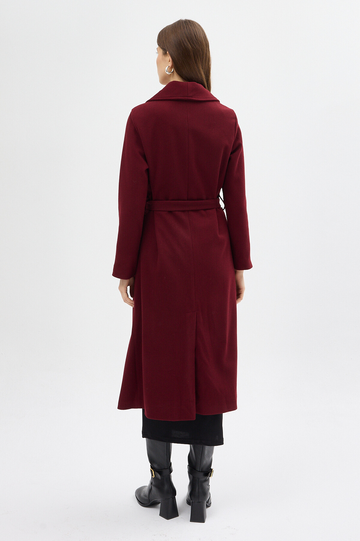 Bordo Kuşaklı Uzun Astarlı Kadın Kaban 7242A