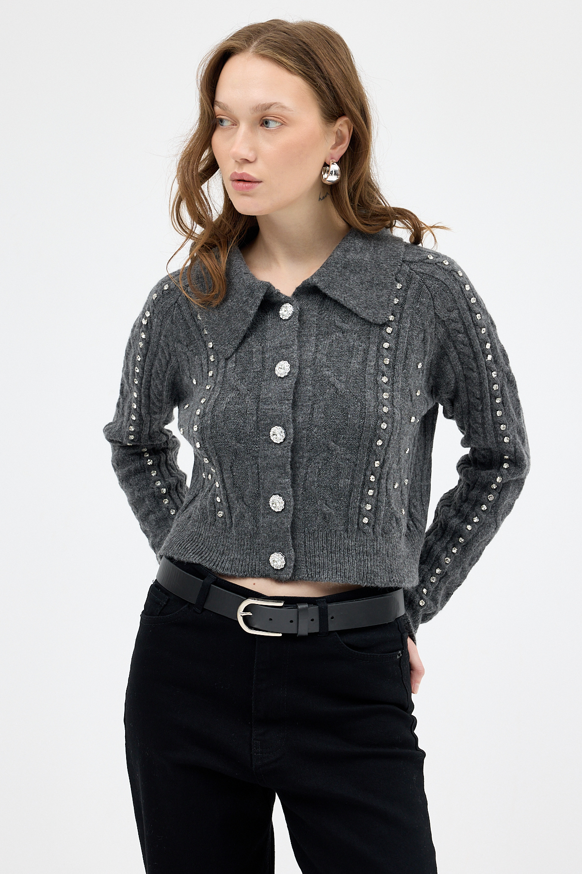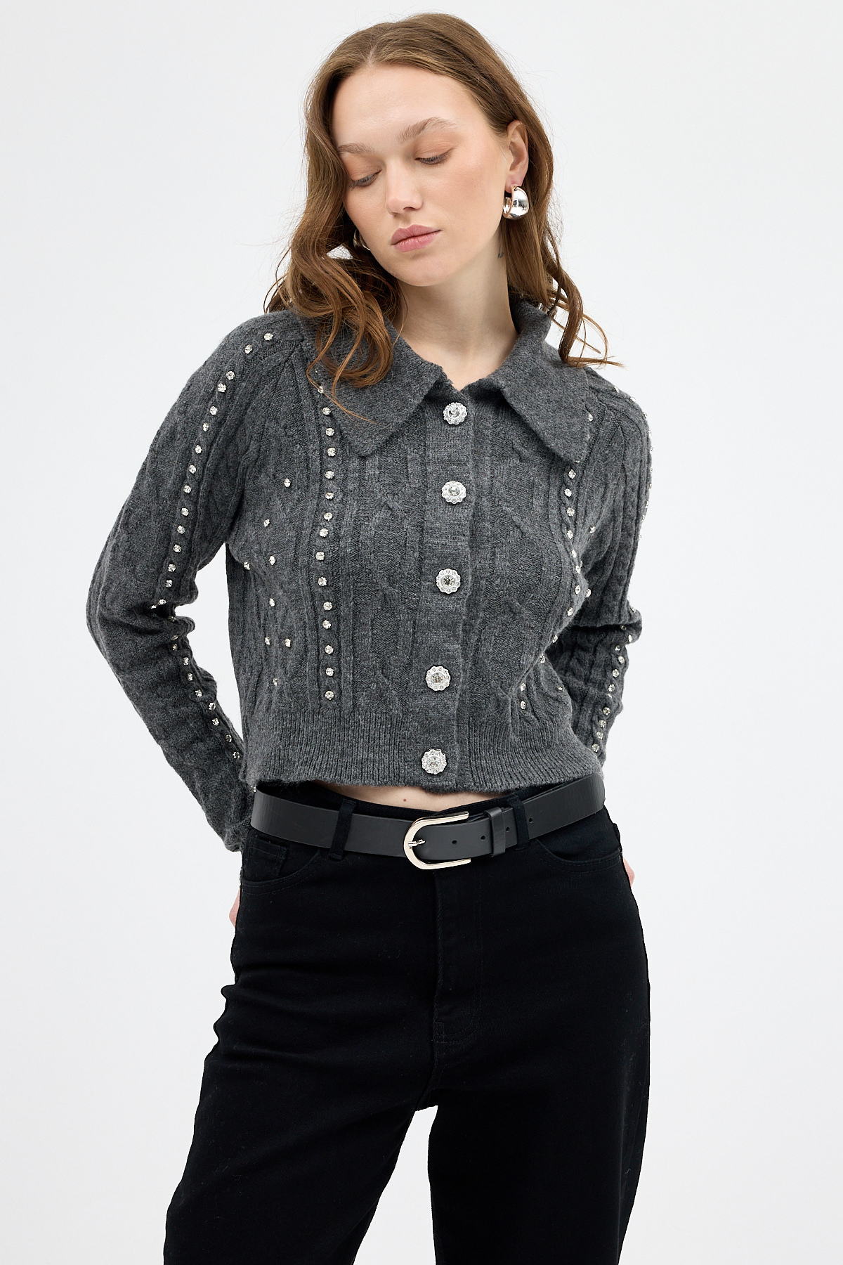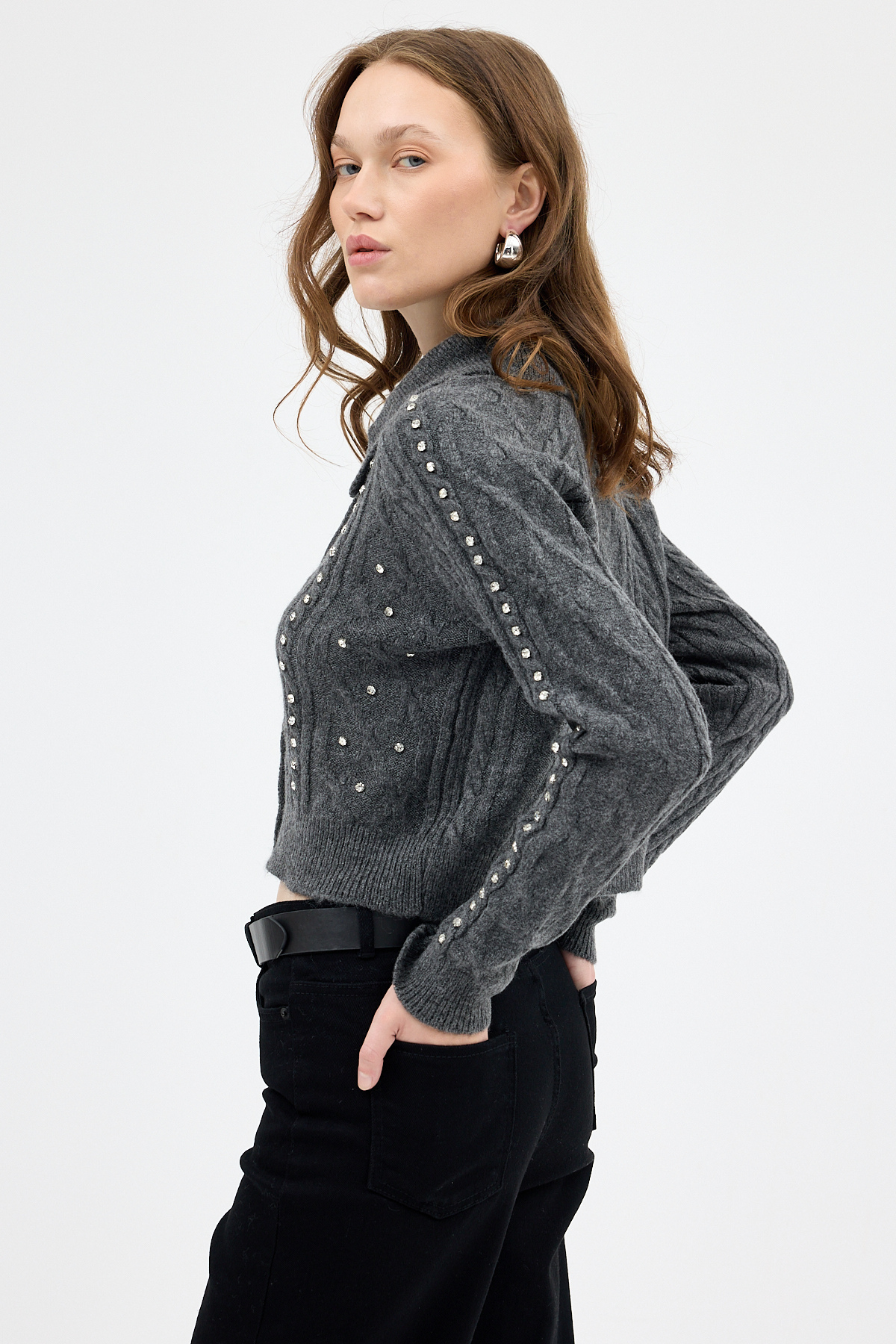 Antrasit Kadın Taş İşlemeli Örgü Hırka 7265