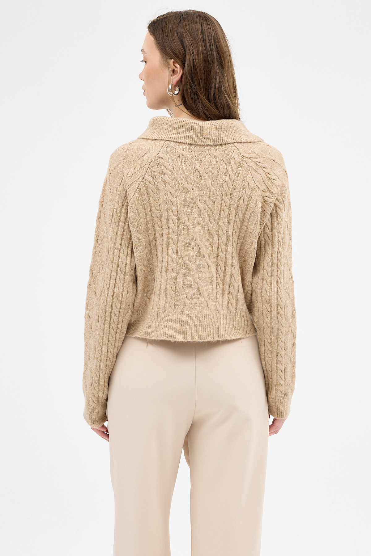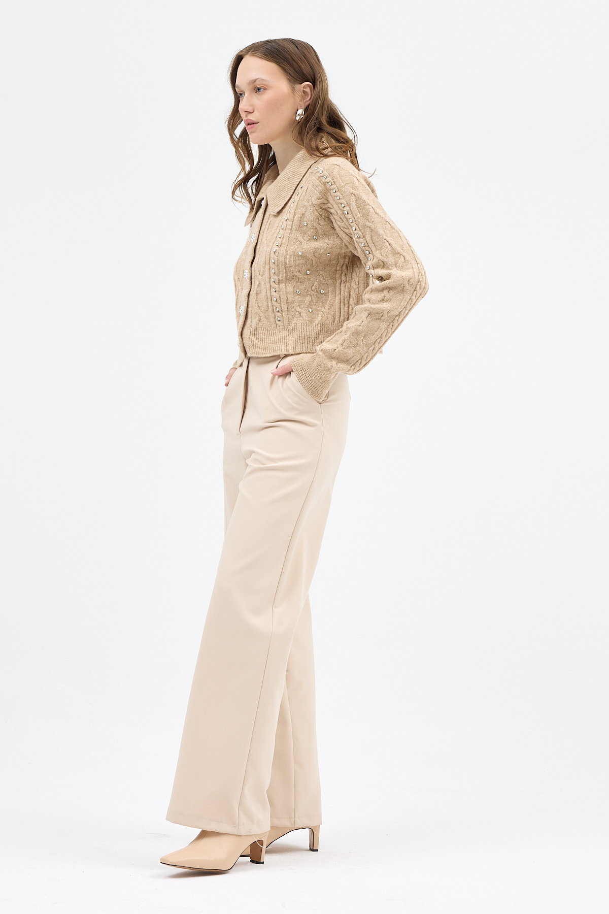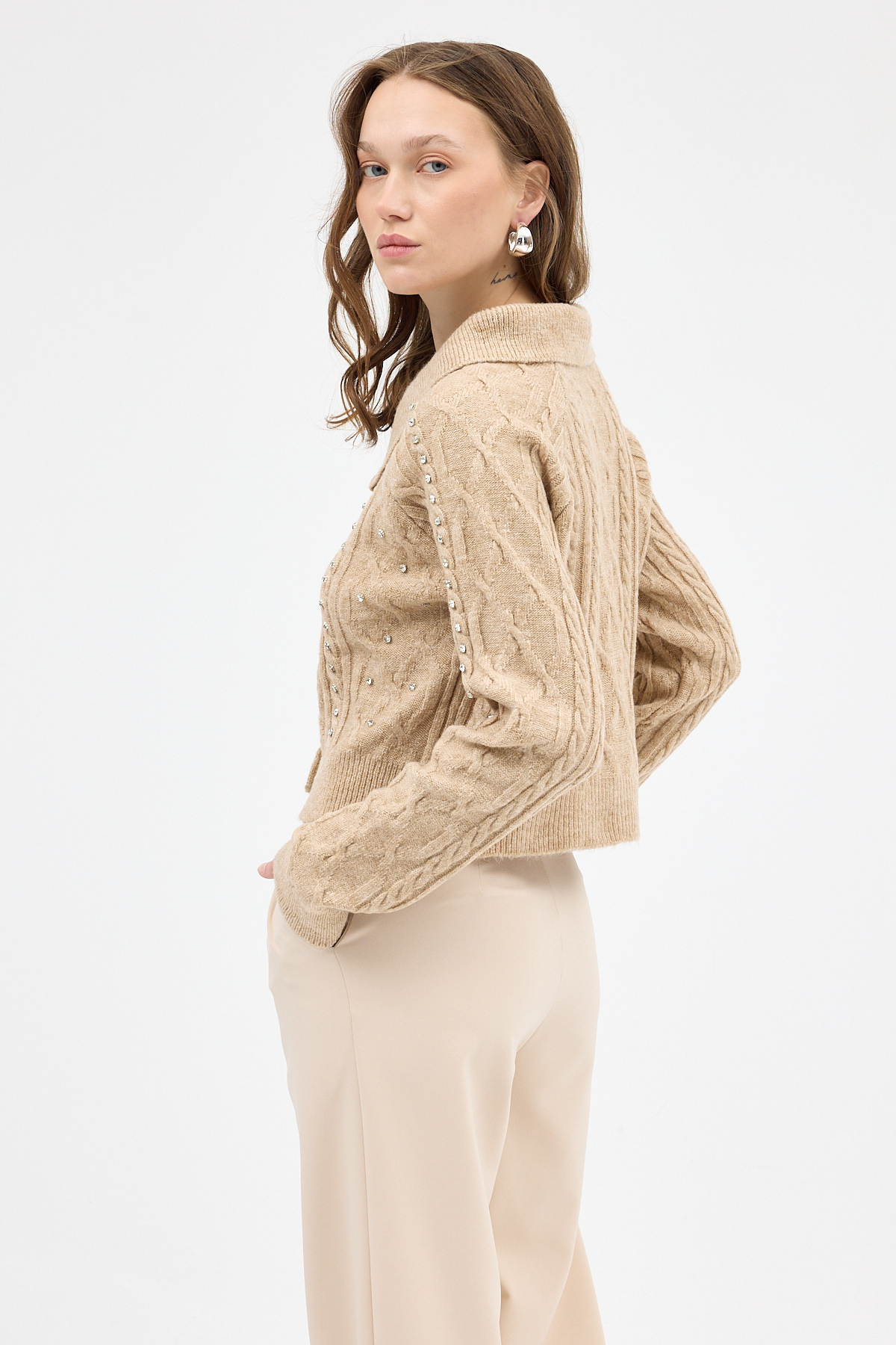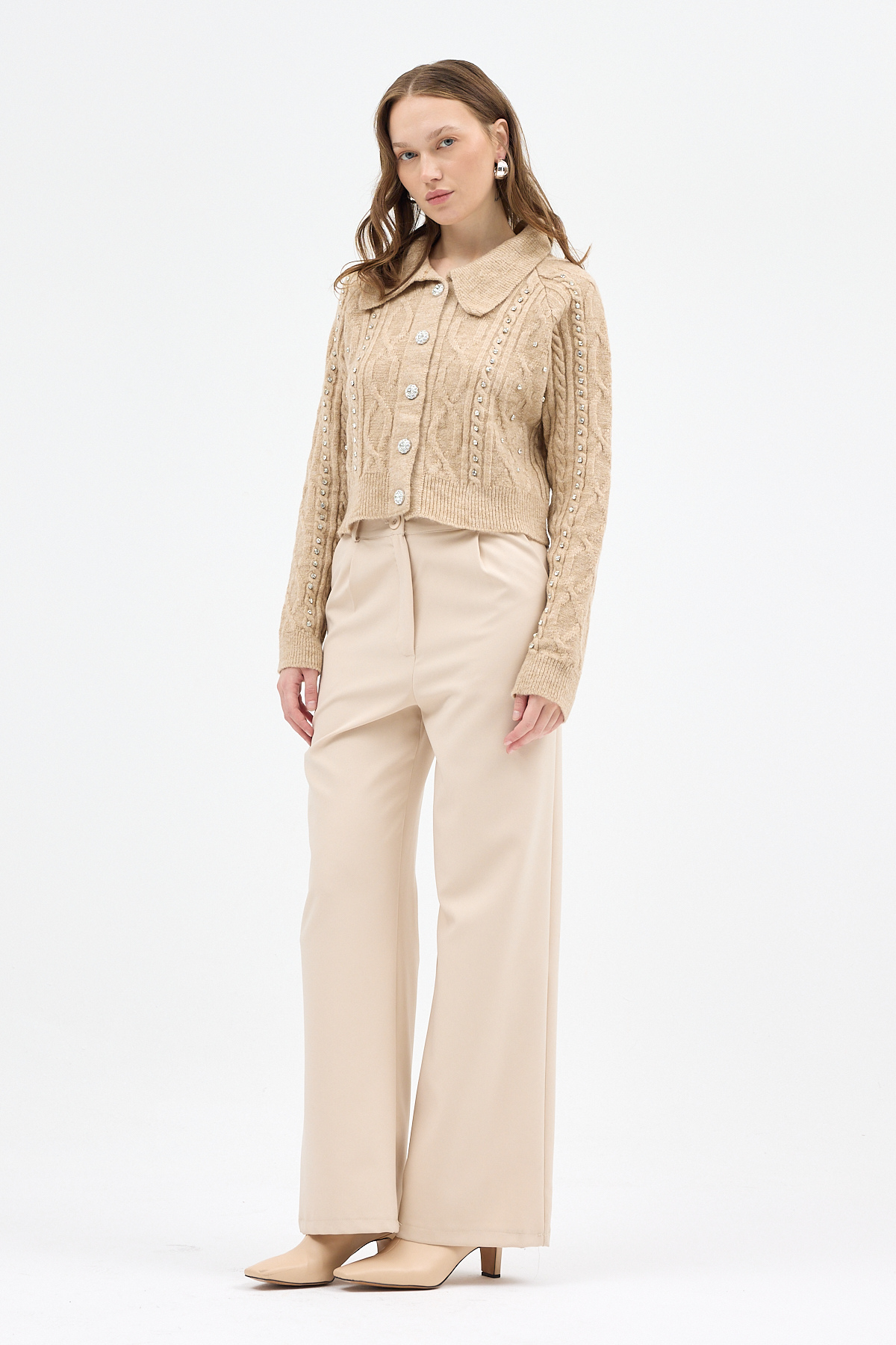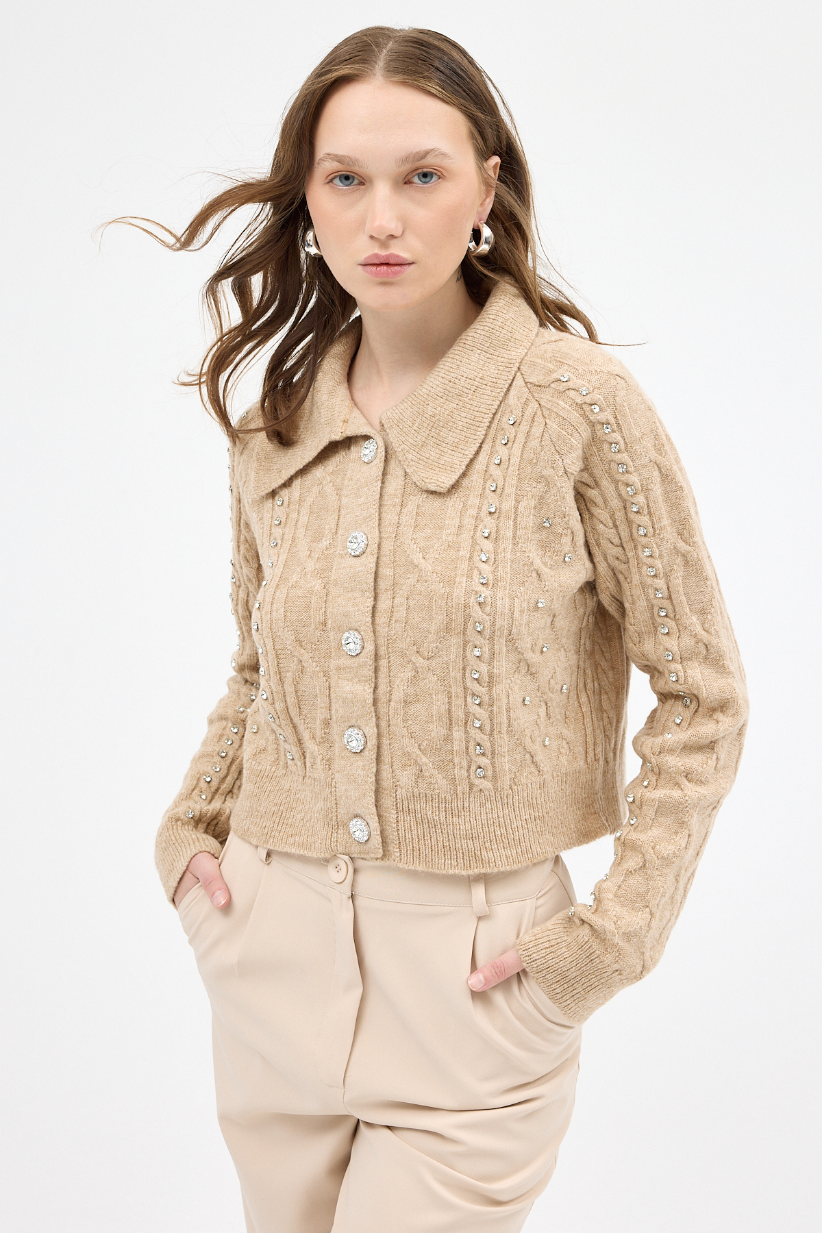 Bej Kadın Taş İşlemeli Örgü Hırka 7265