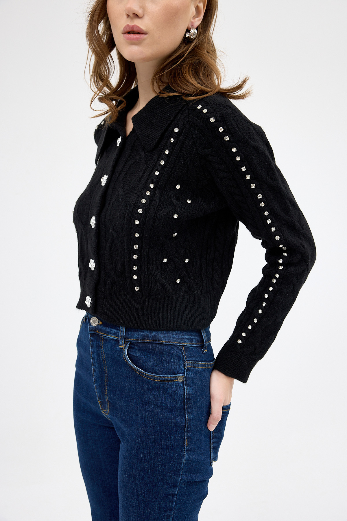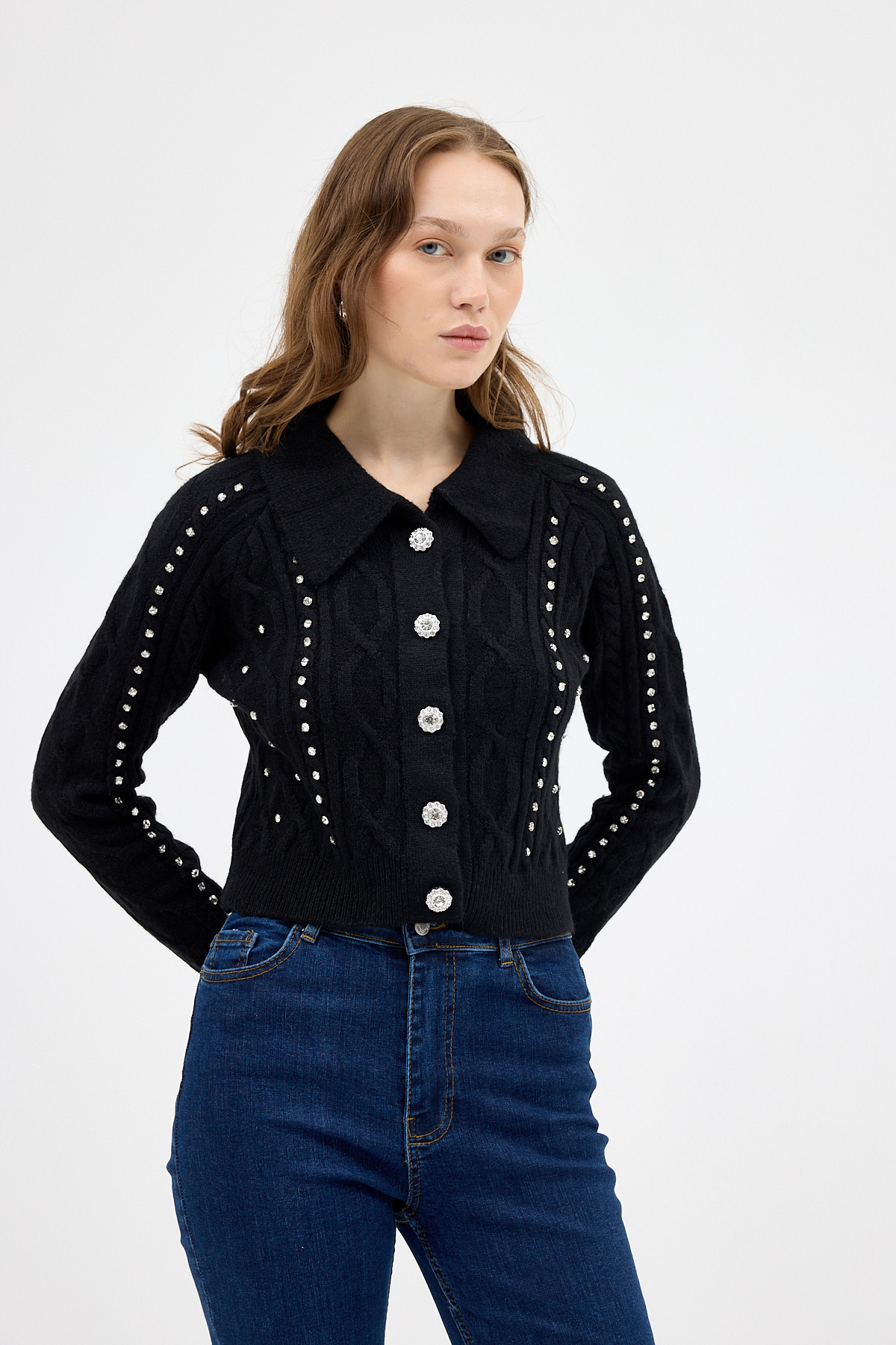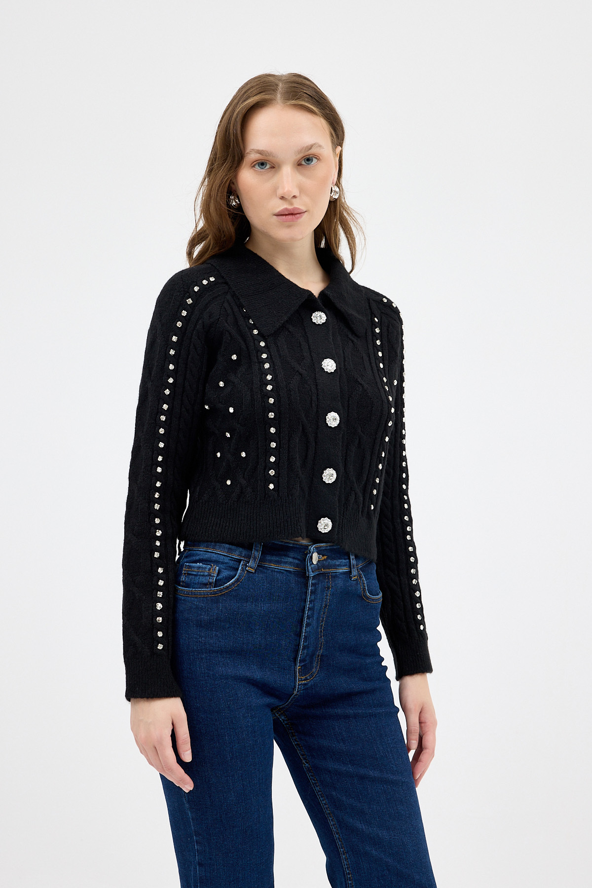 Siyah Kadın Taş İşlemeli Örgü Hırka 7265