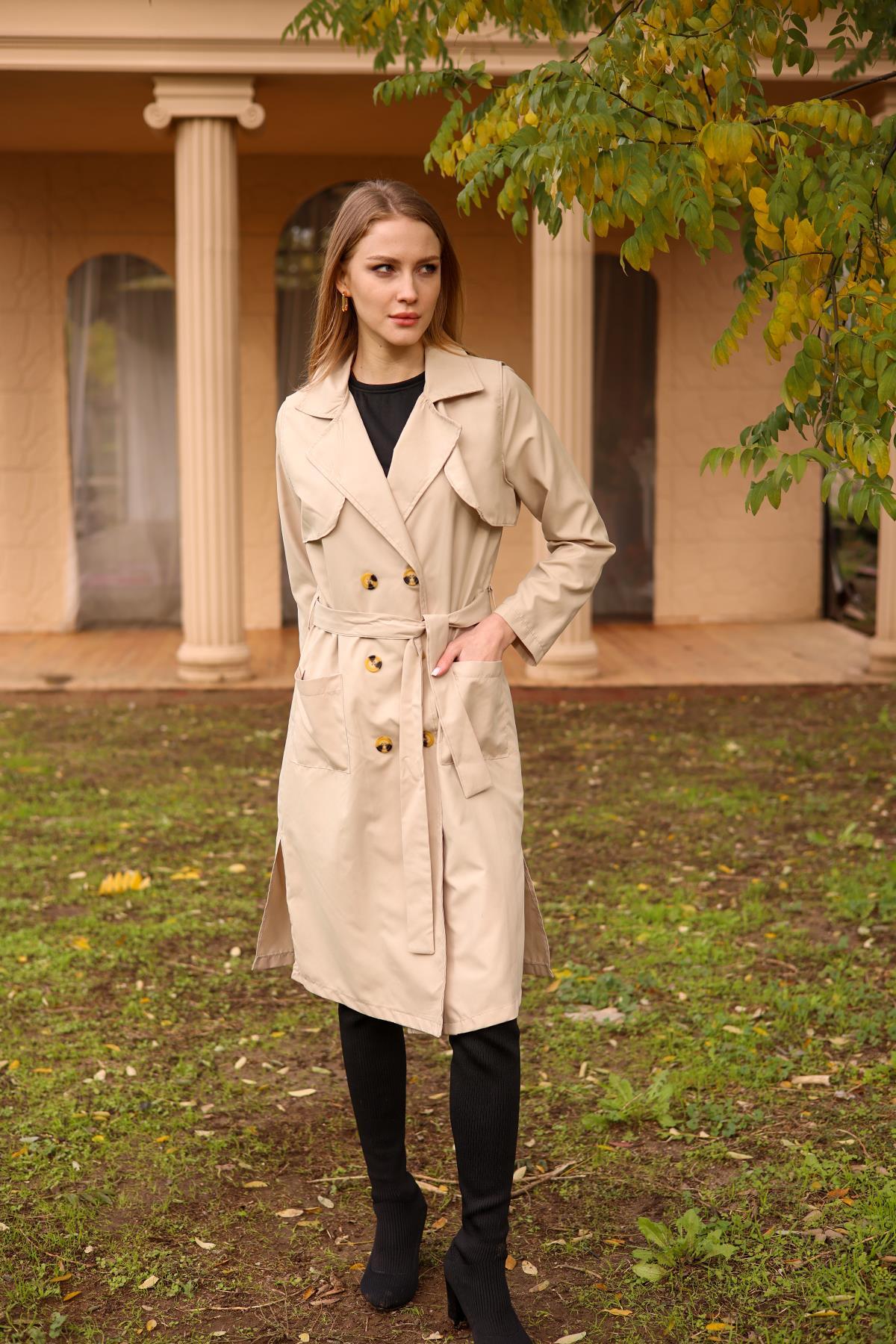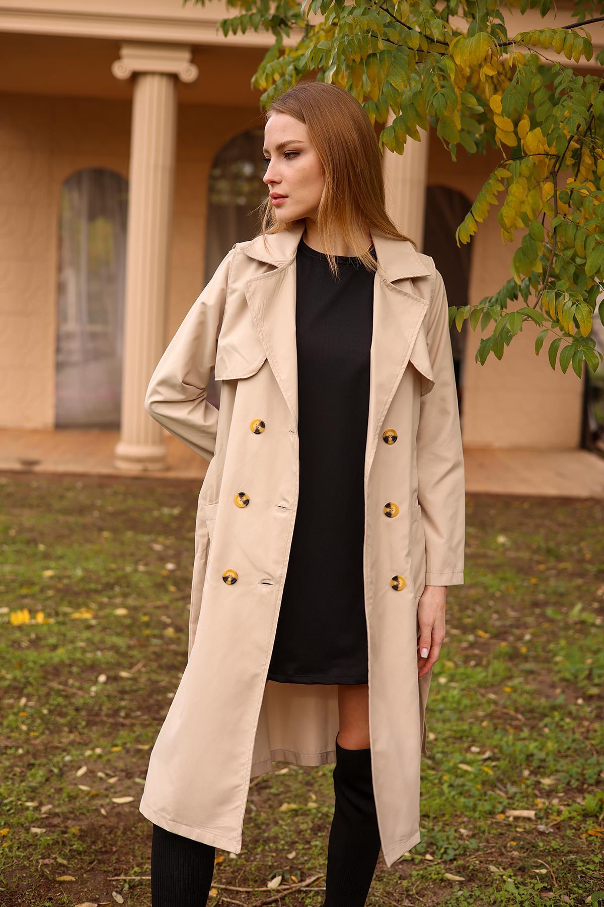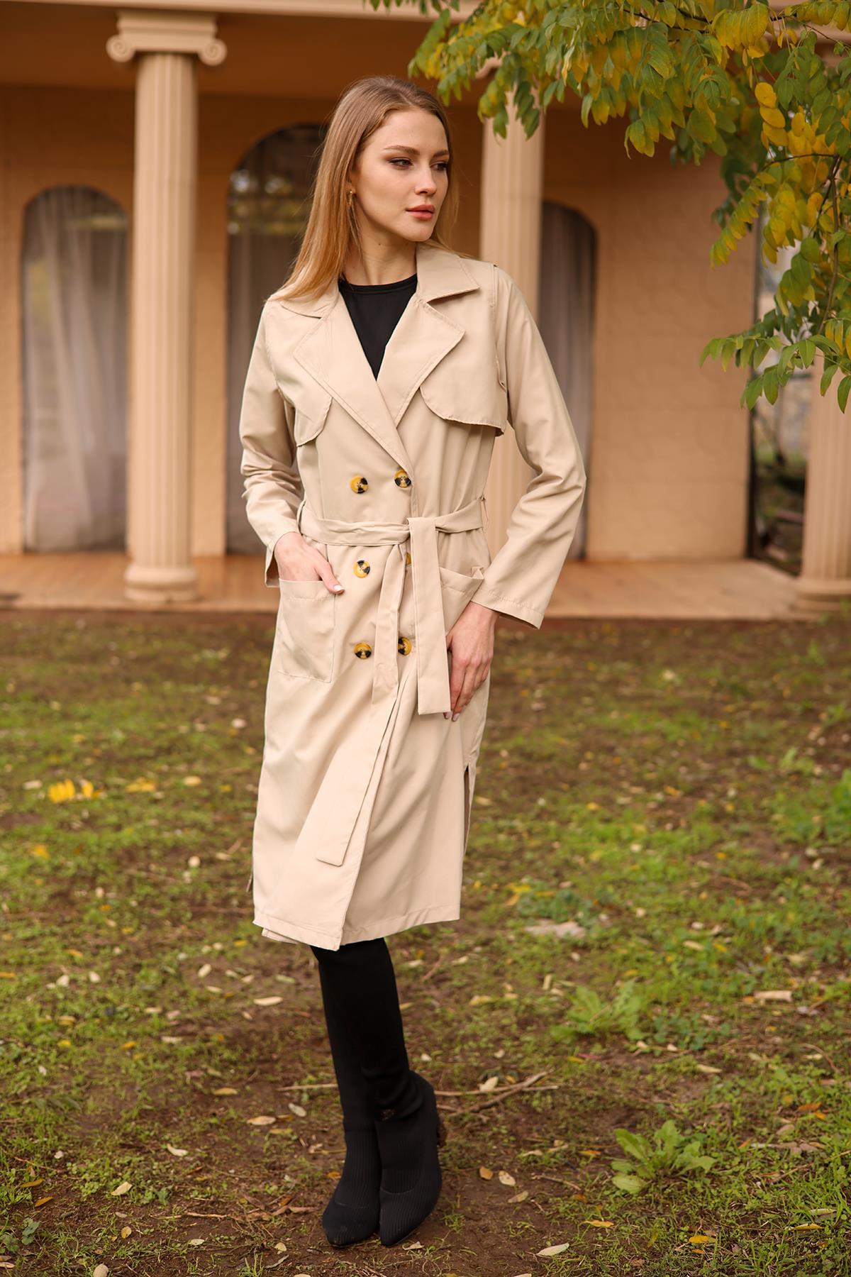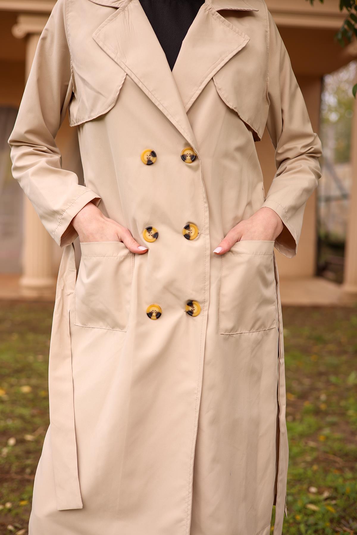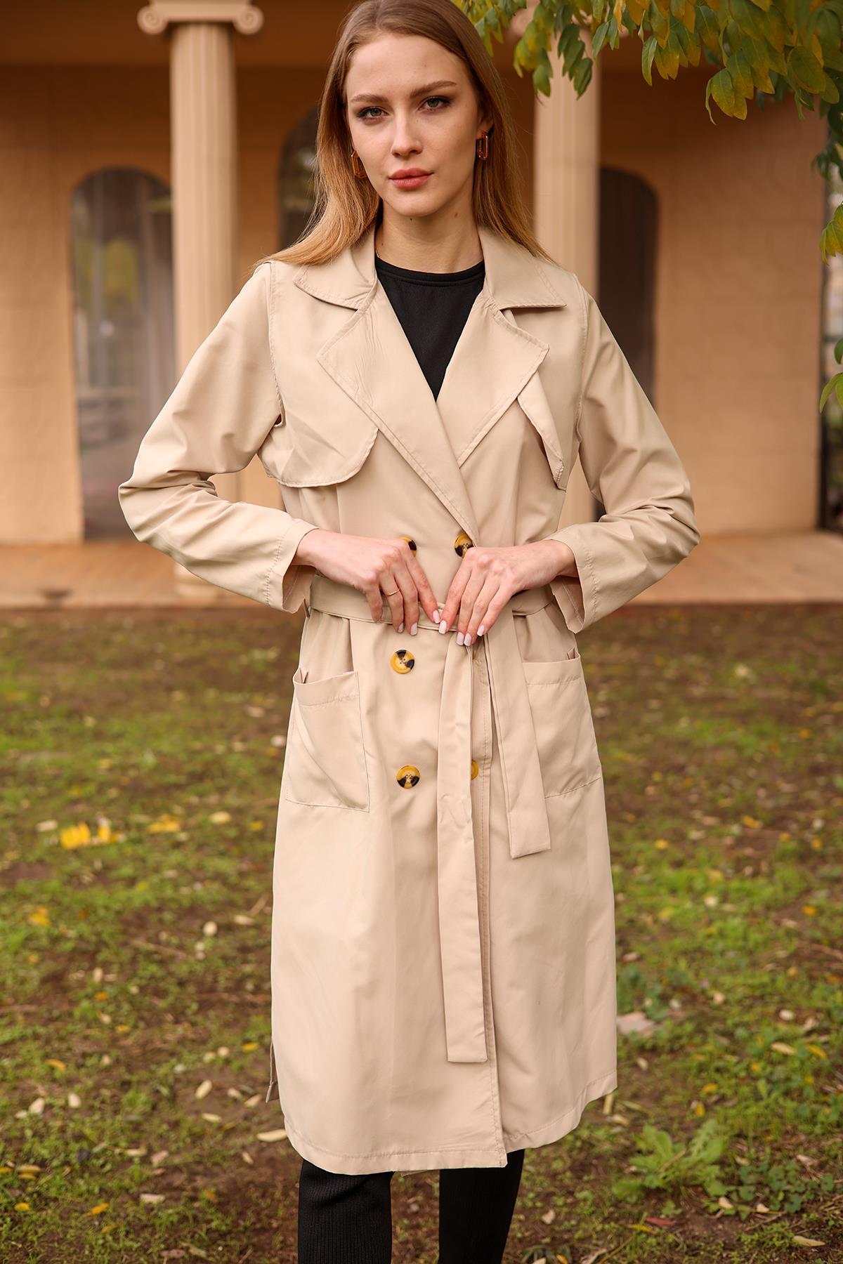 Bej Cepli Kemerli Trençkot 7318A