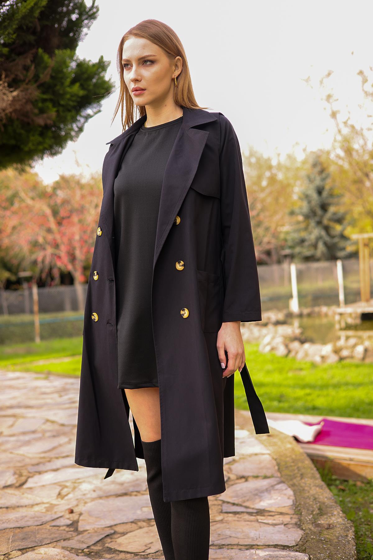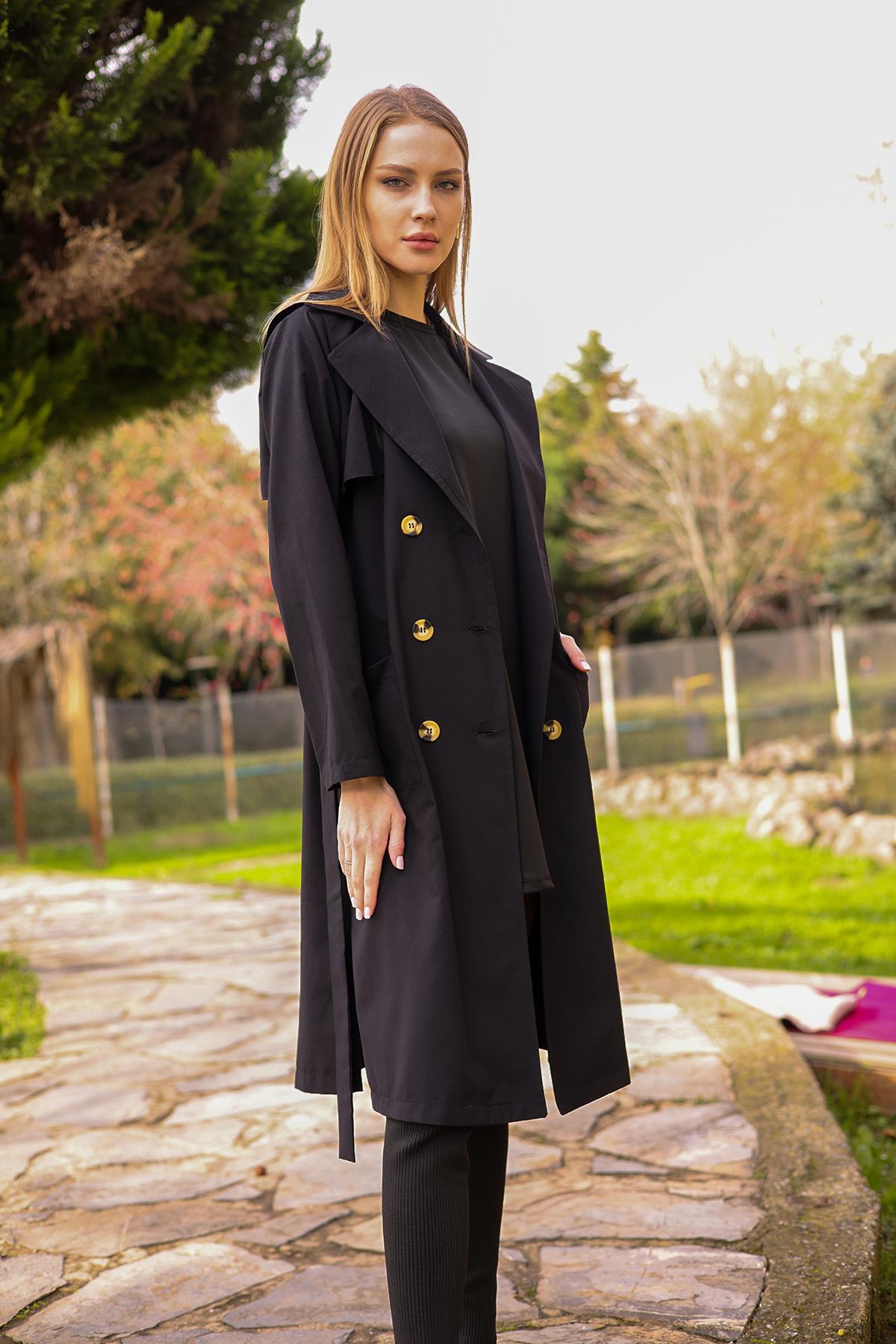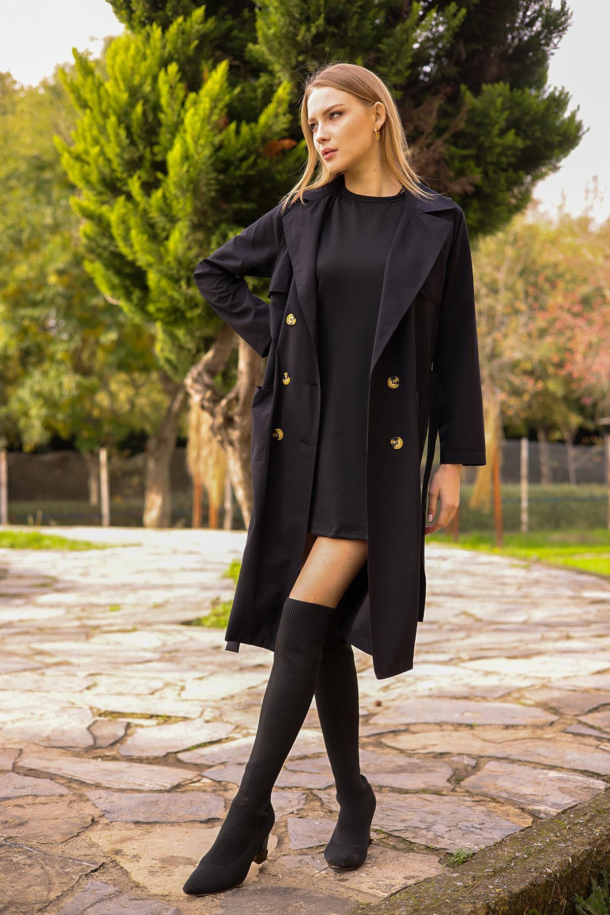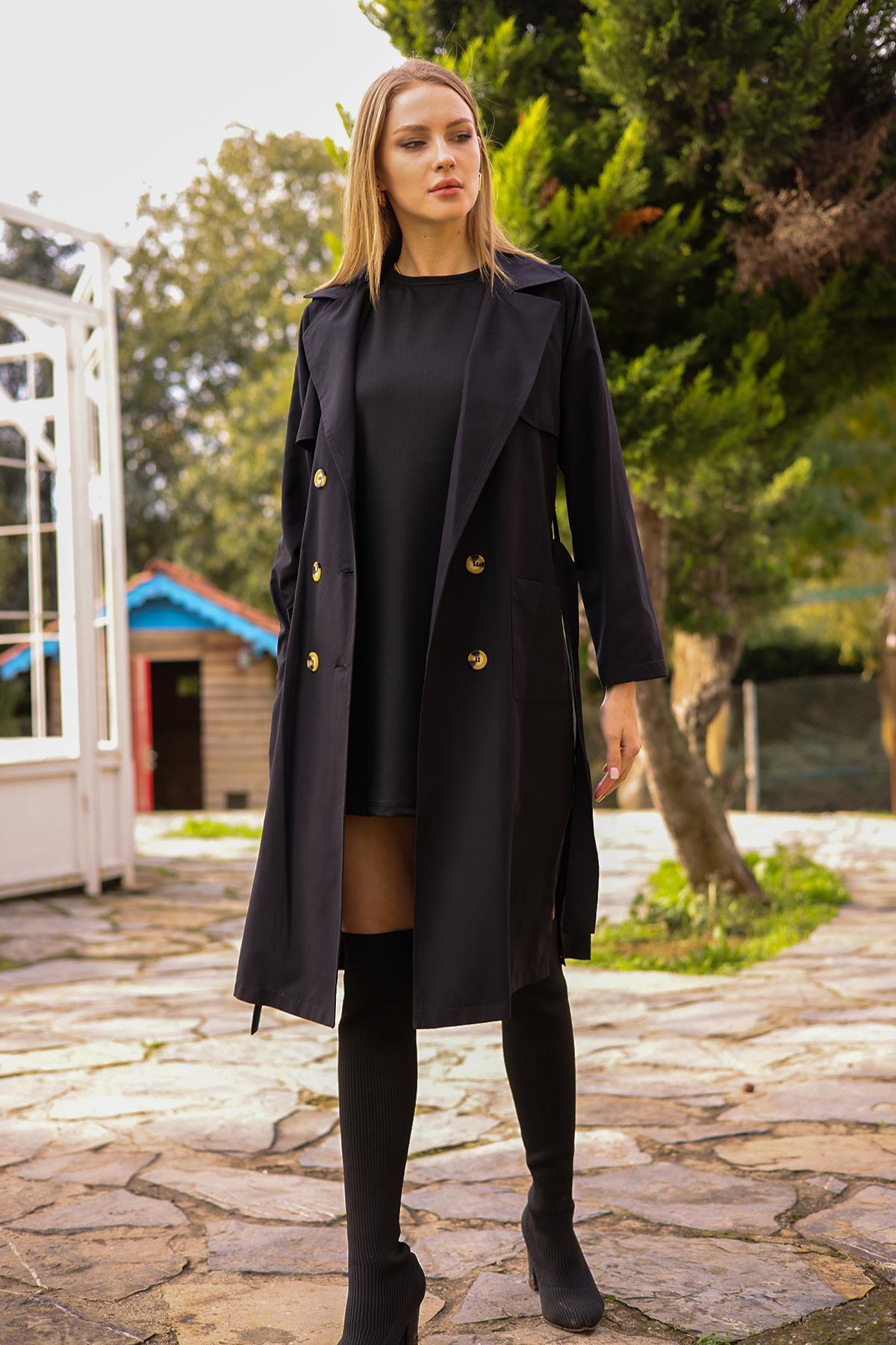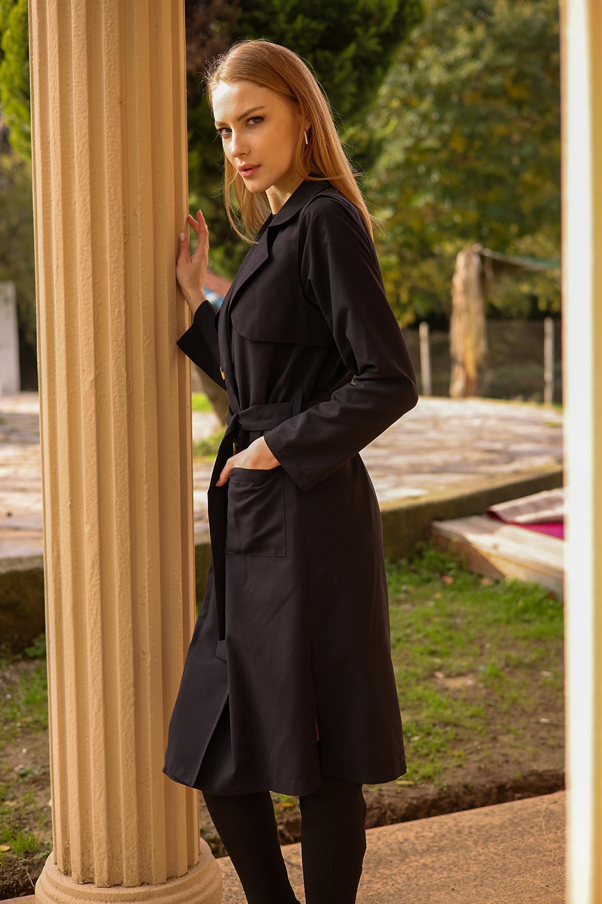 Siyah Cepli Kemerli Trençkot 7318A