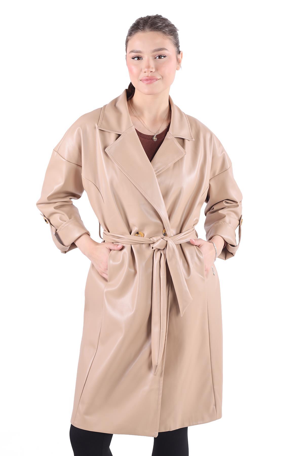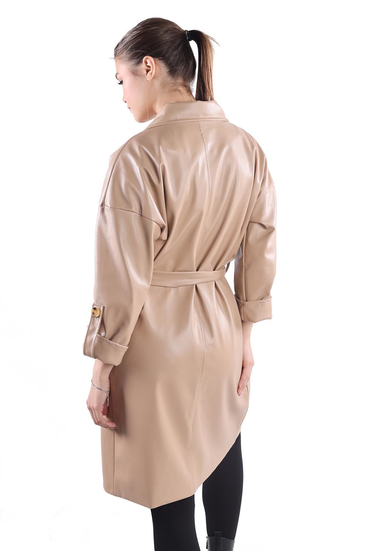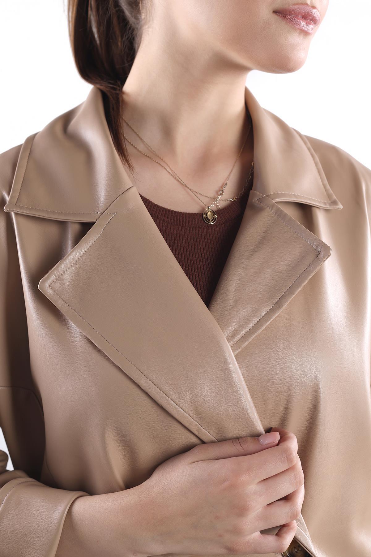 Camel Düğme Detay Kemerli Deri Trençkot 7327A