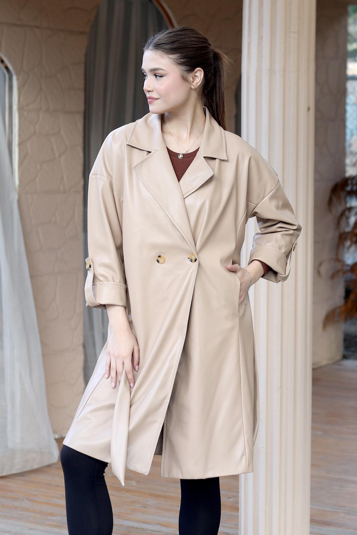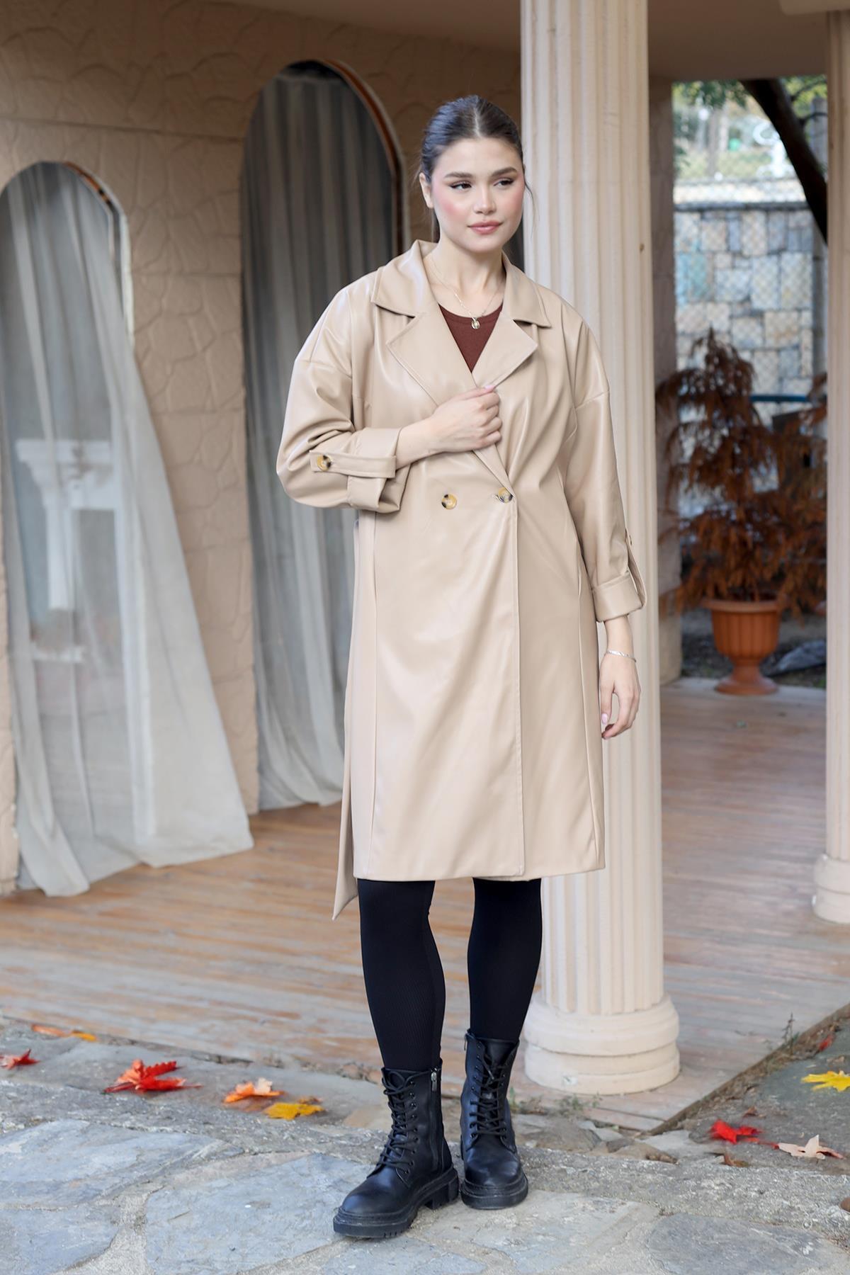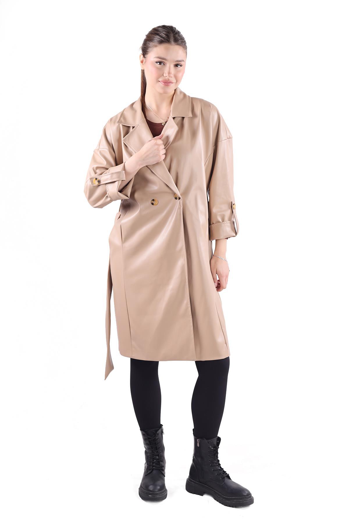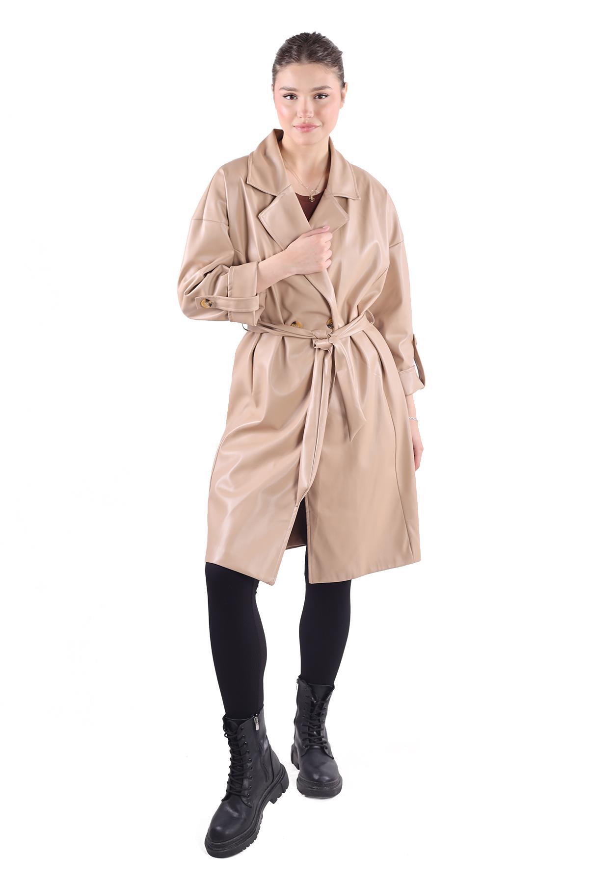 Camel Düğme Detay Kemerli Deri Trençkot 7327A