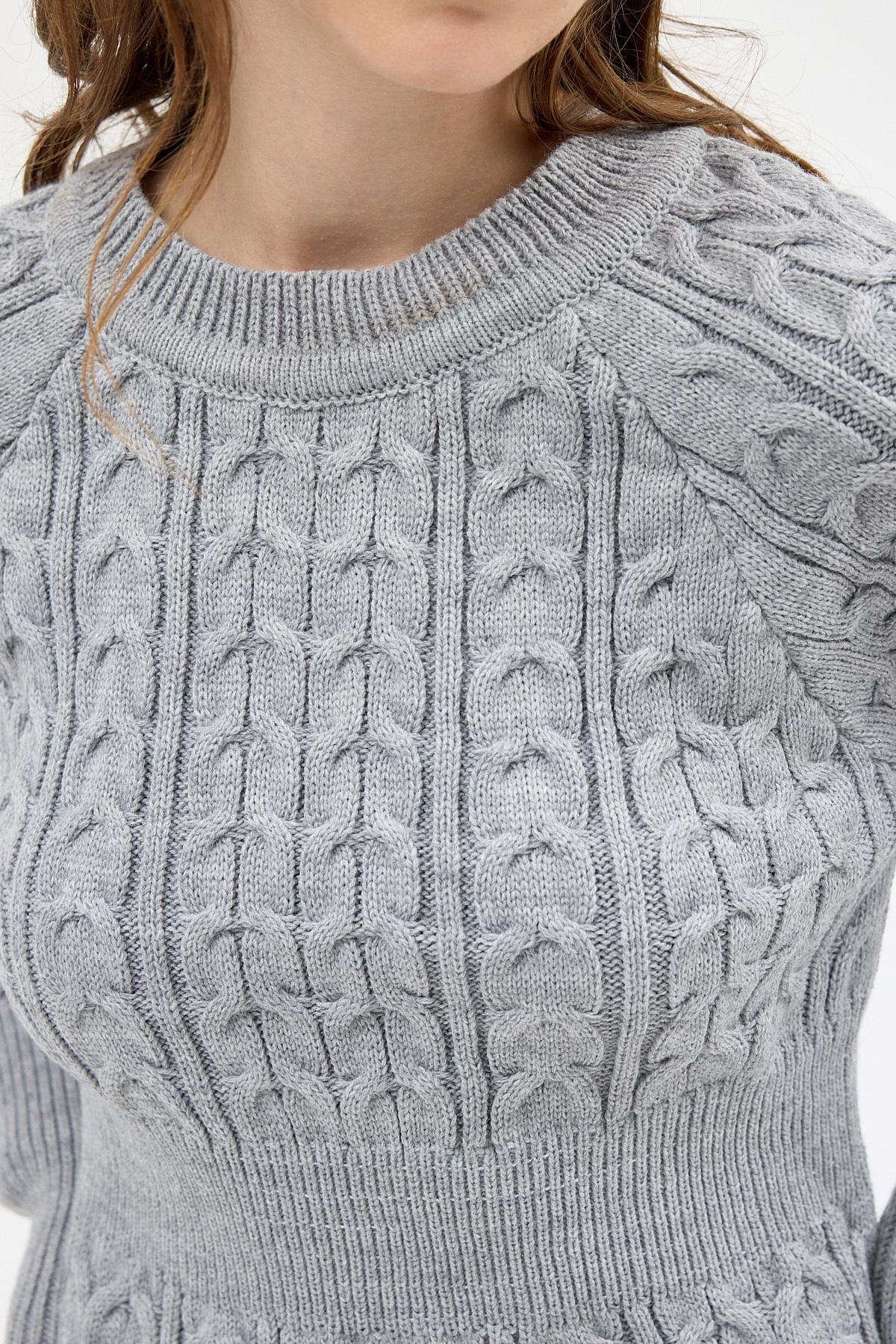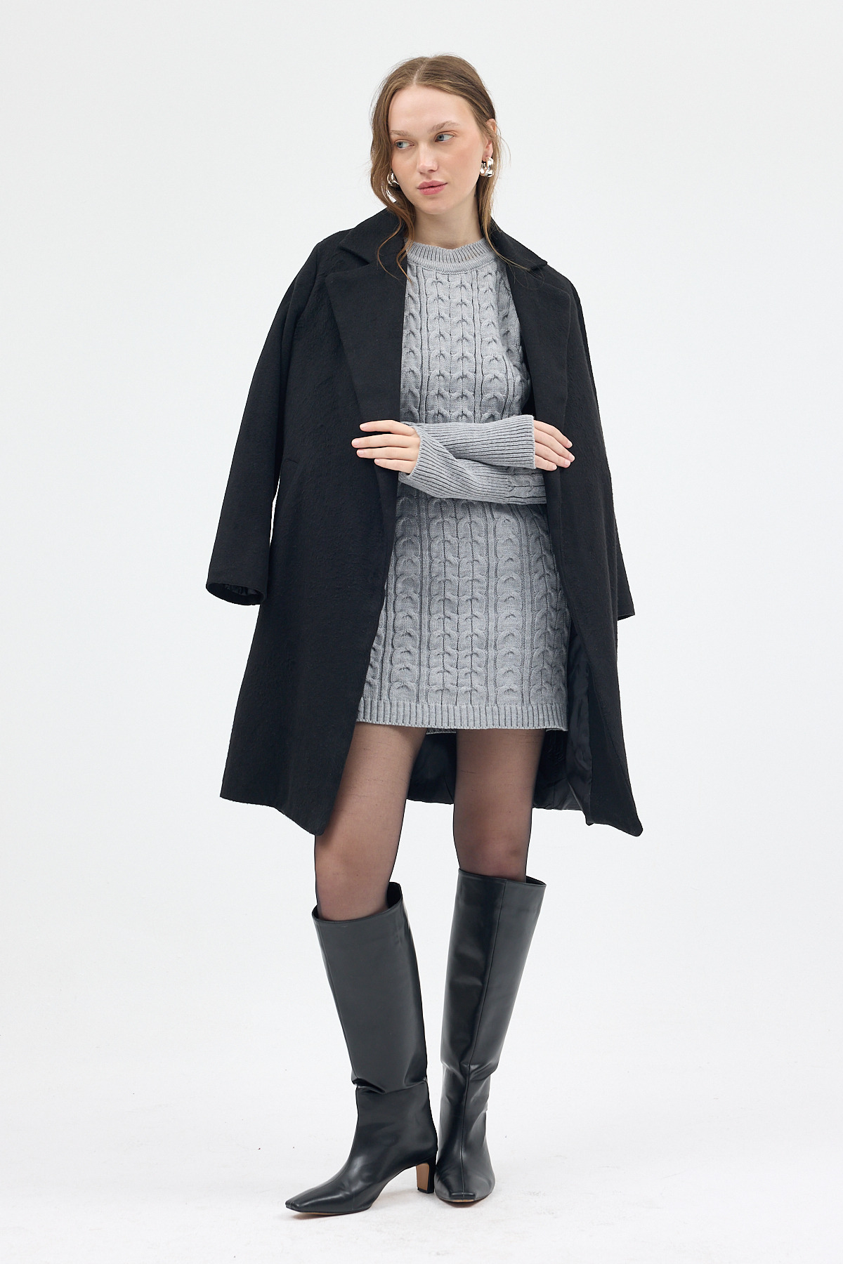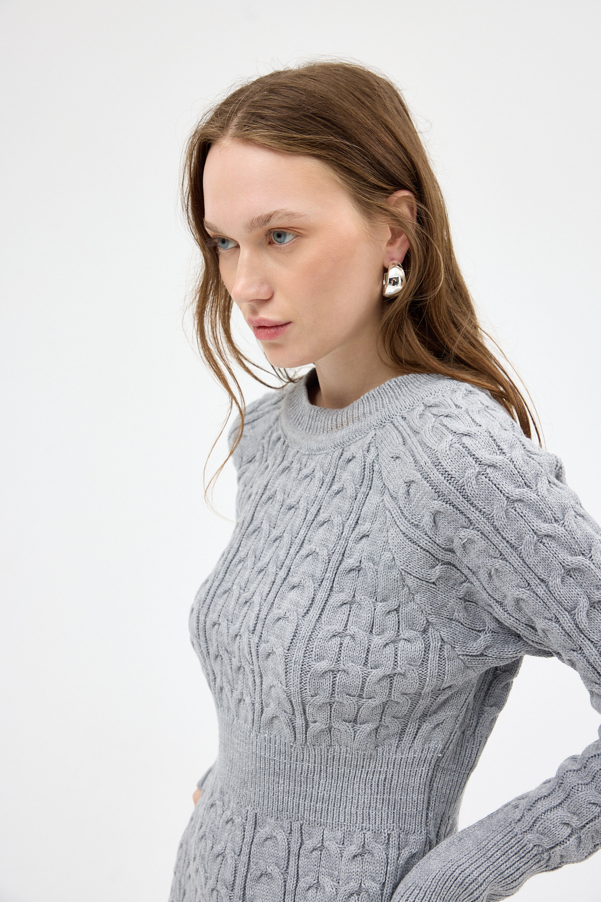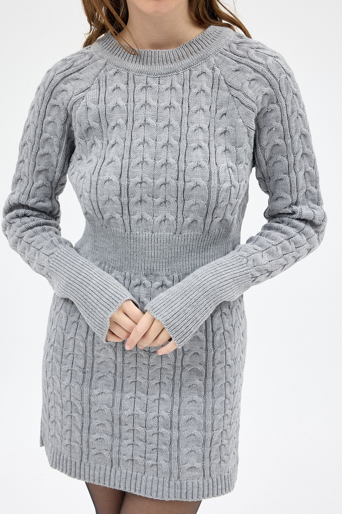 Açık Gri Kadın Kalın Örgü Bel Detaylı Triko Elbise 7330