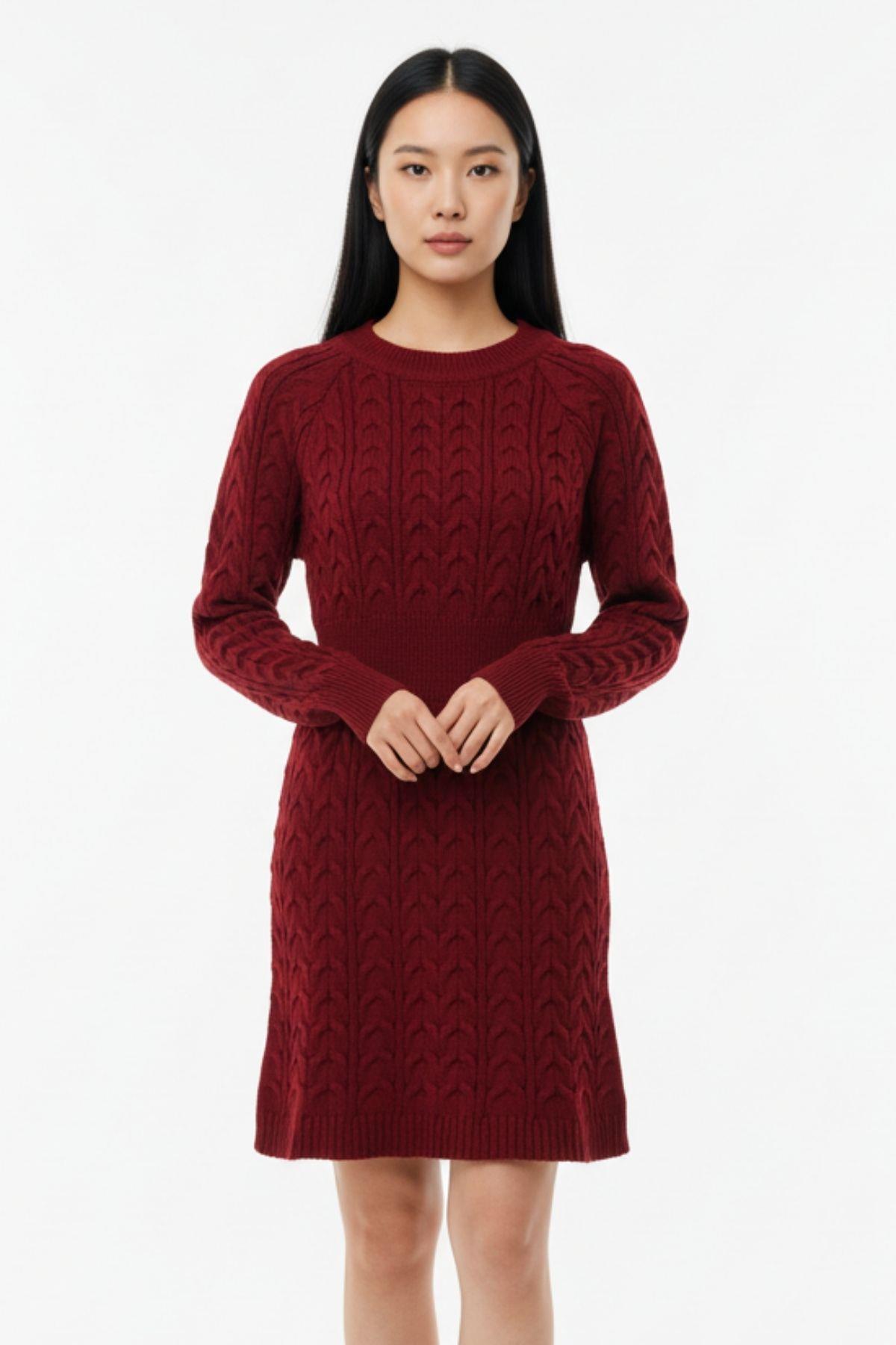 Bordo Kadın Kalın Örgü Bel Detaylı Triko Elbise 7330