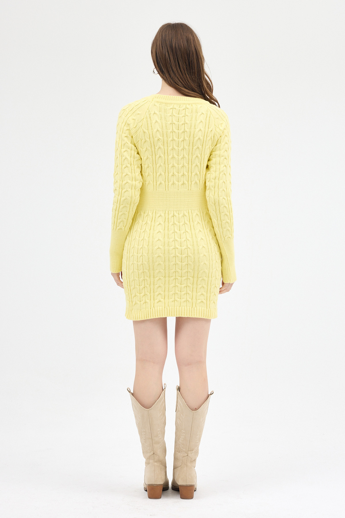 Sarı Kadın Kalın Örgü Bel Detaylı Triko Elbise 7330