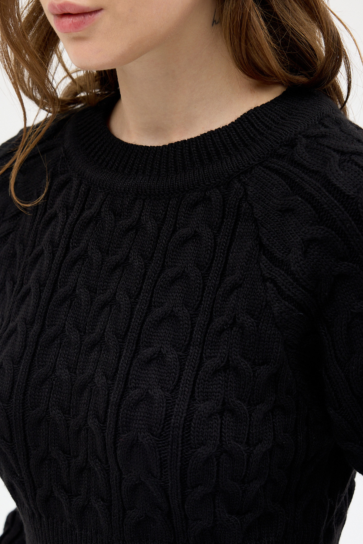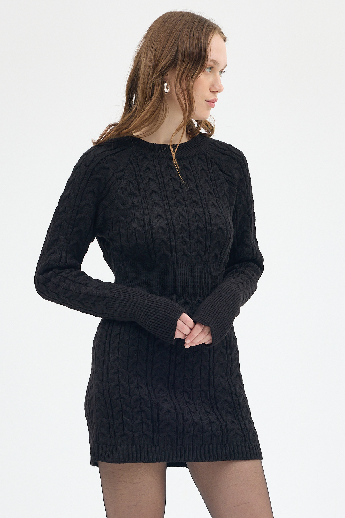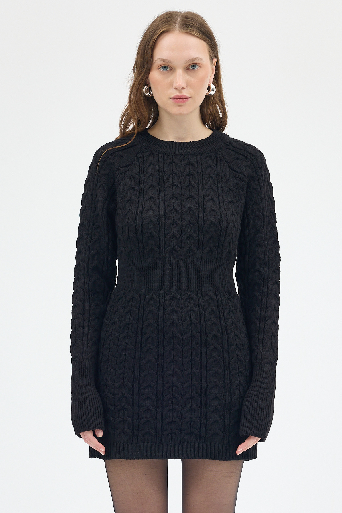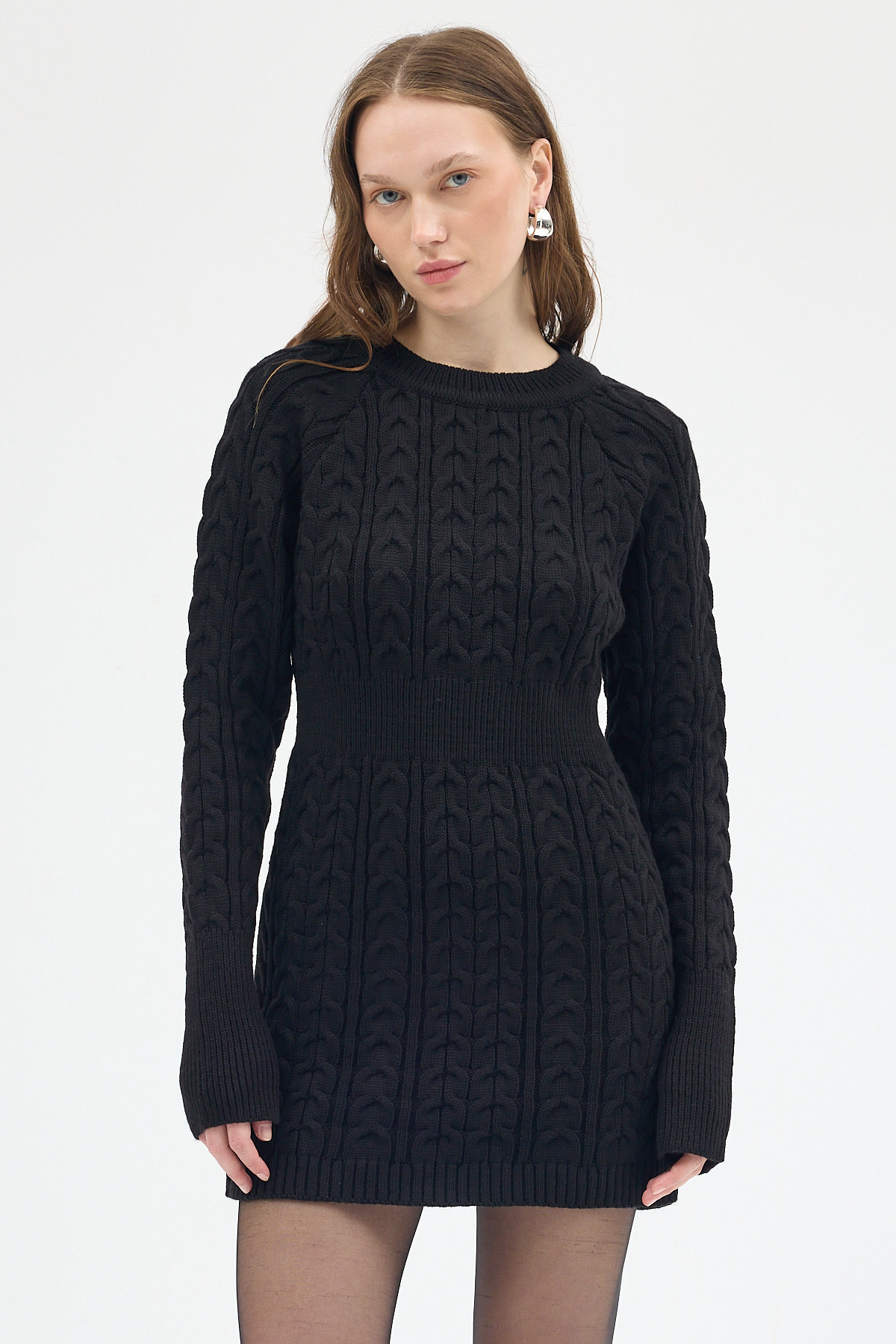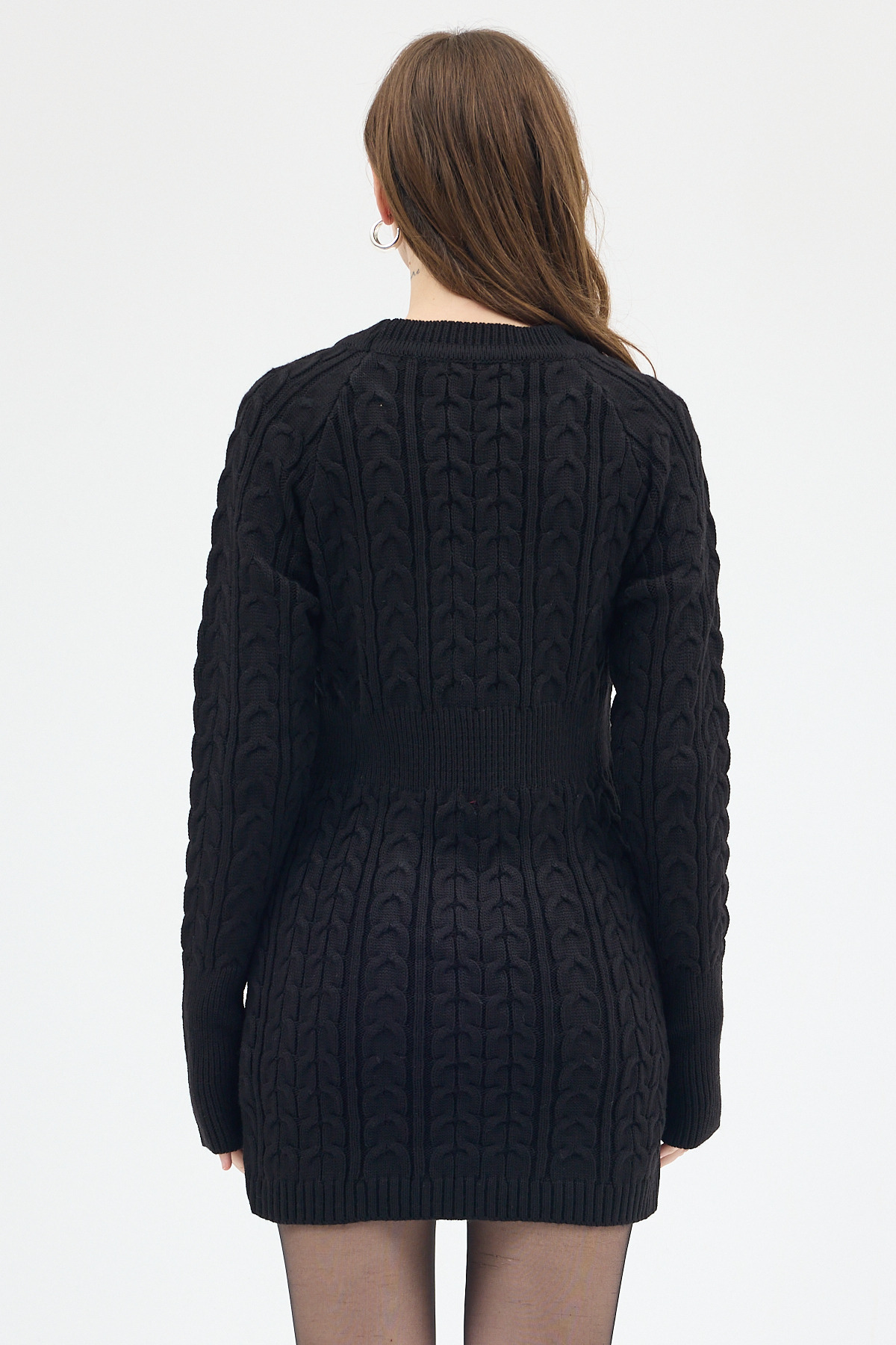 Siyah Kadın Kalın Örgü Bel Detaylı Triko Elbise 7330