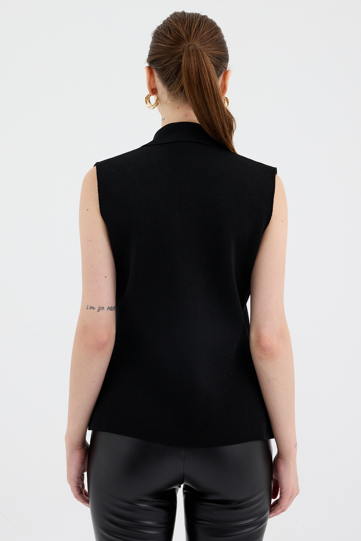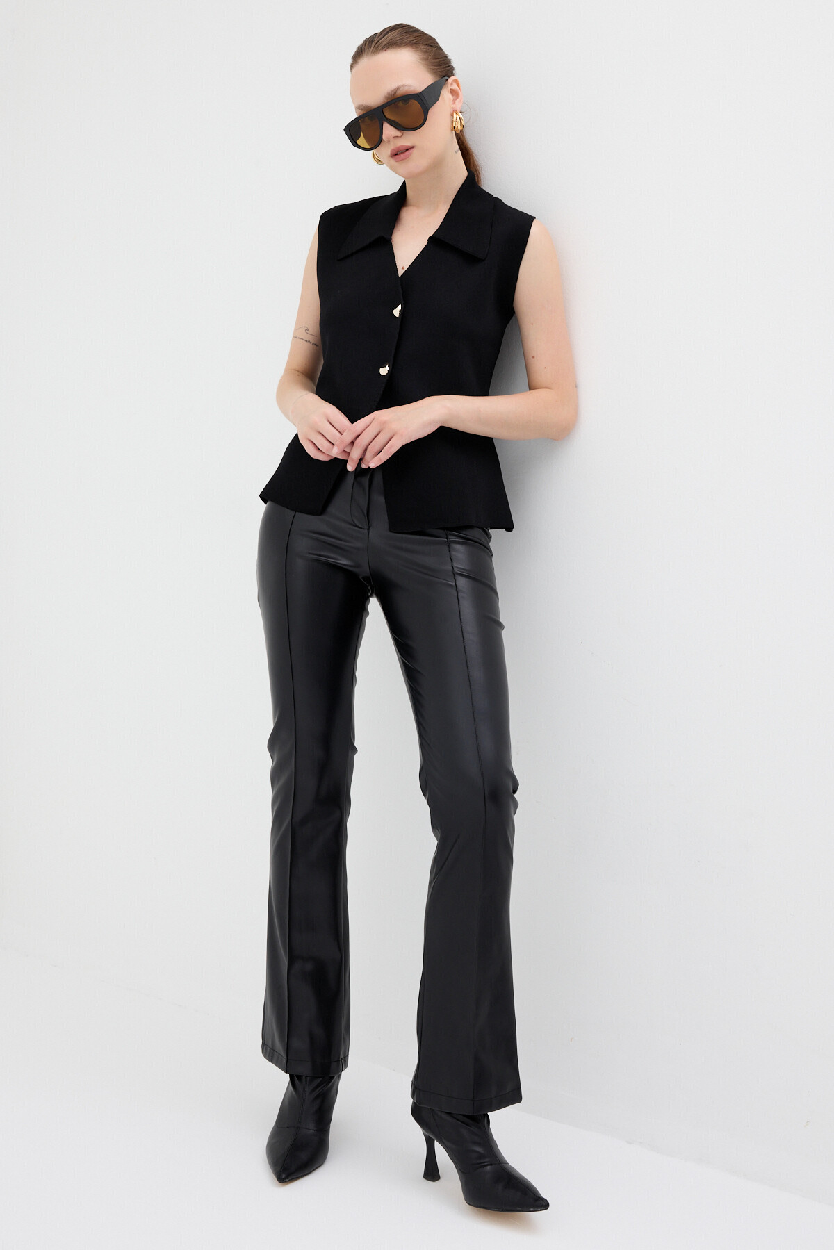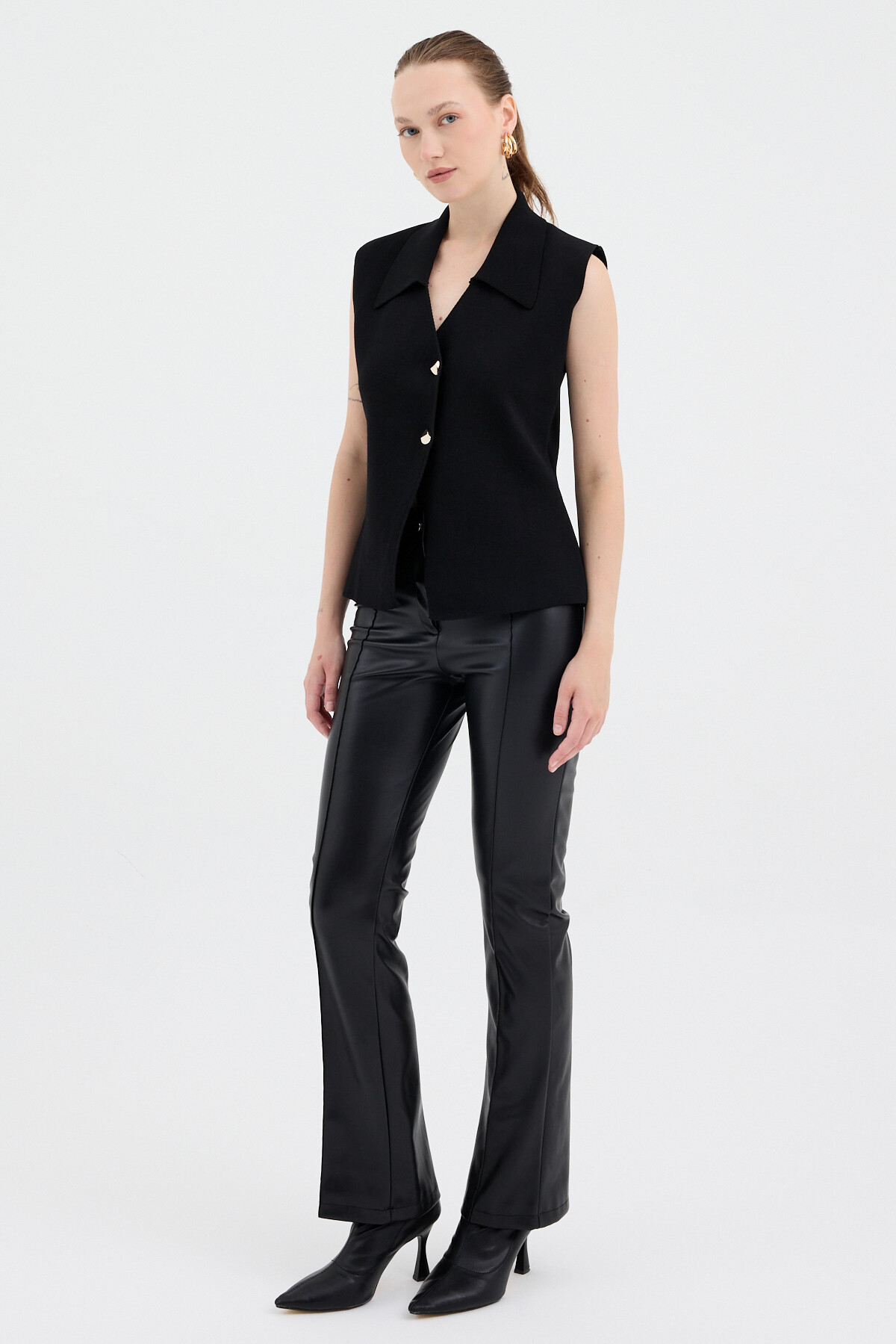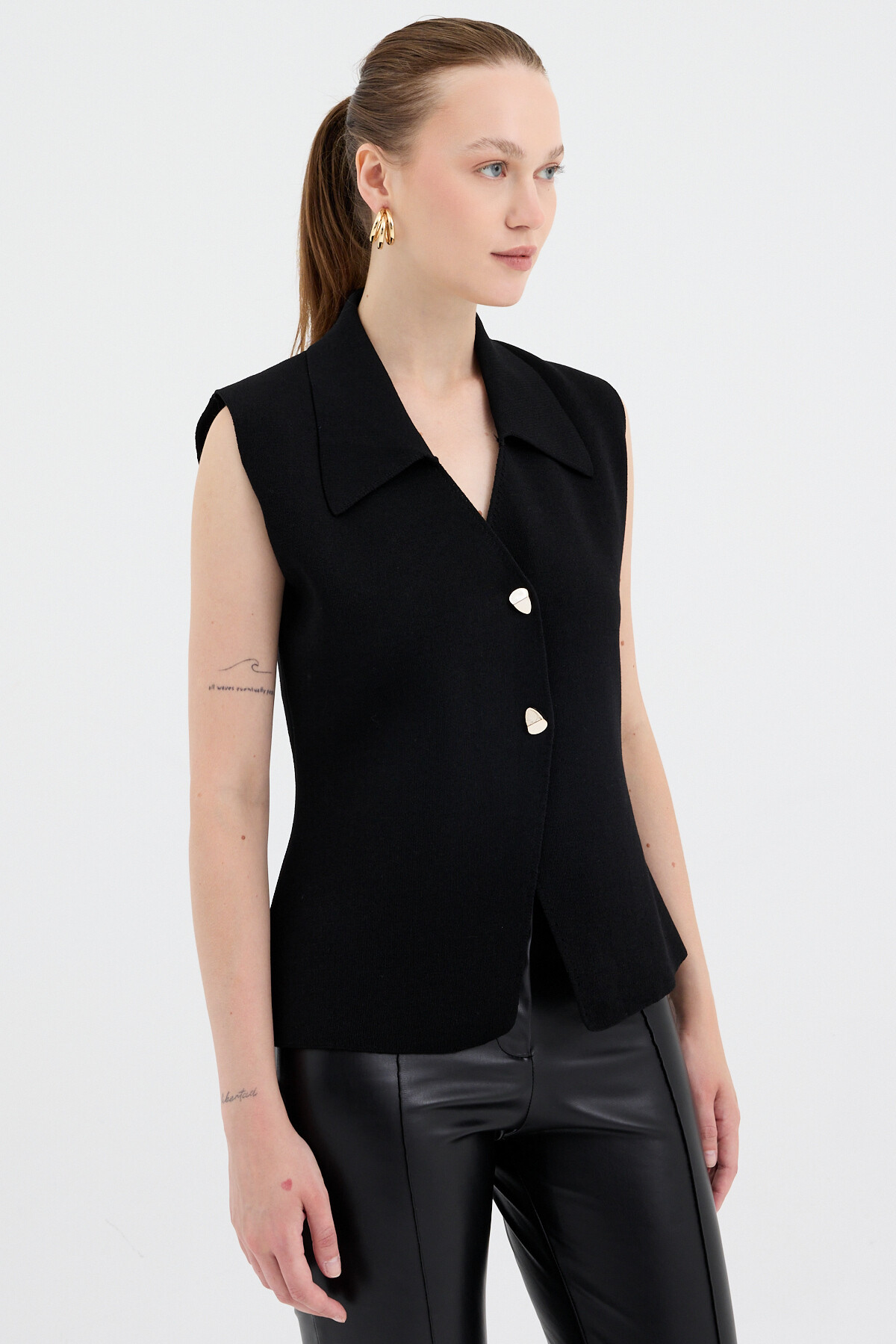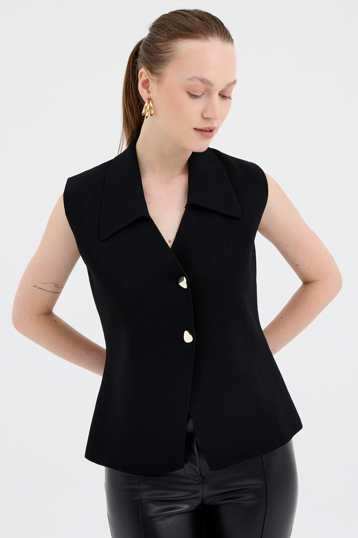 Siyah Yaka Detaylı Düğmeli Triko Kadın Yelek 7355