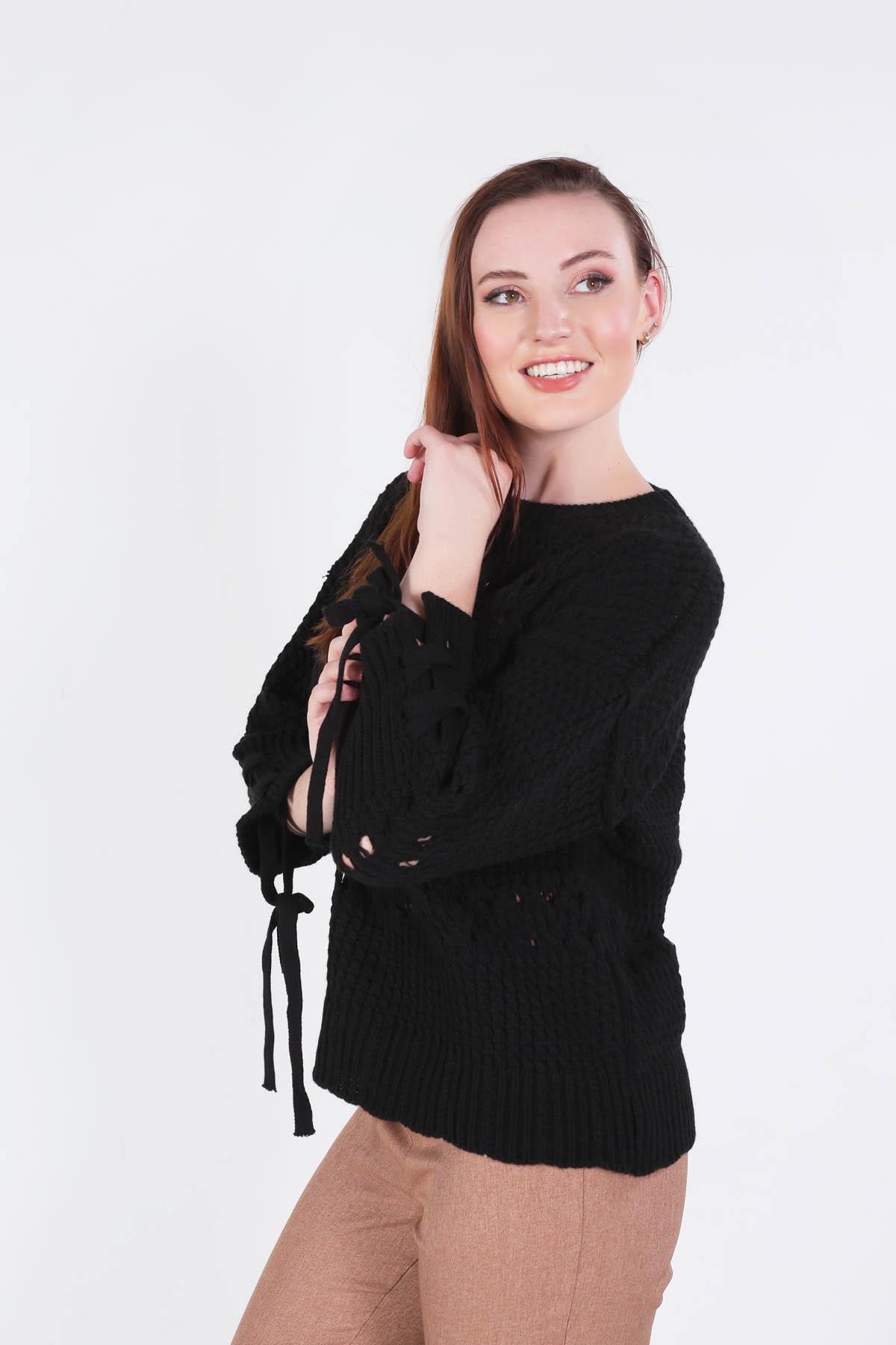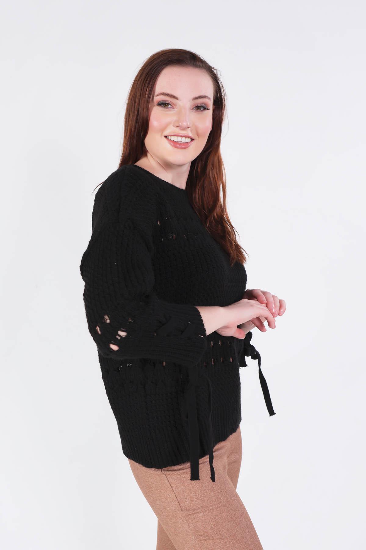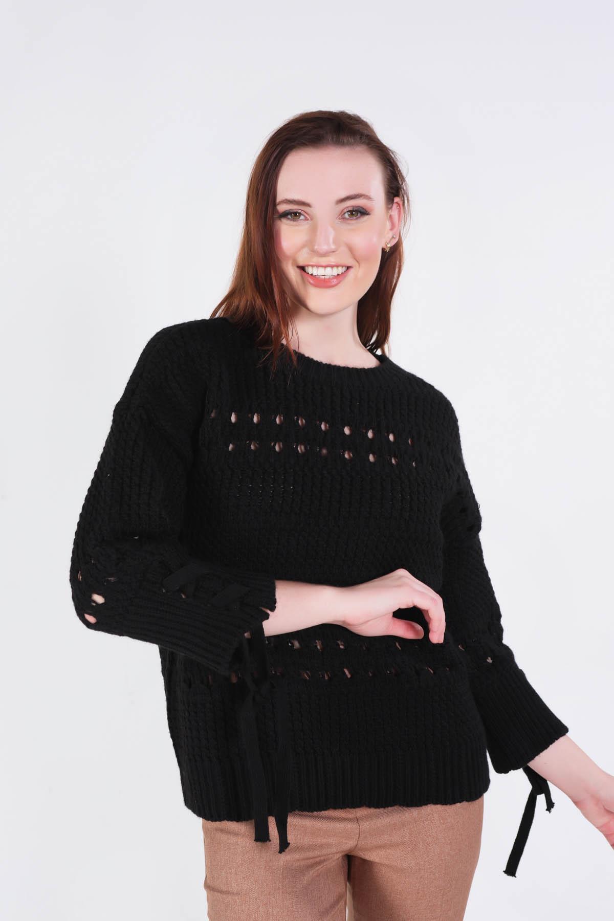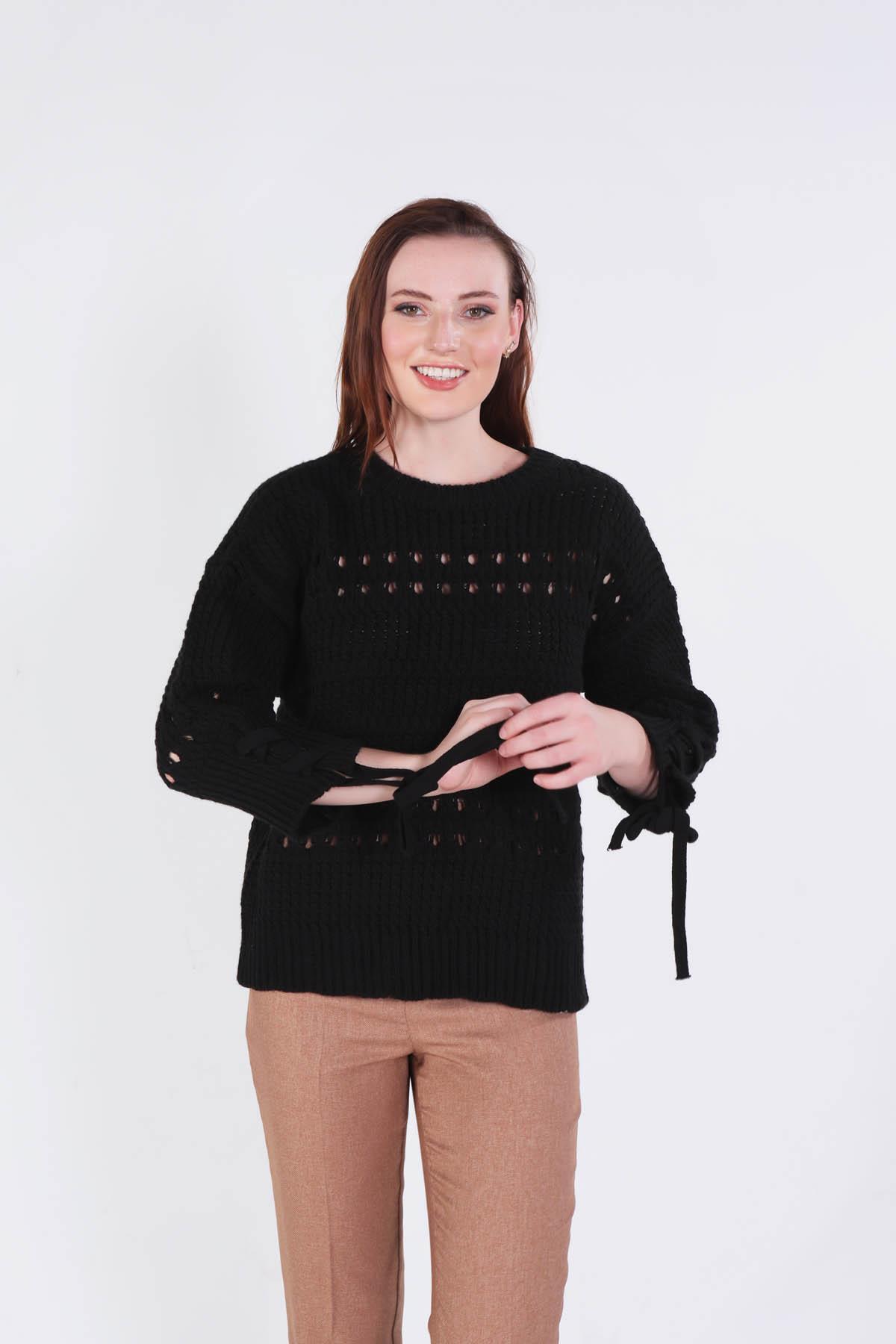 Siyah Kol Bağlama Detay Delikli Kazak 7588