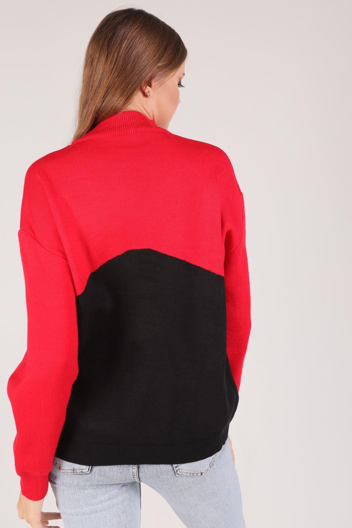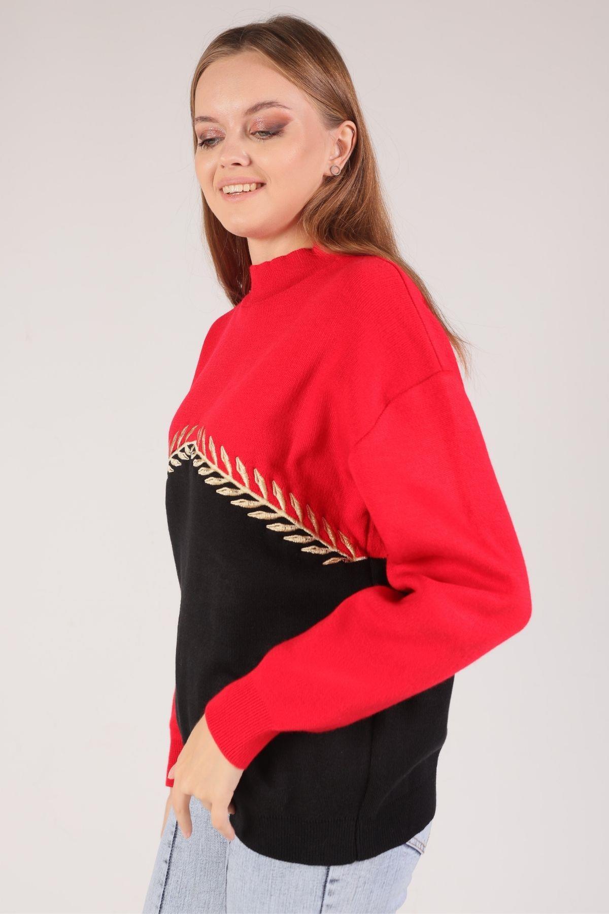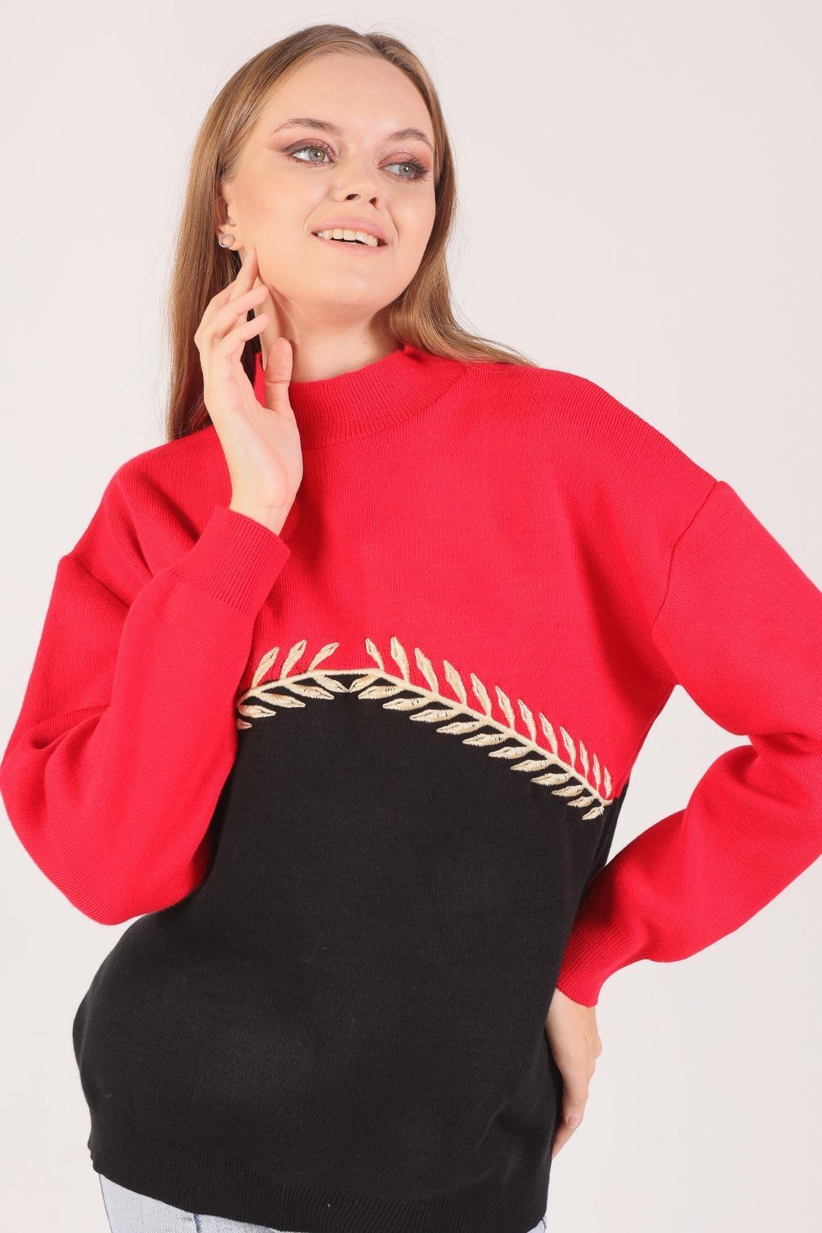 Kırmızı Balıkçı Yaka Nakışlı Kazak 7592