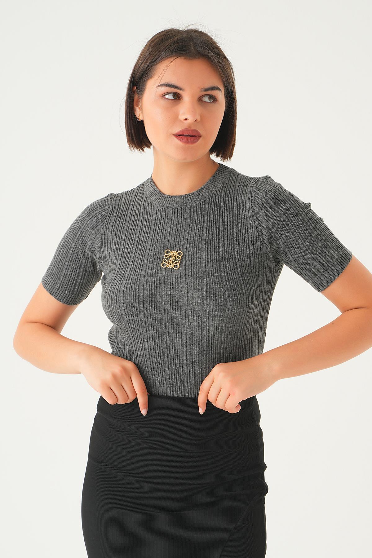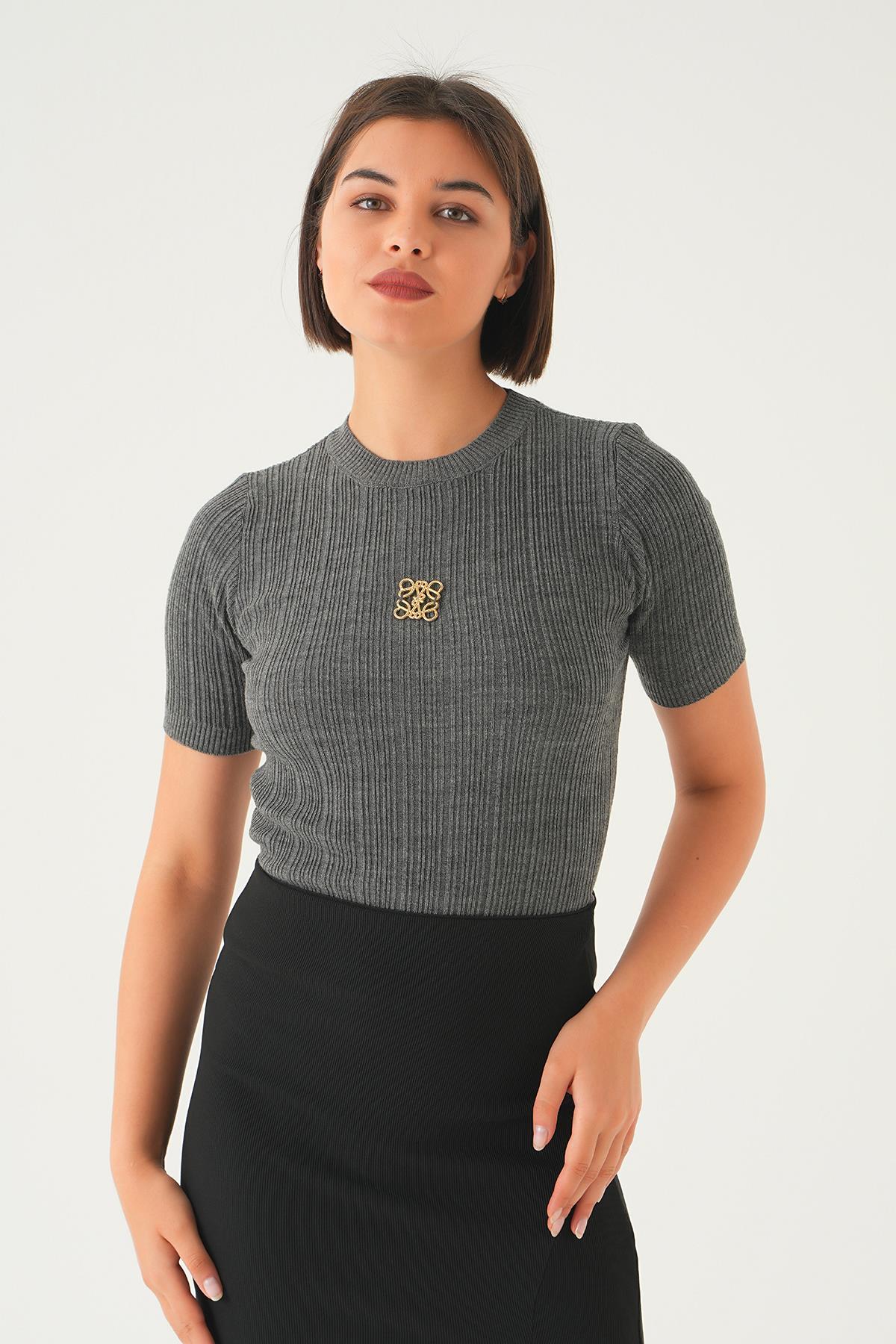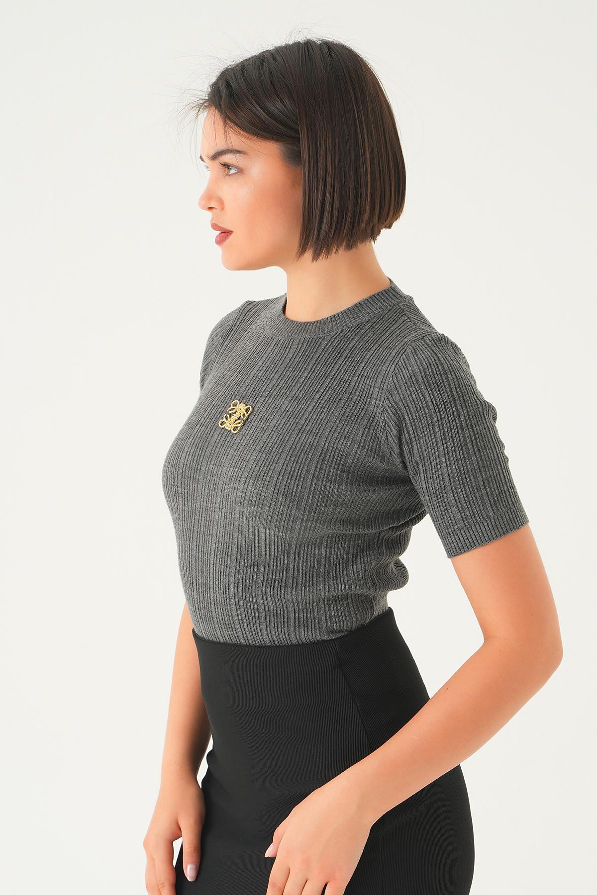 Antrasit Nakış Detay Kısa Kol Tişört 7744