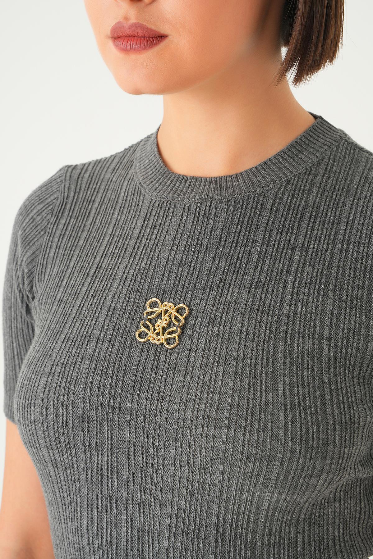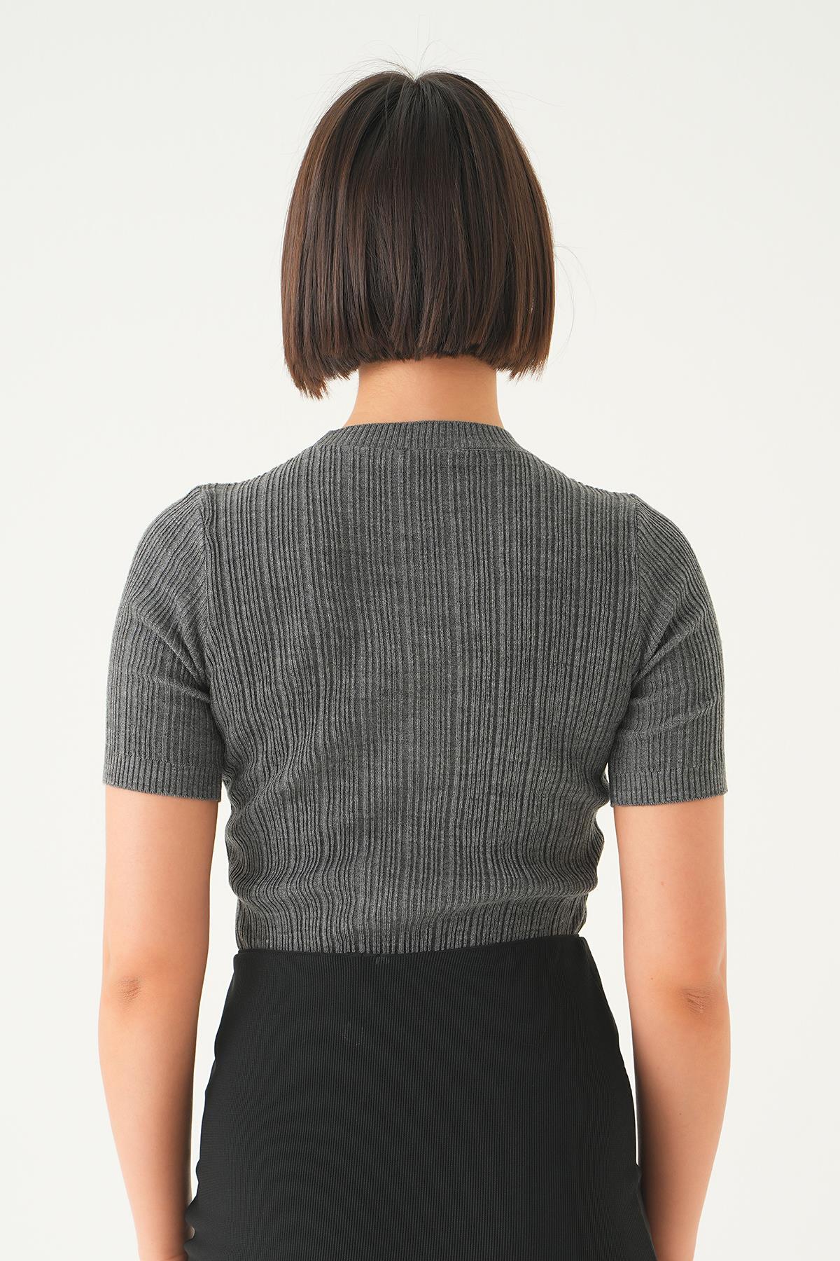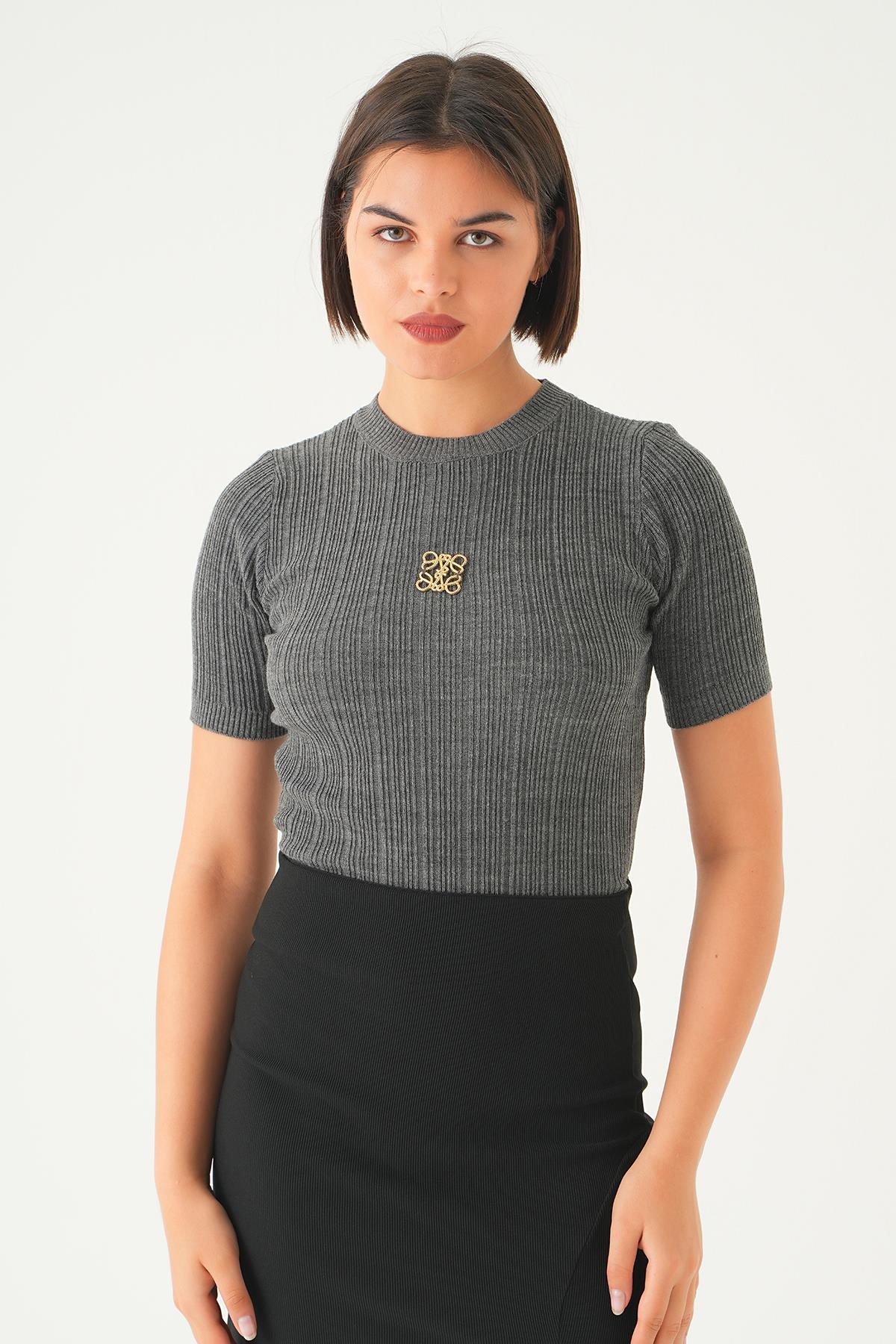 Antrasit Nakış Detay Kısa Kol Tişört 7744