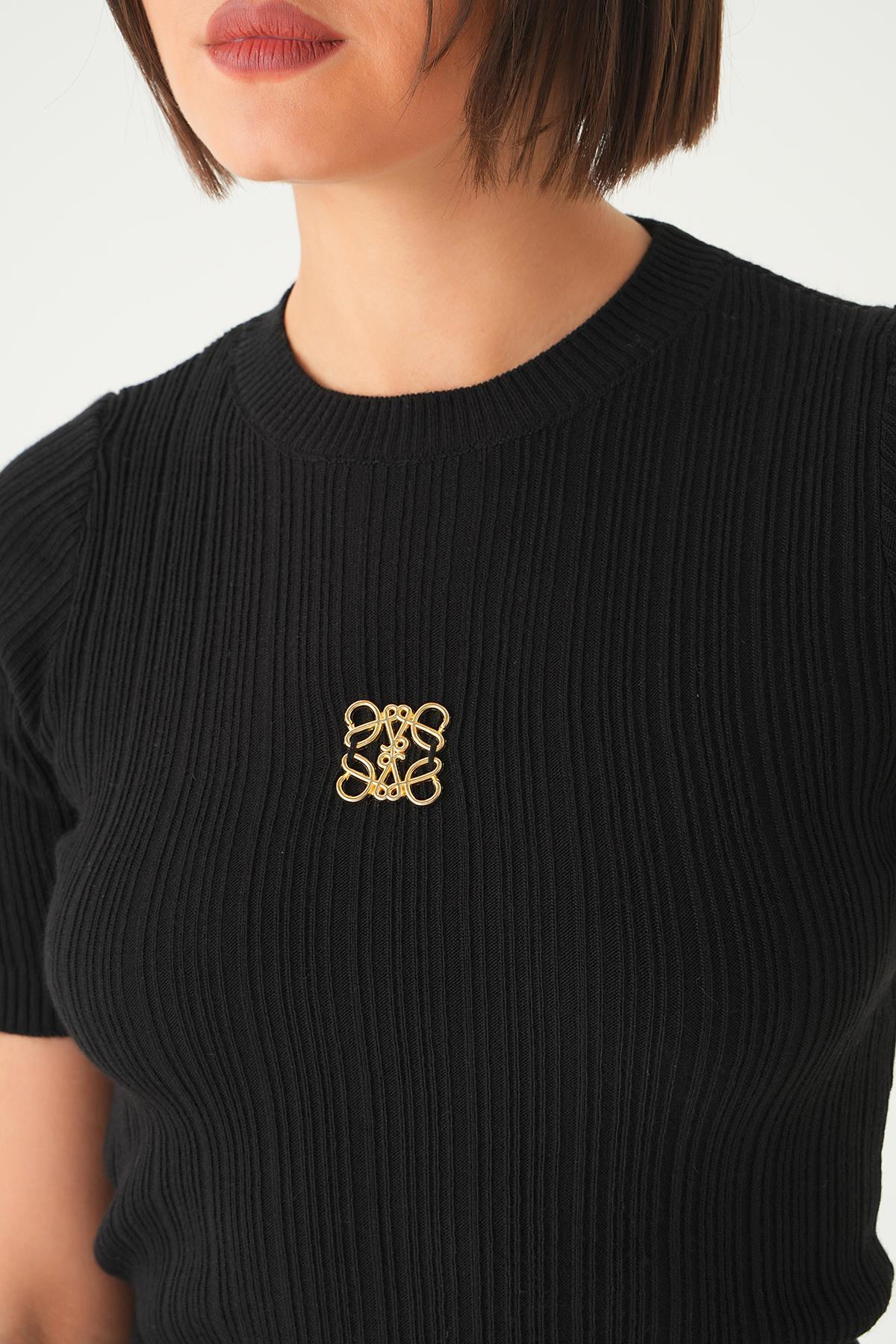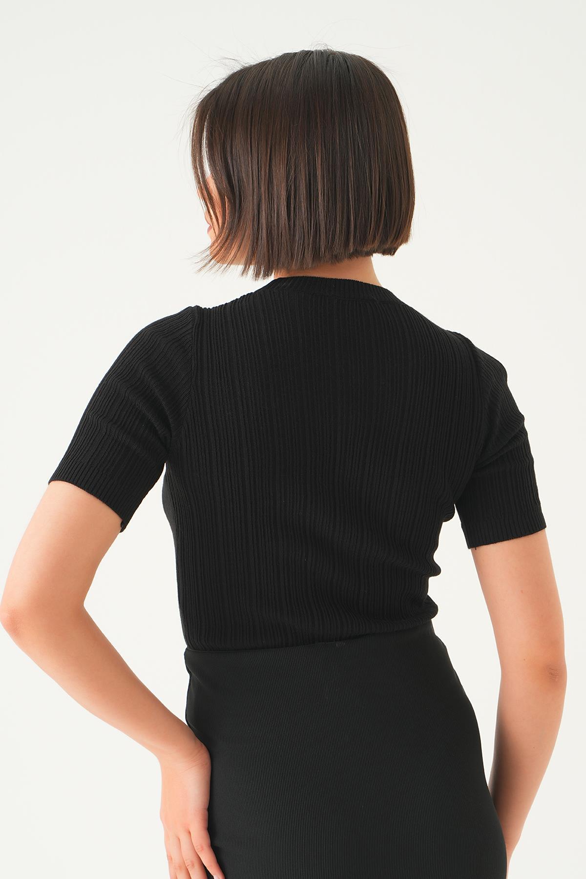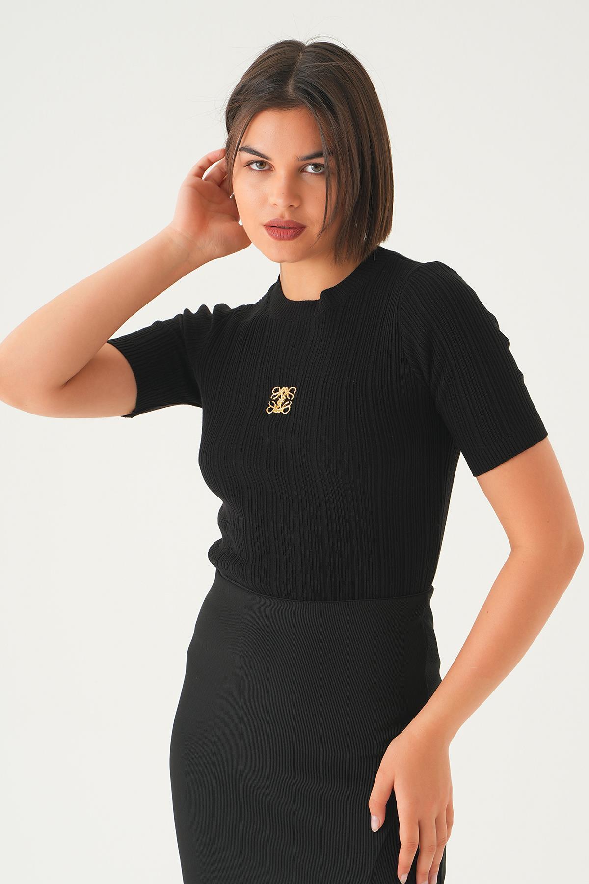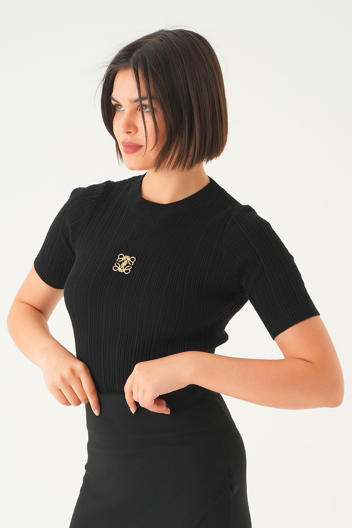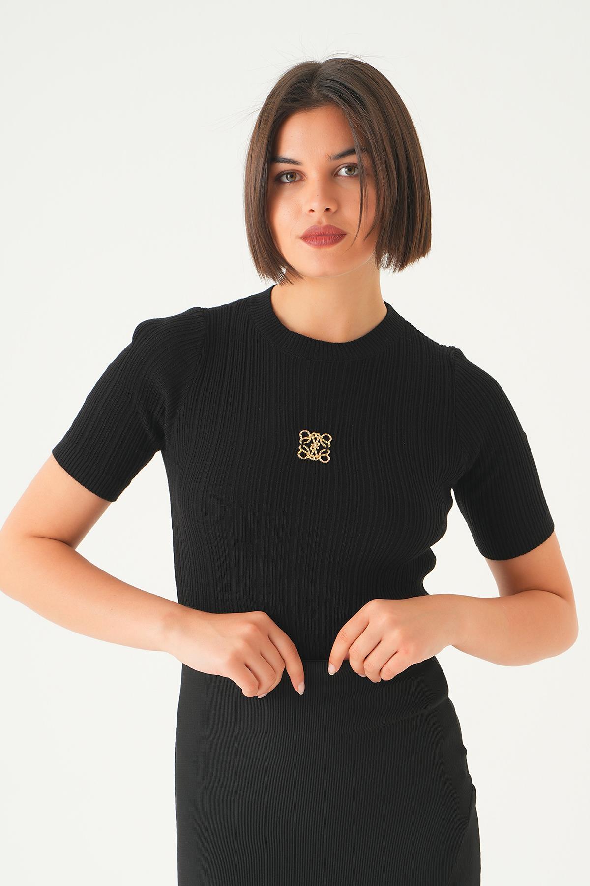7744 Nakış Detay Kısa Kol Tişört Siyah