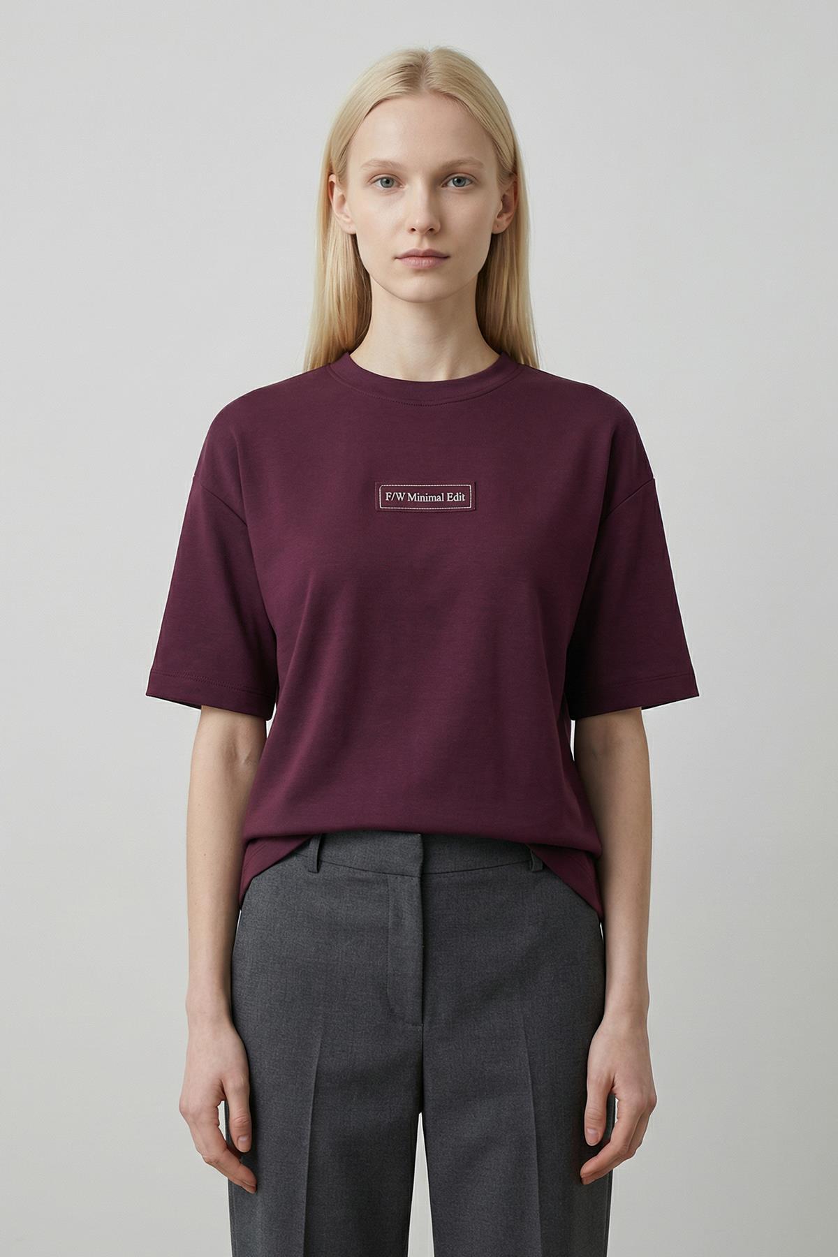 Bordo Yazı Nakışlı Kısa Kol Tişört 7876