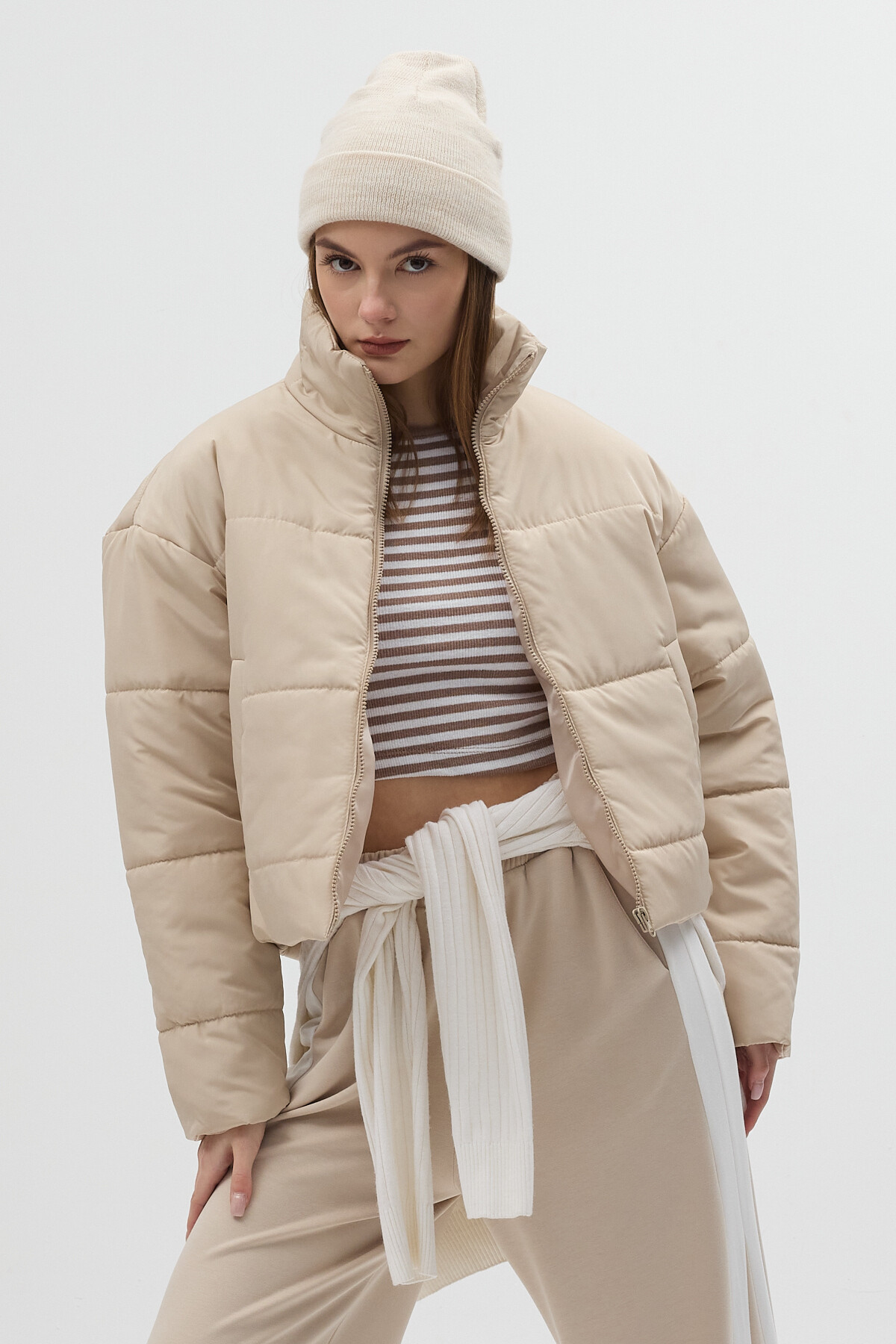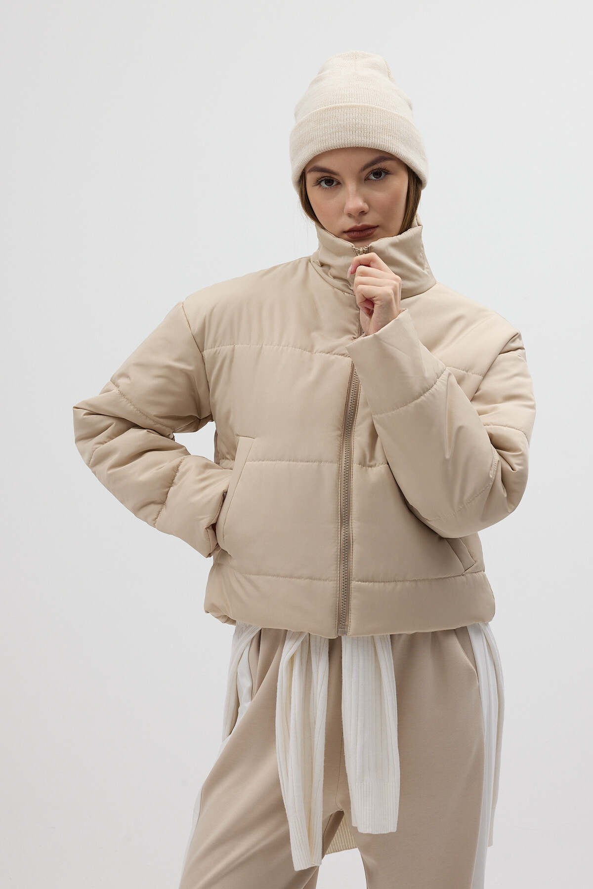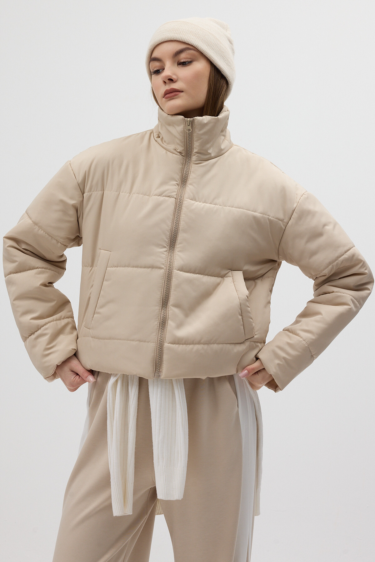 Bej Dik Yaka Fermuarlı Kısa Şişme Kadın Mont 8000