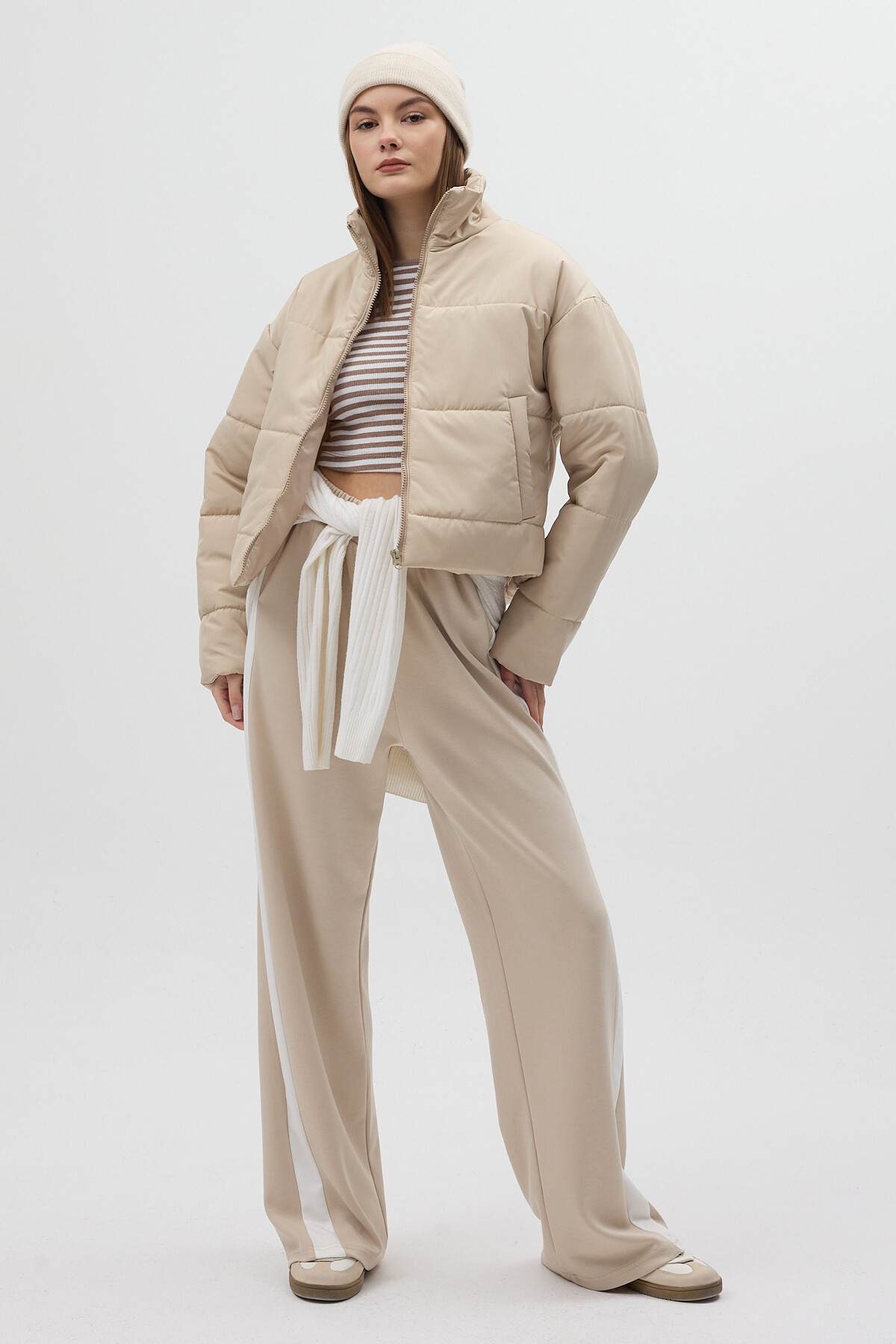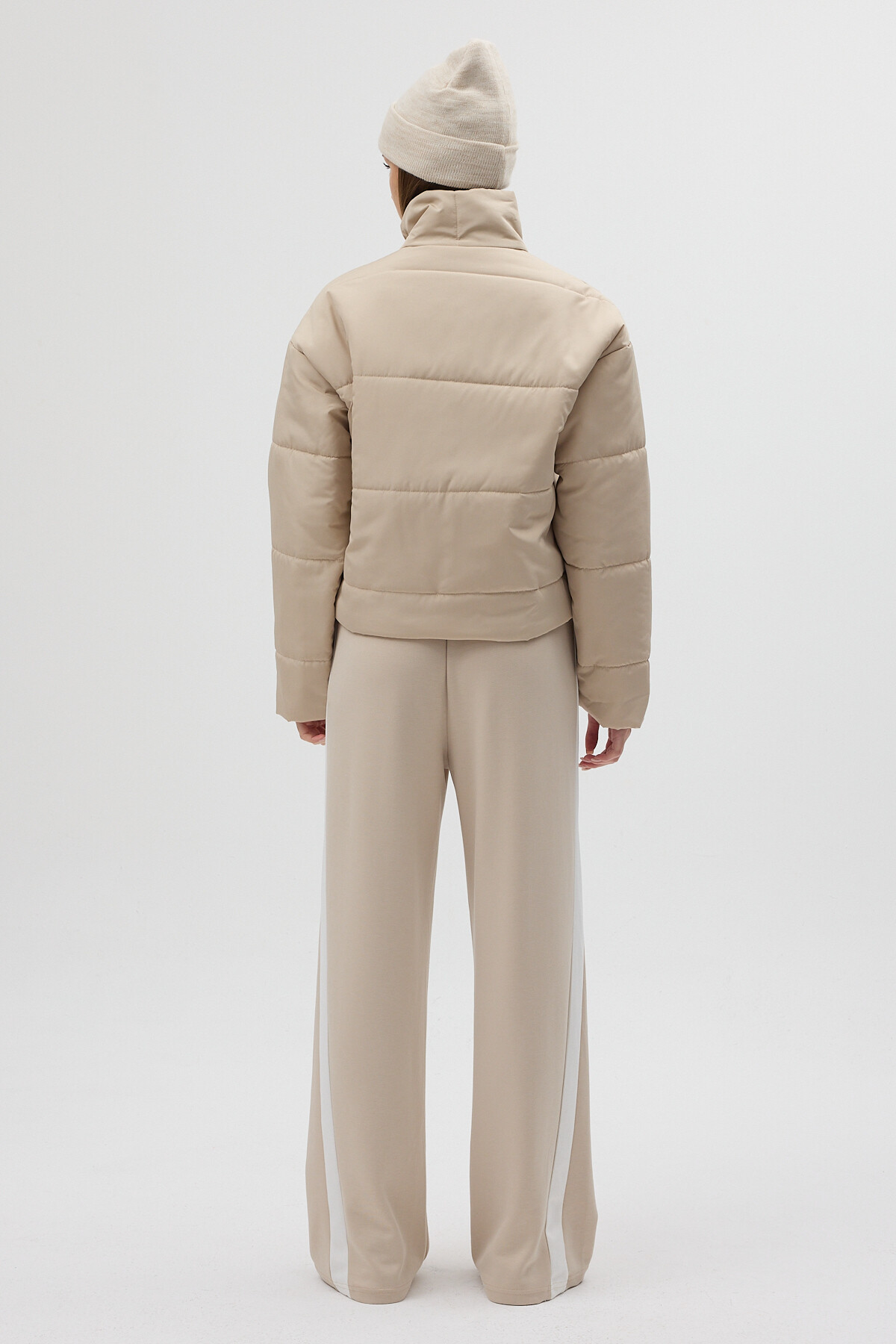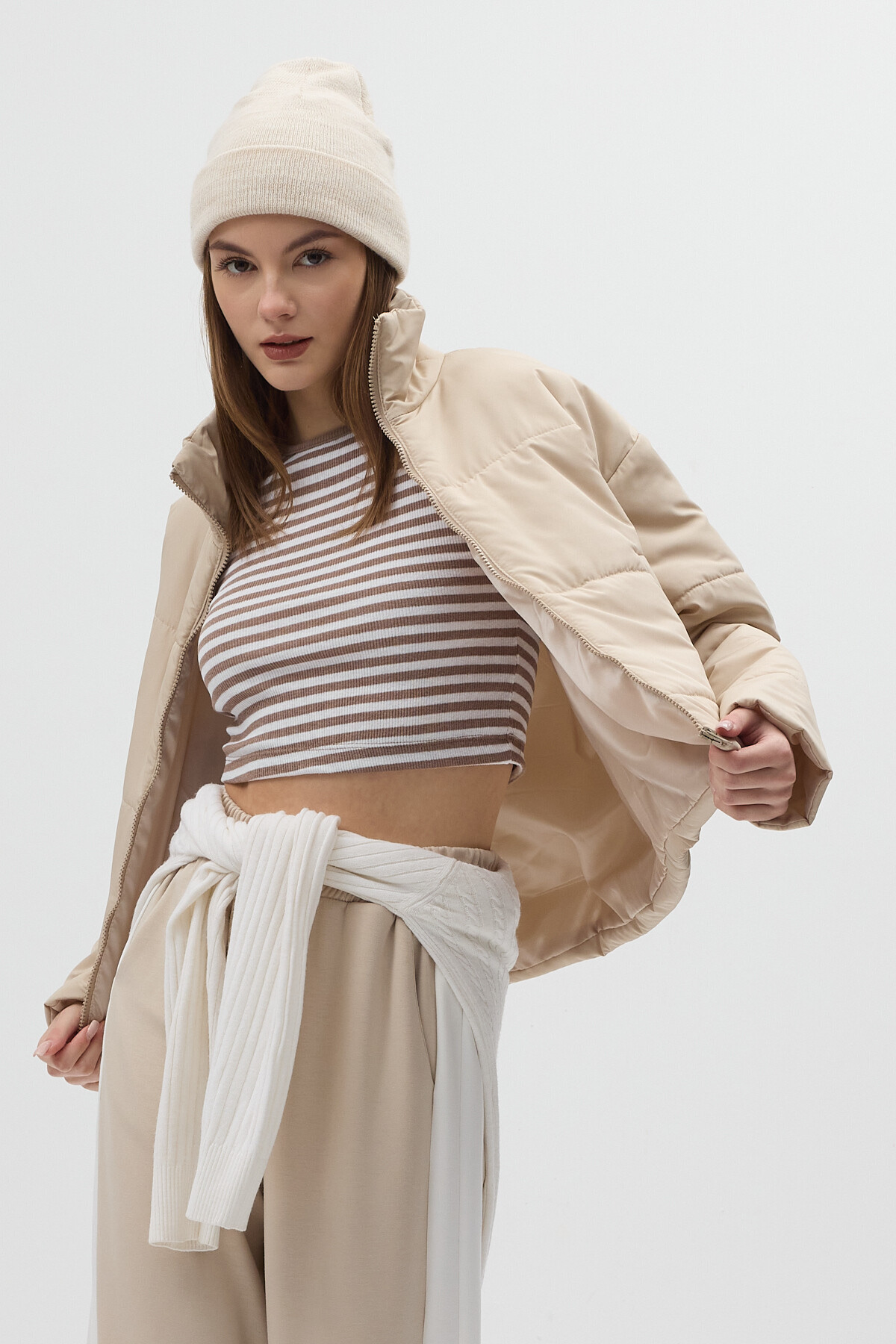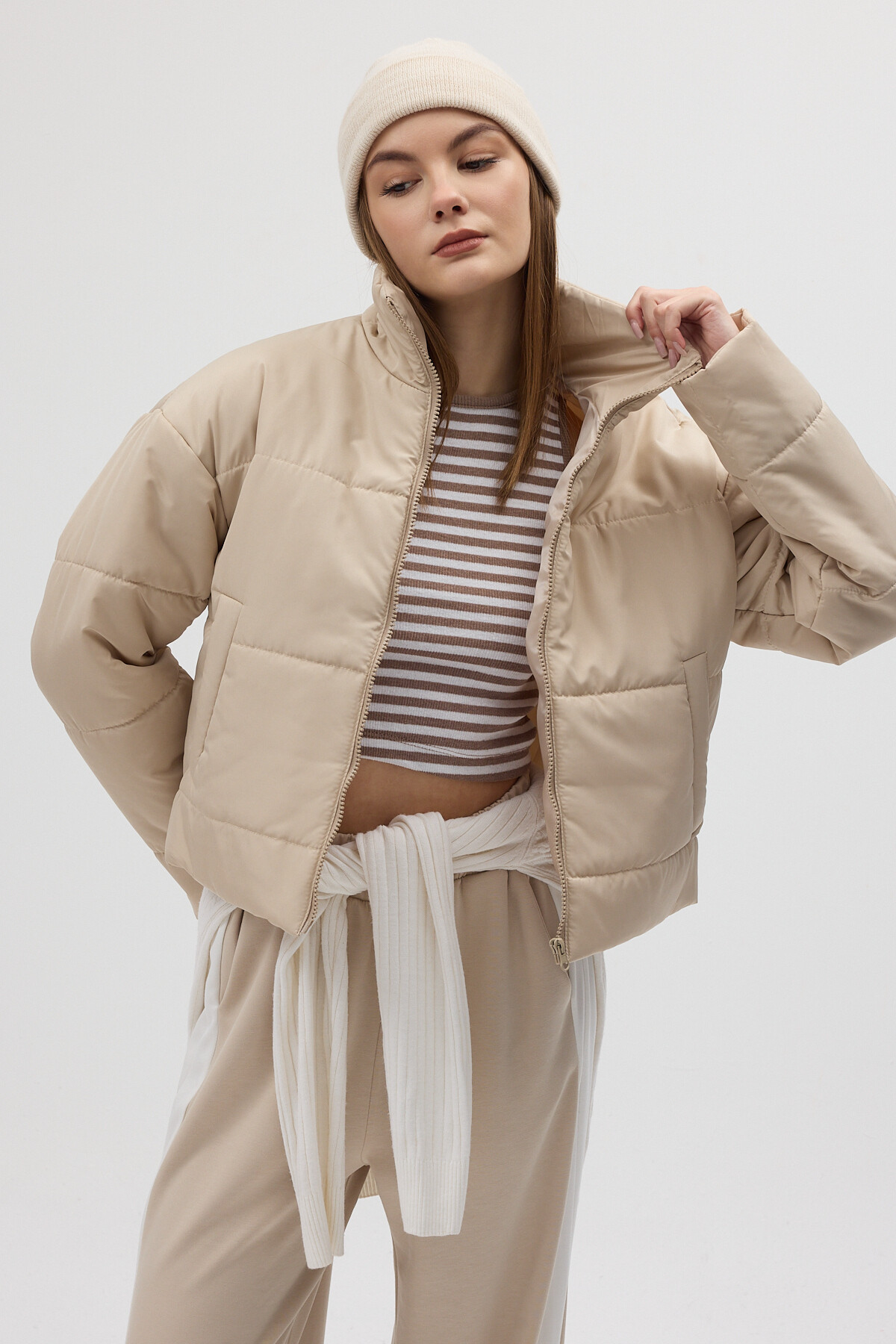 Bej Dik Yaka Fermuarlı Kısa Şişme Kadın Mont 8000