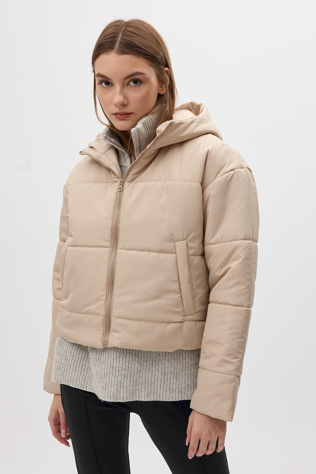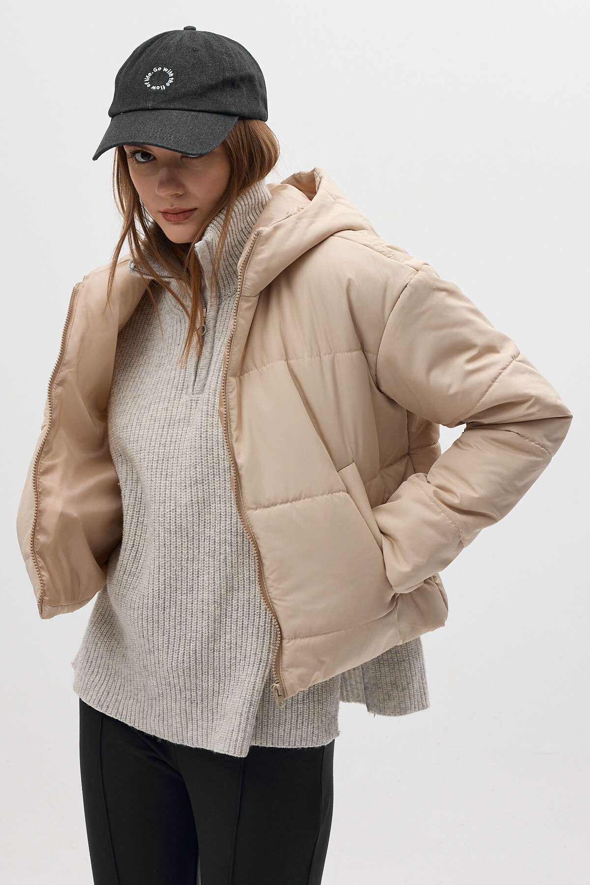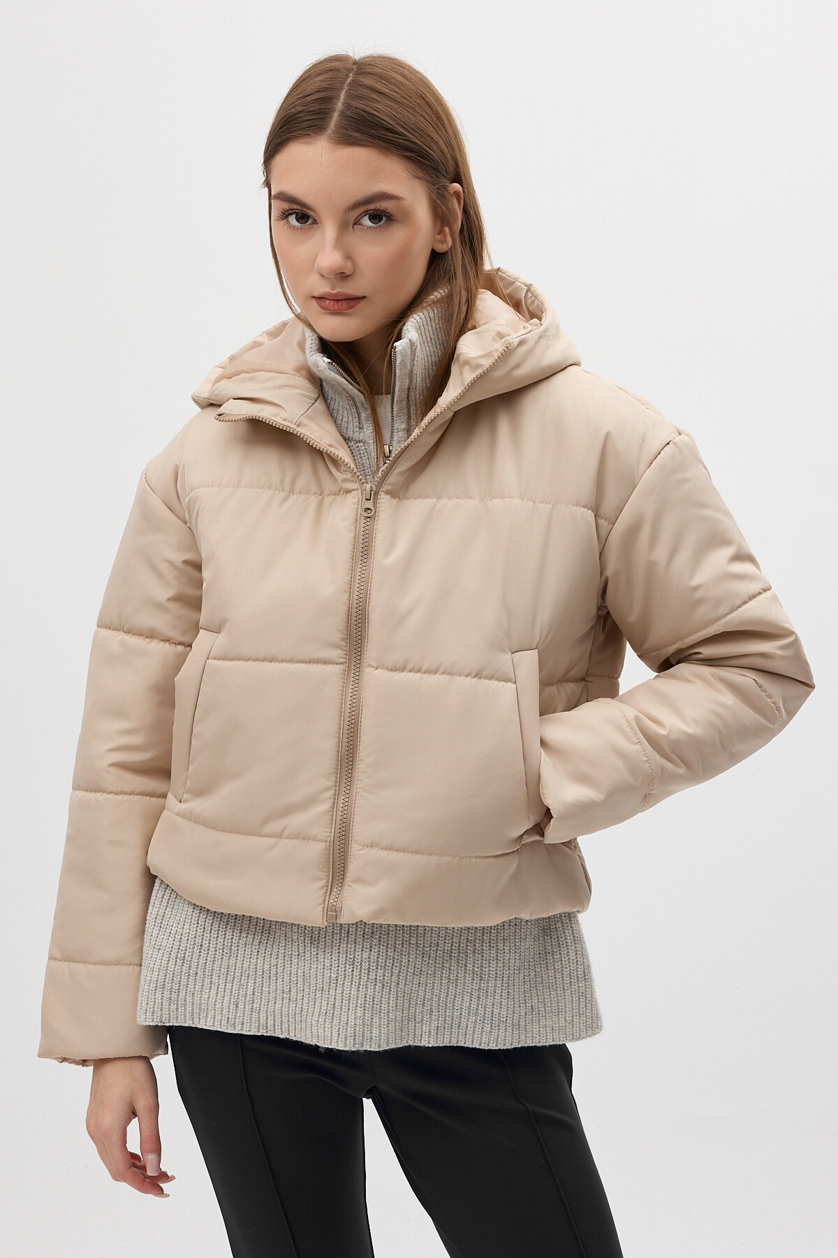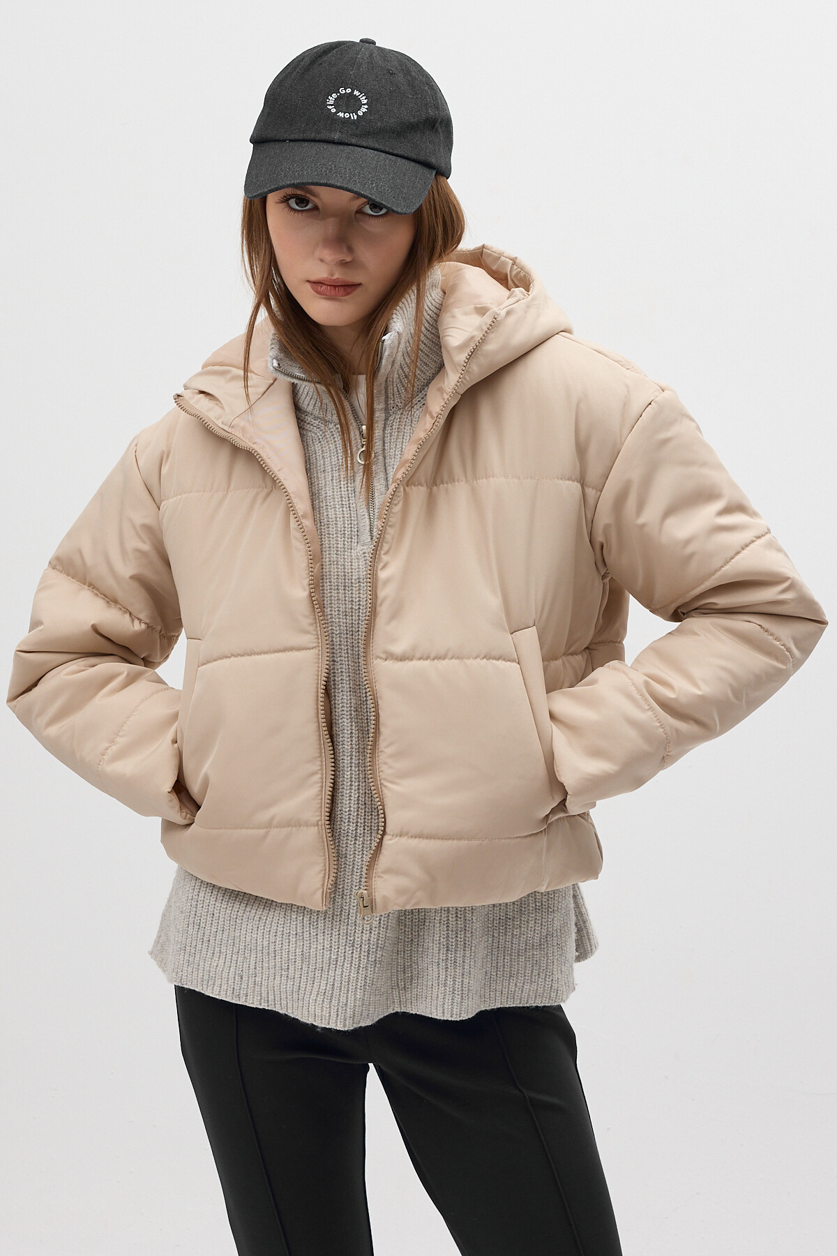 Bej Kapüşonlu Cepli Kısa Kapitone Şişme Kadın Mont 8010