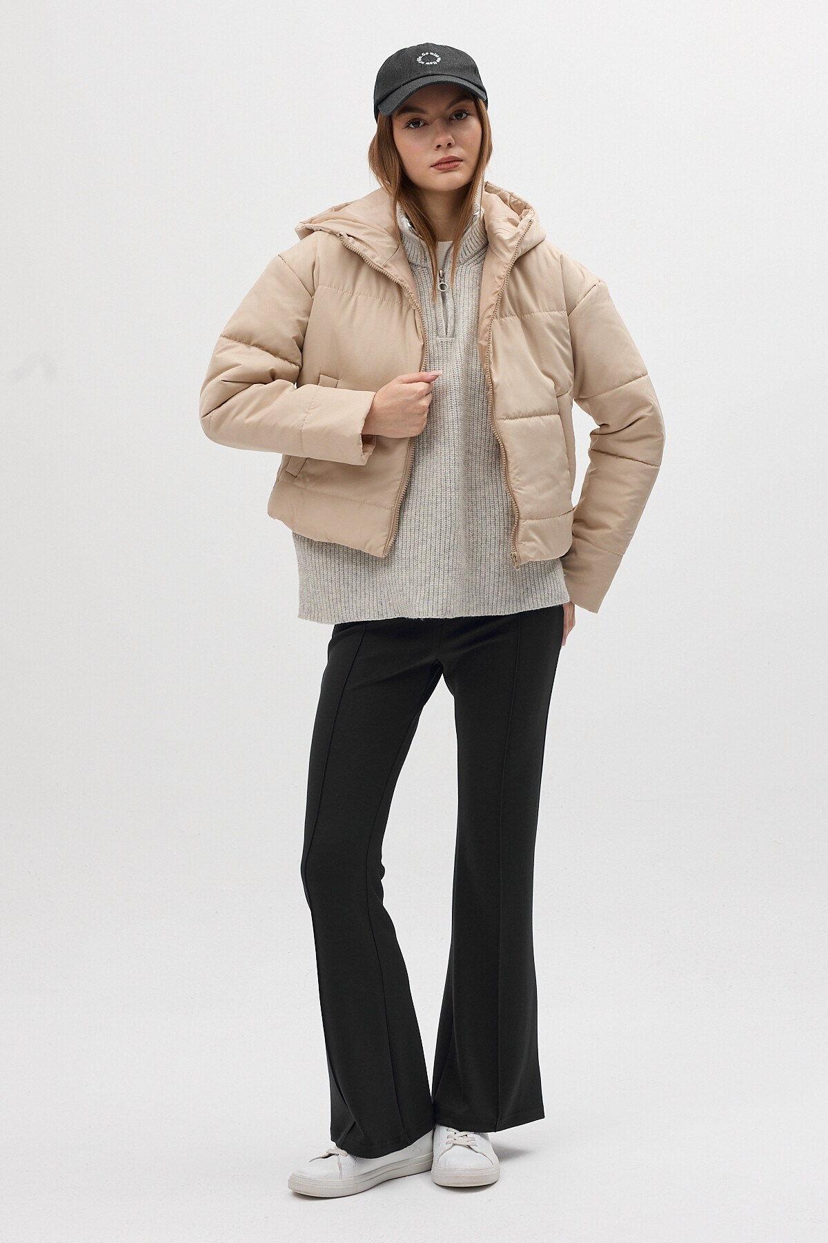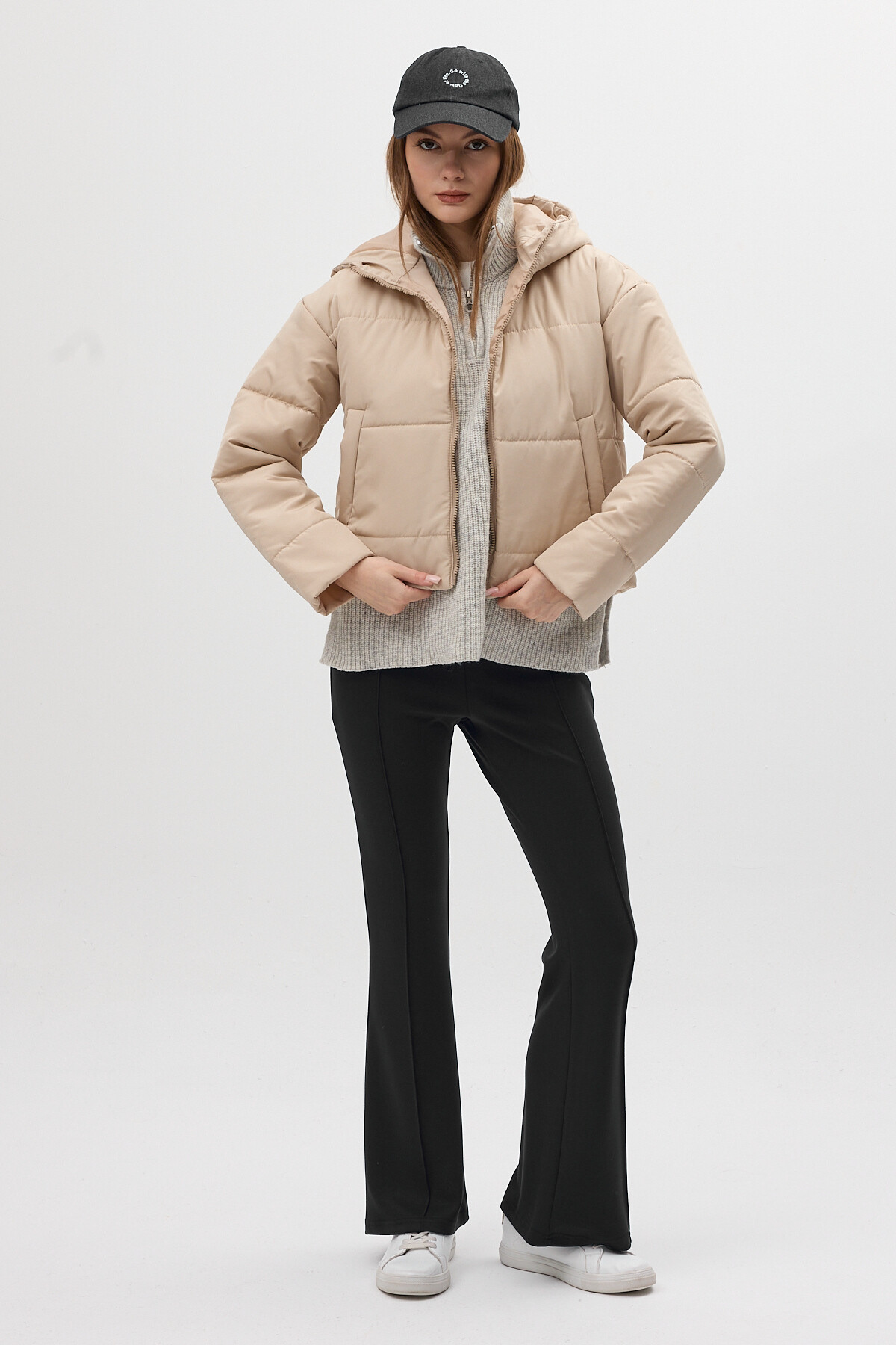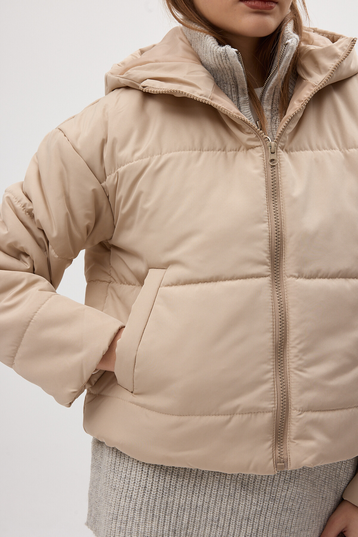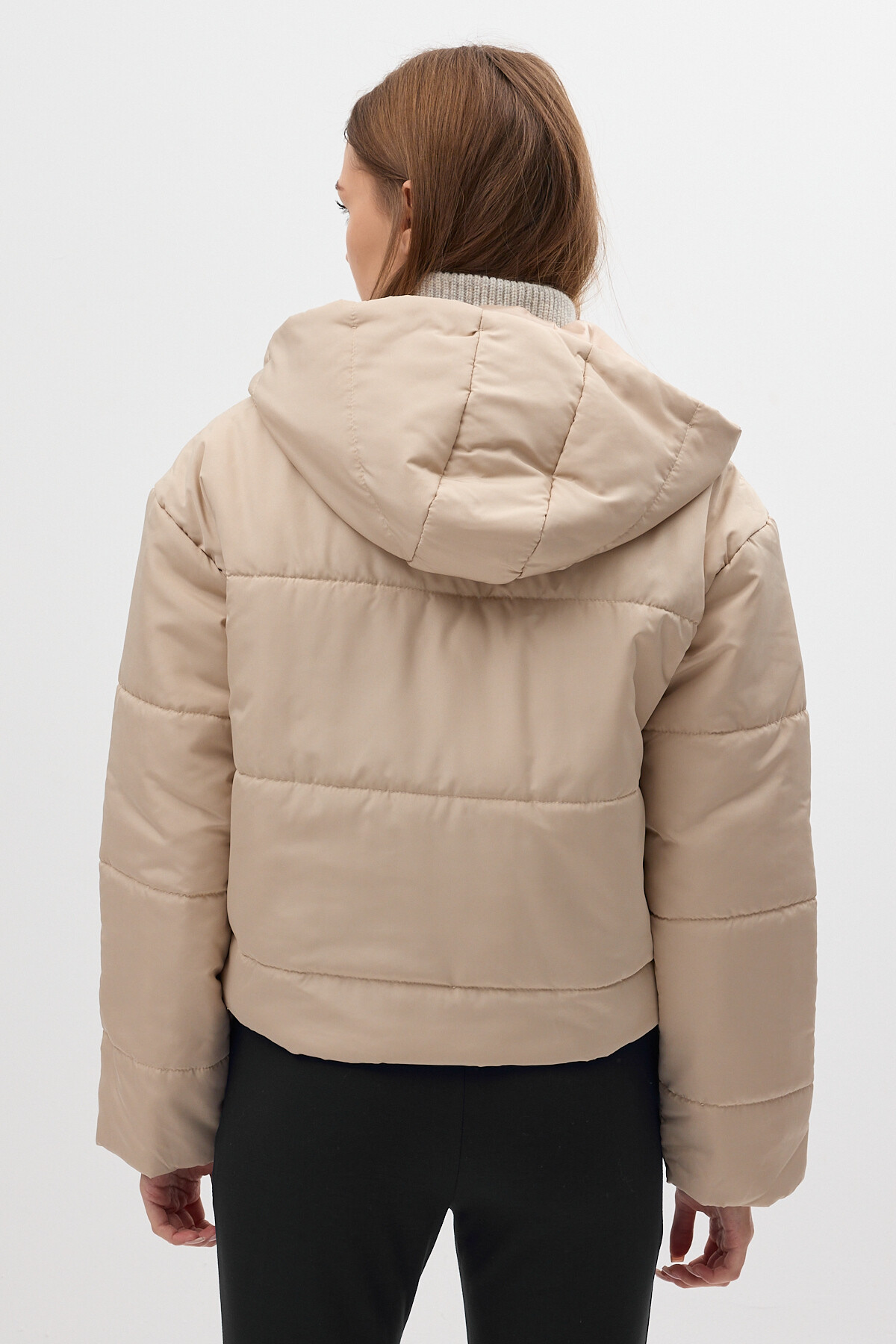 Bej Kapüşonlu Cepli Kısa Kapitone Şişme Kadın Mont 8010