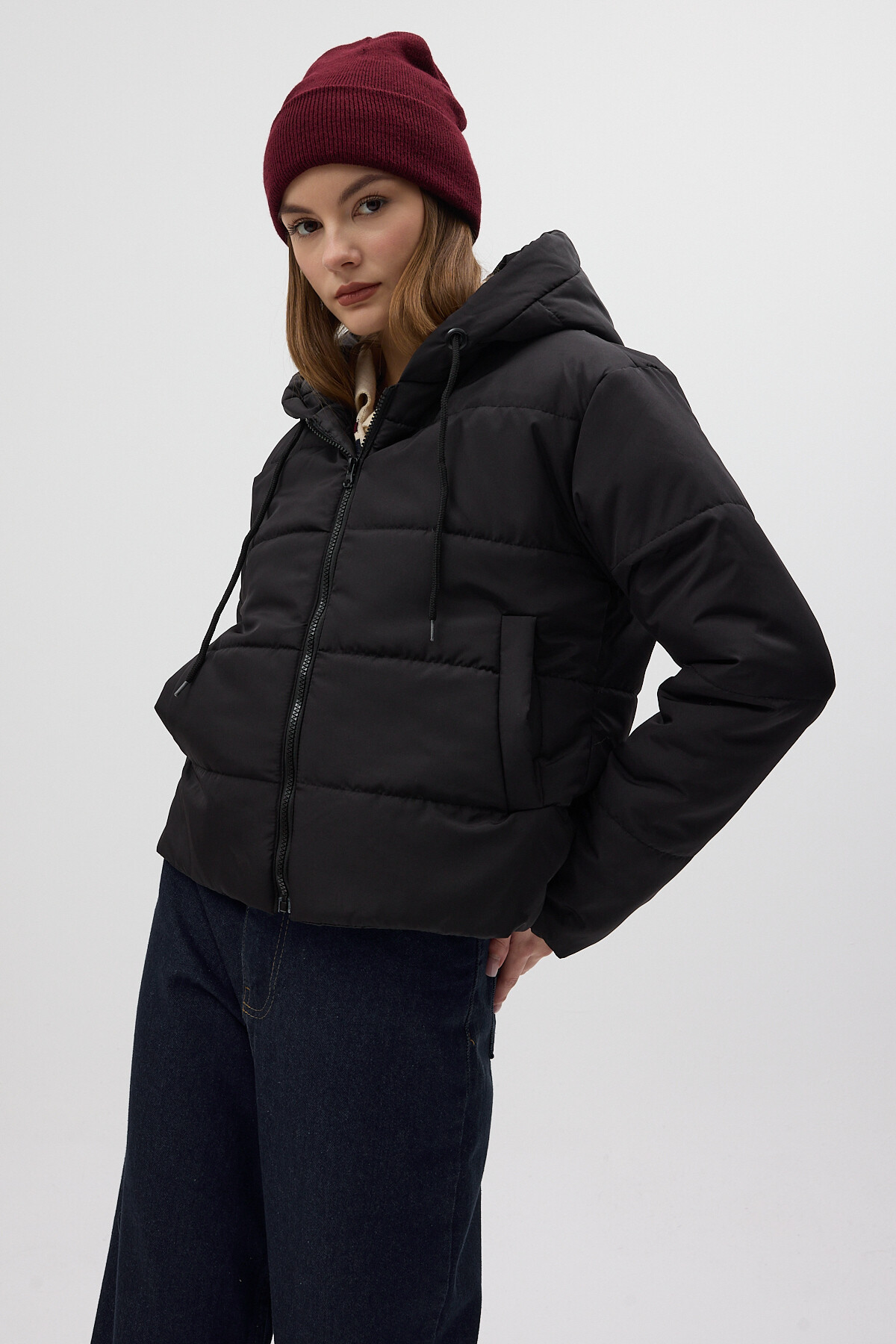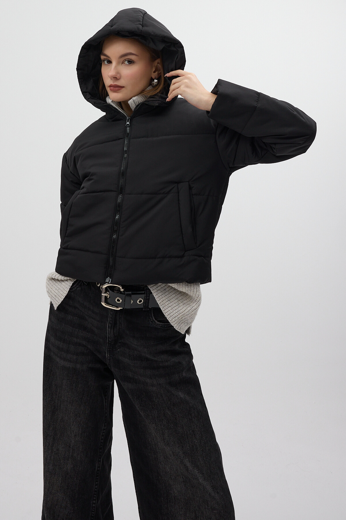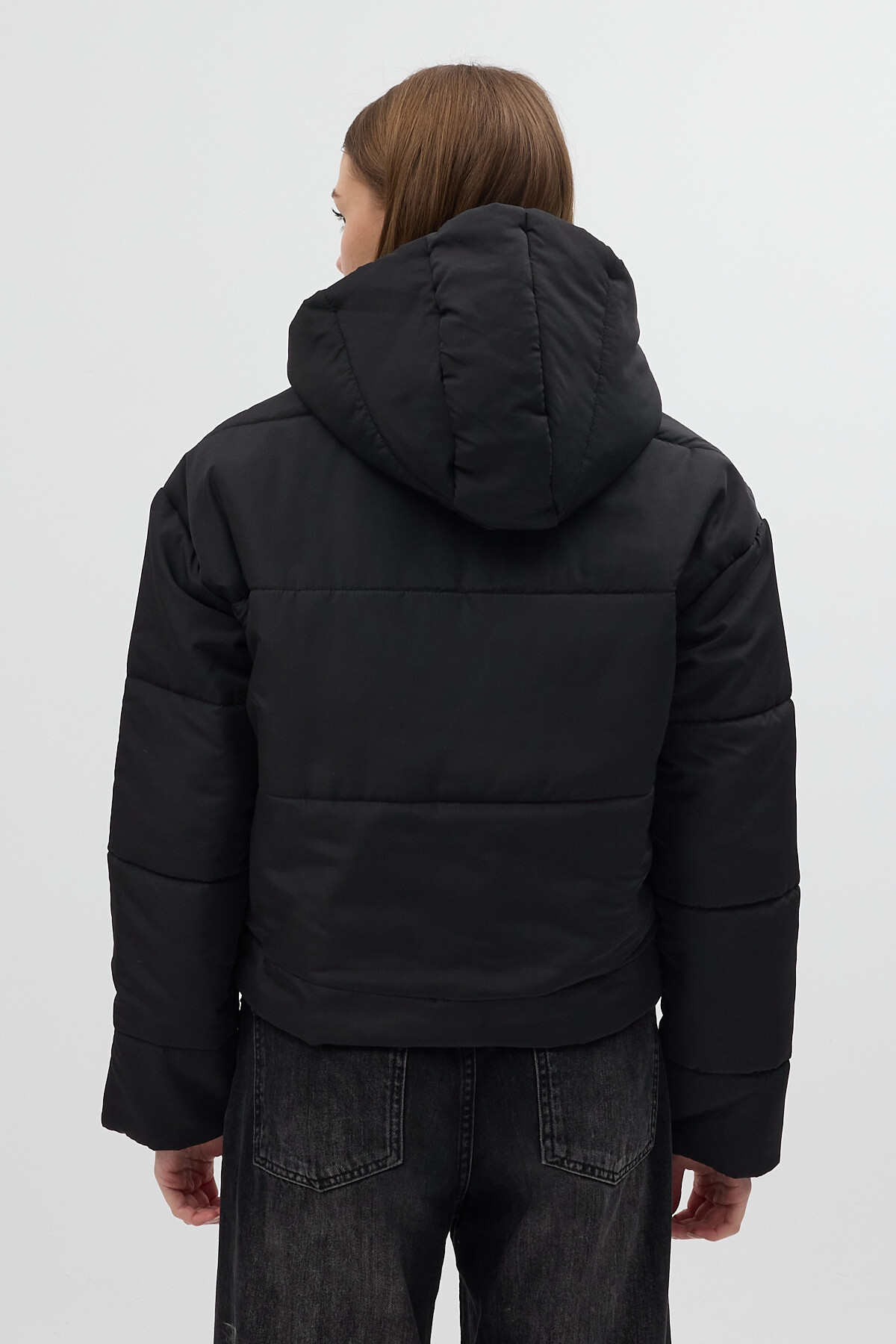Siyah Kapüşonlu Cepli Kısa Şişme Kadın Mont 8020
