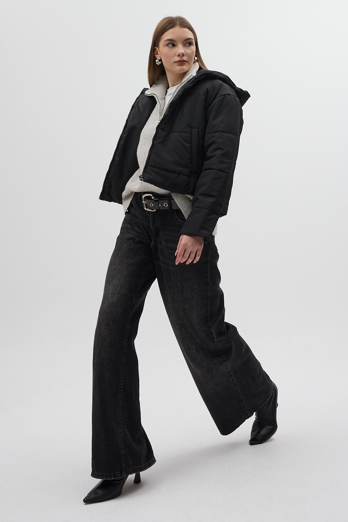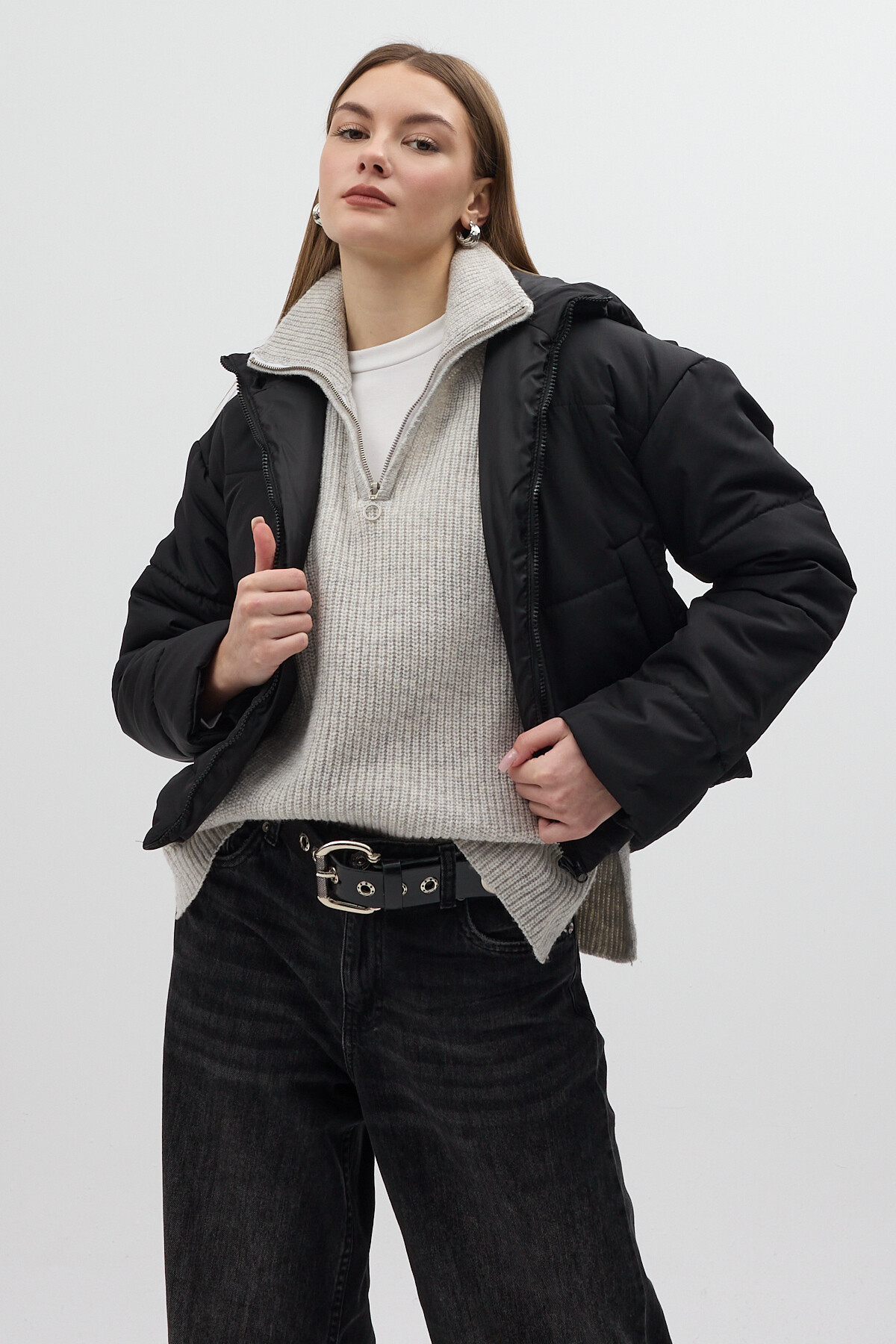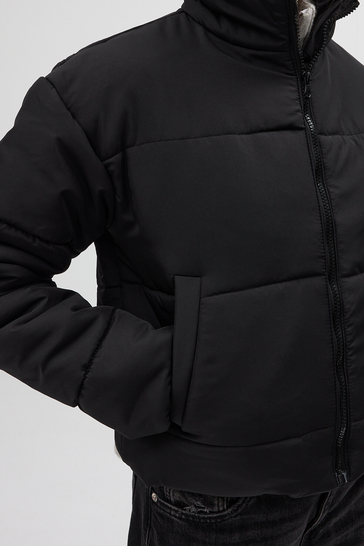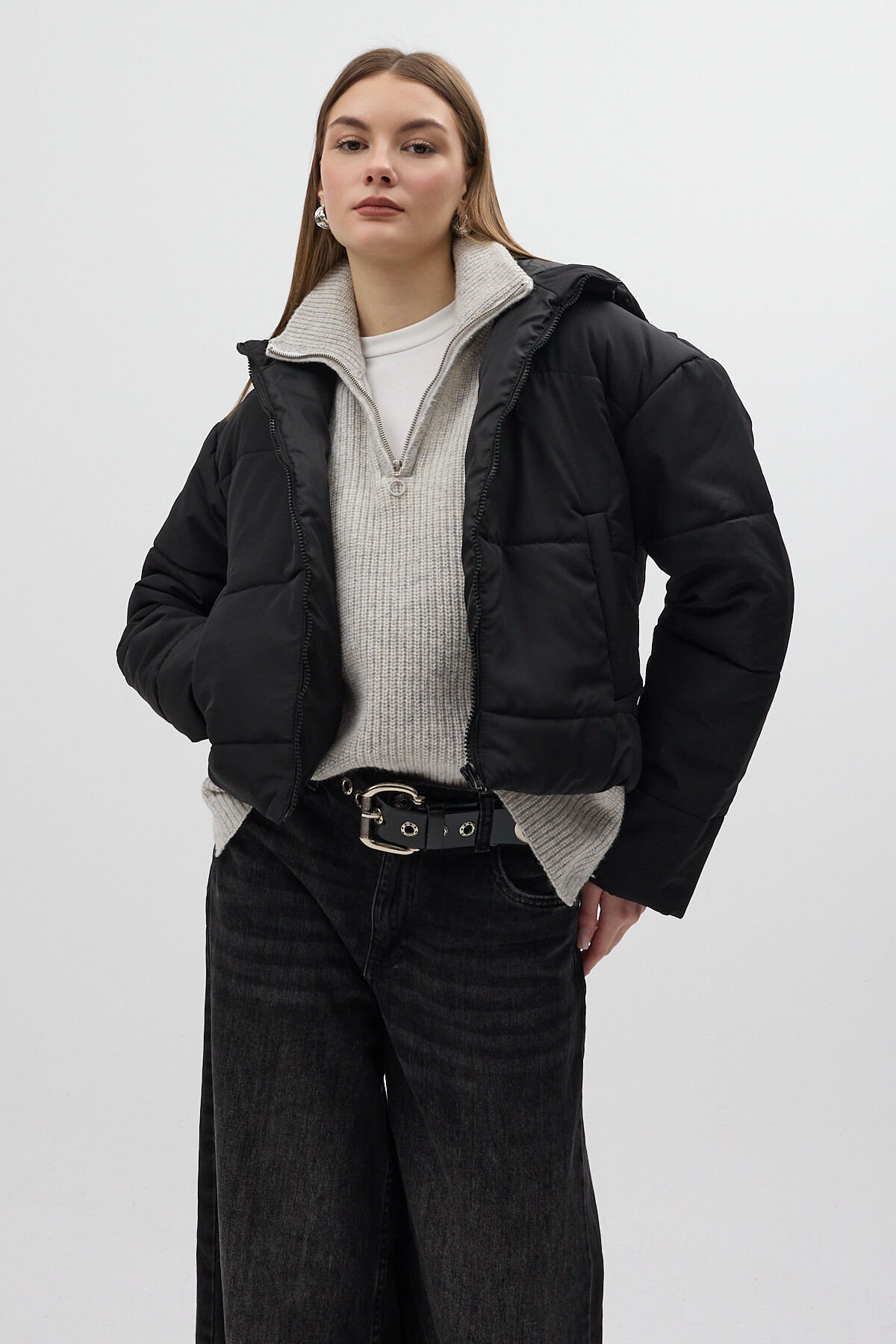 Siyah Kapüşonlu Cepli Kısa Şişme Kadın Mont 8020