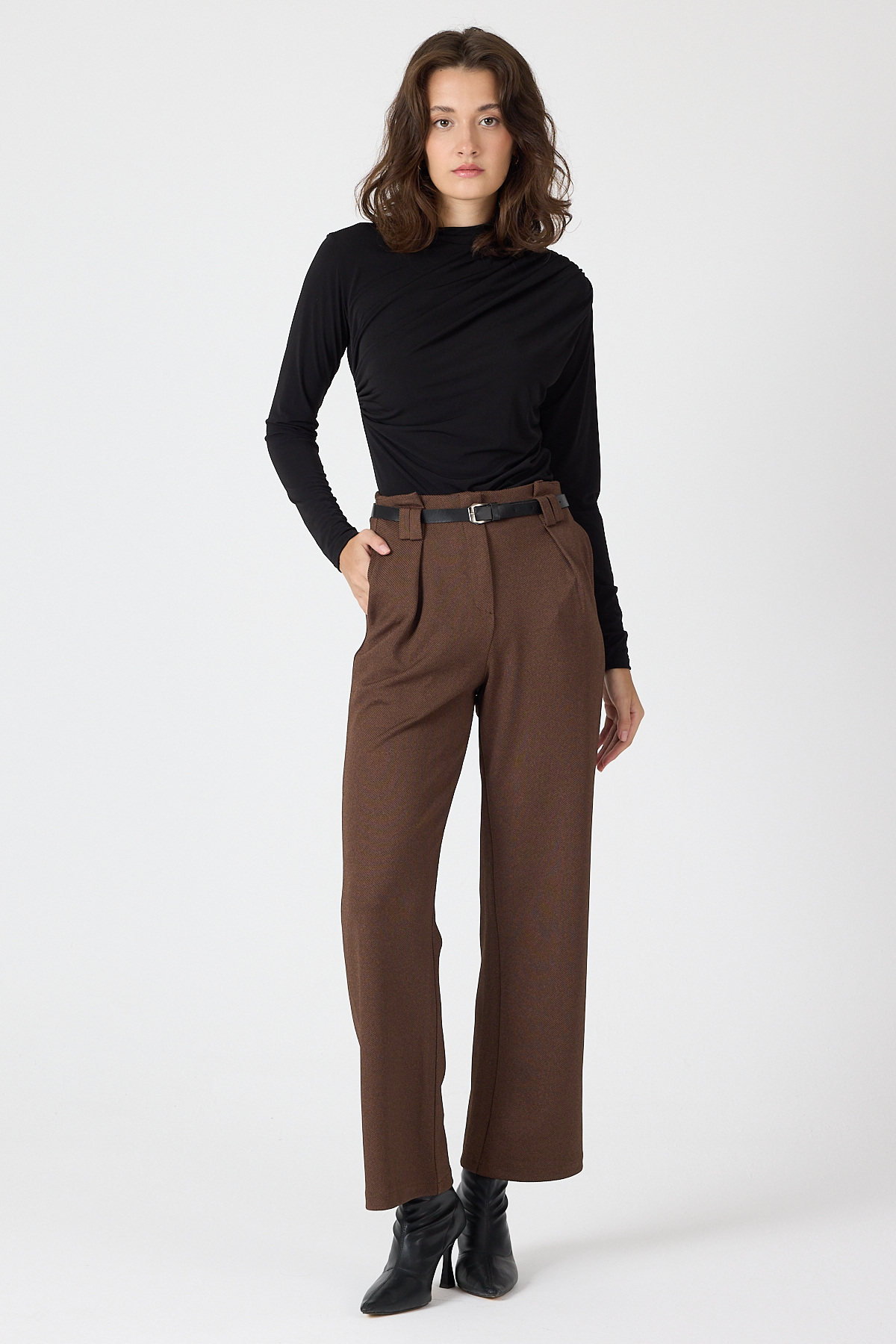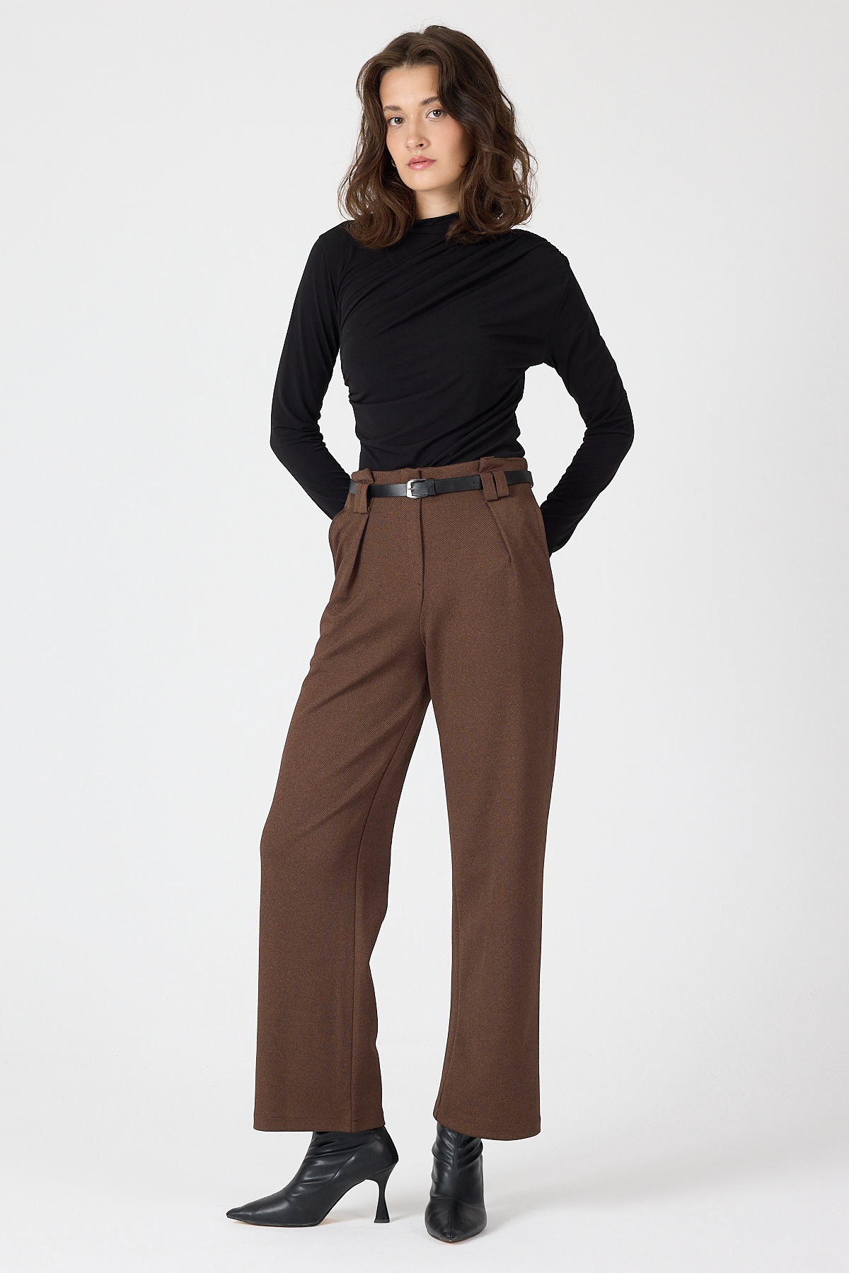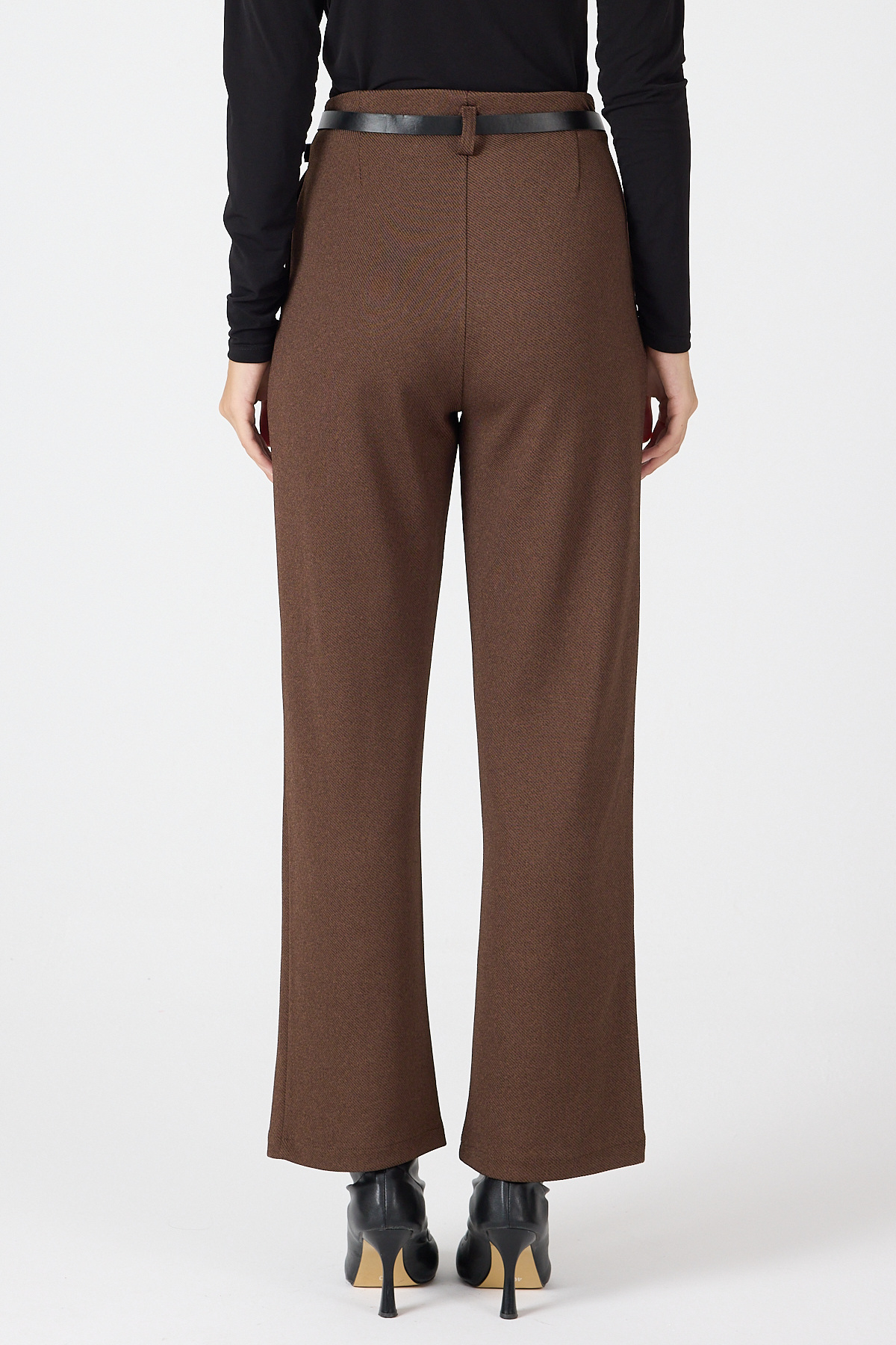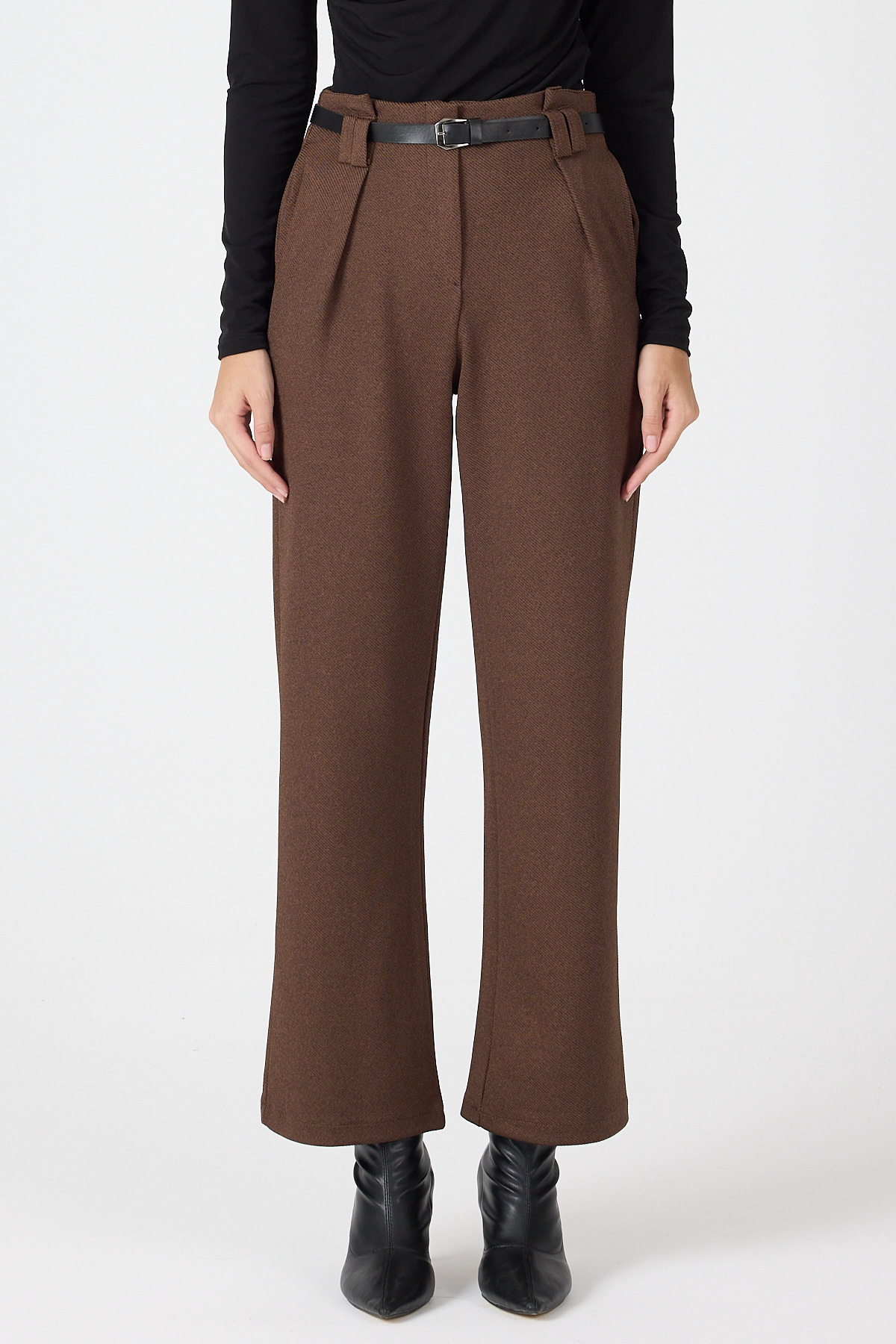 Kahve Pileli Kemerli Kadın Kumaş Pantolon 8119A