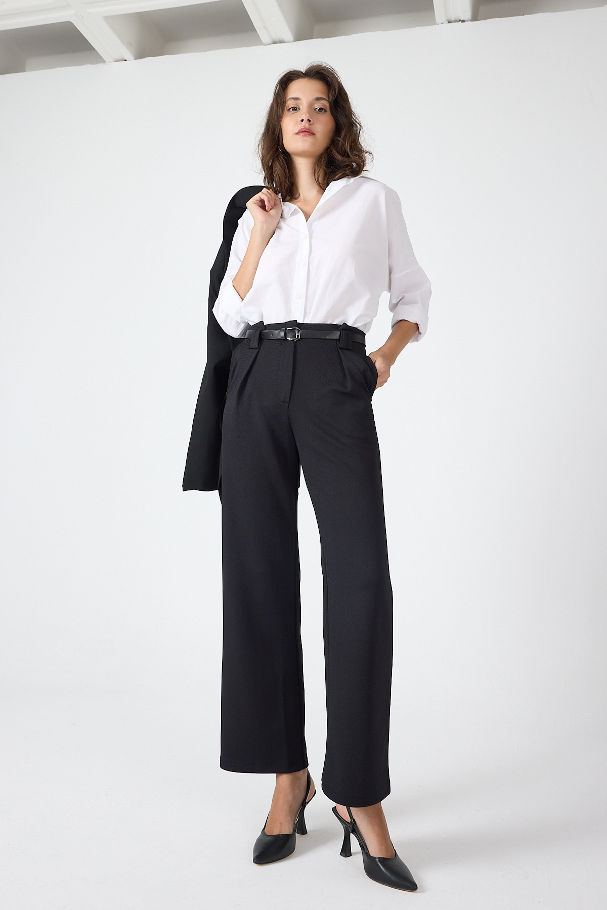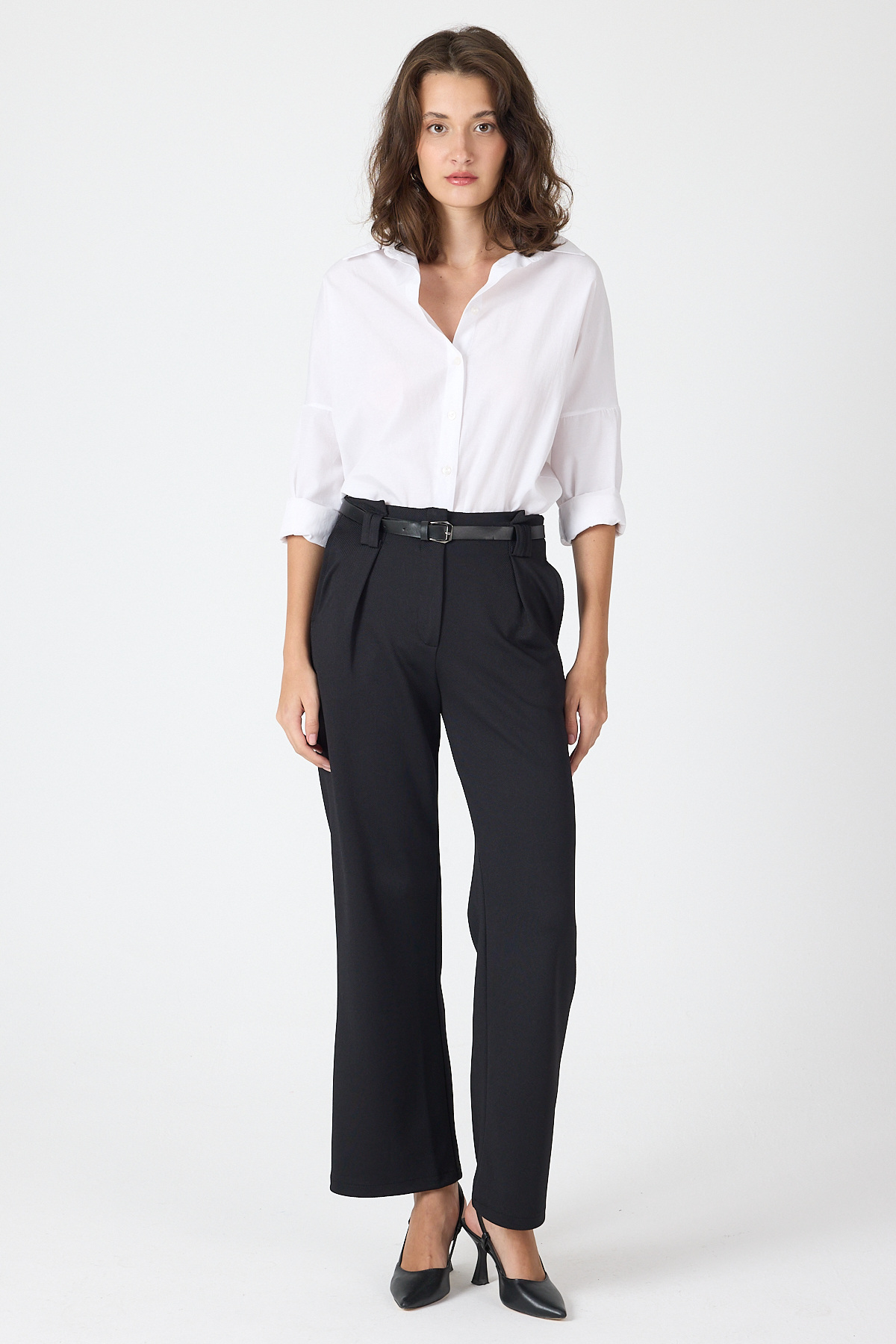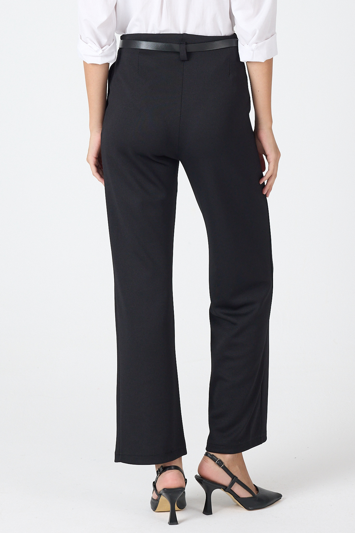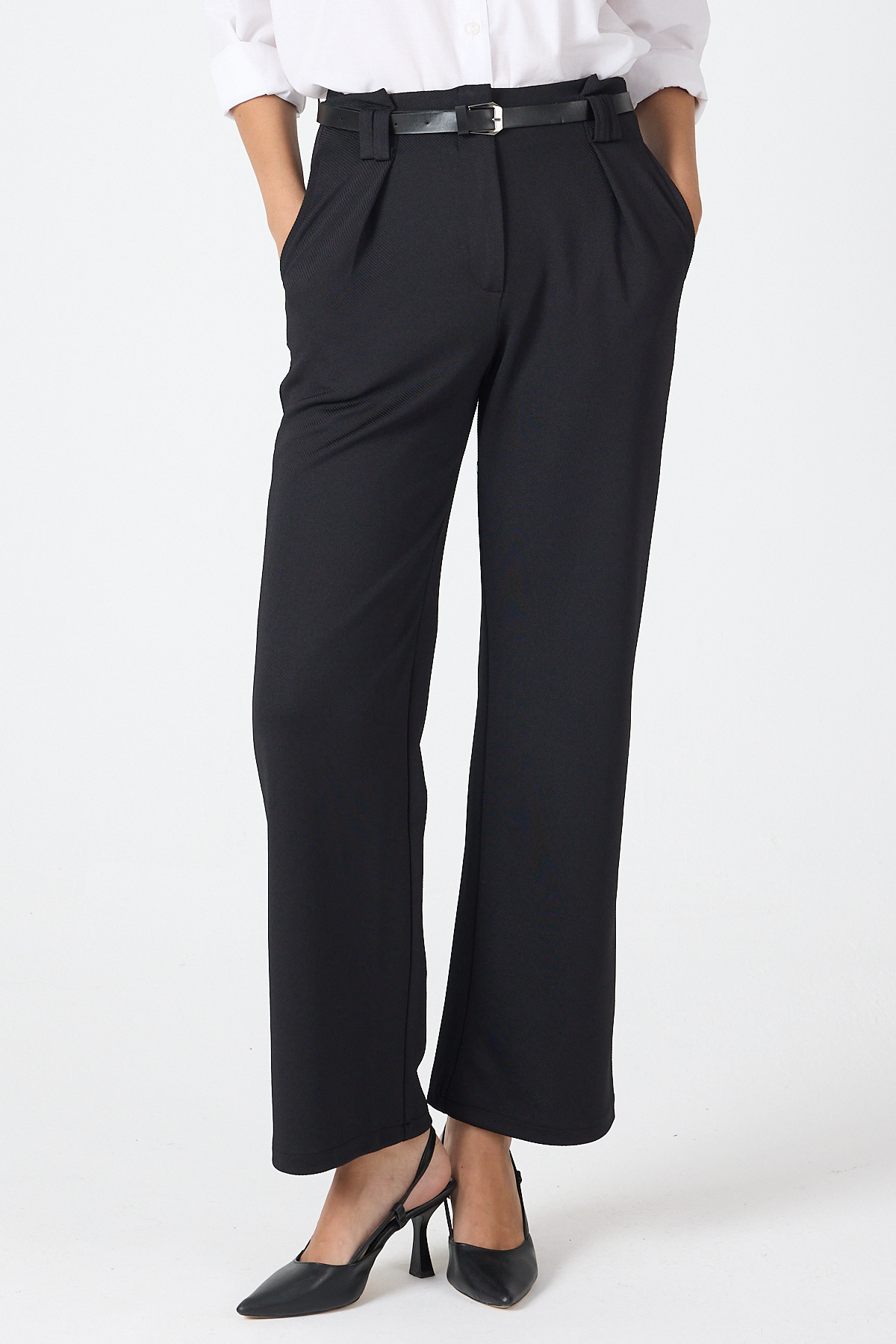 Siyah Pileli Kemerli Kadın Kumaş Pantolon 8119A