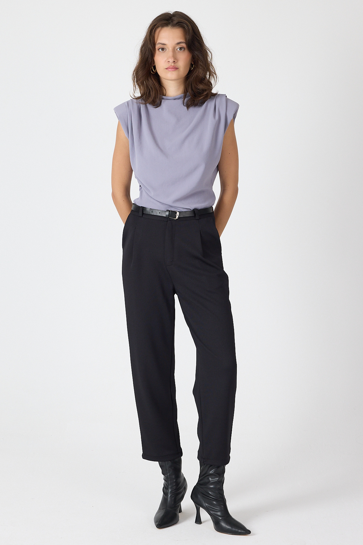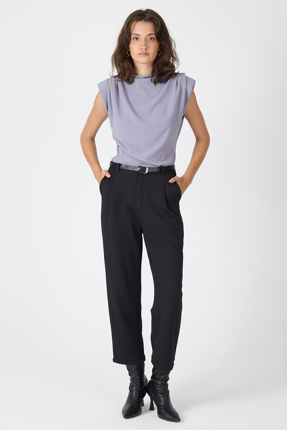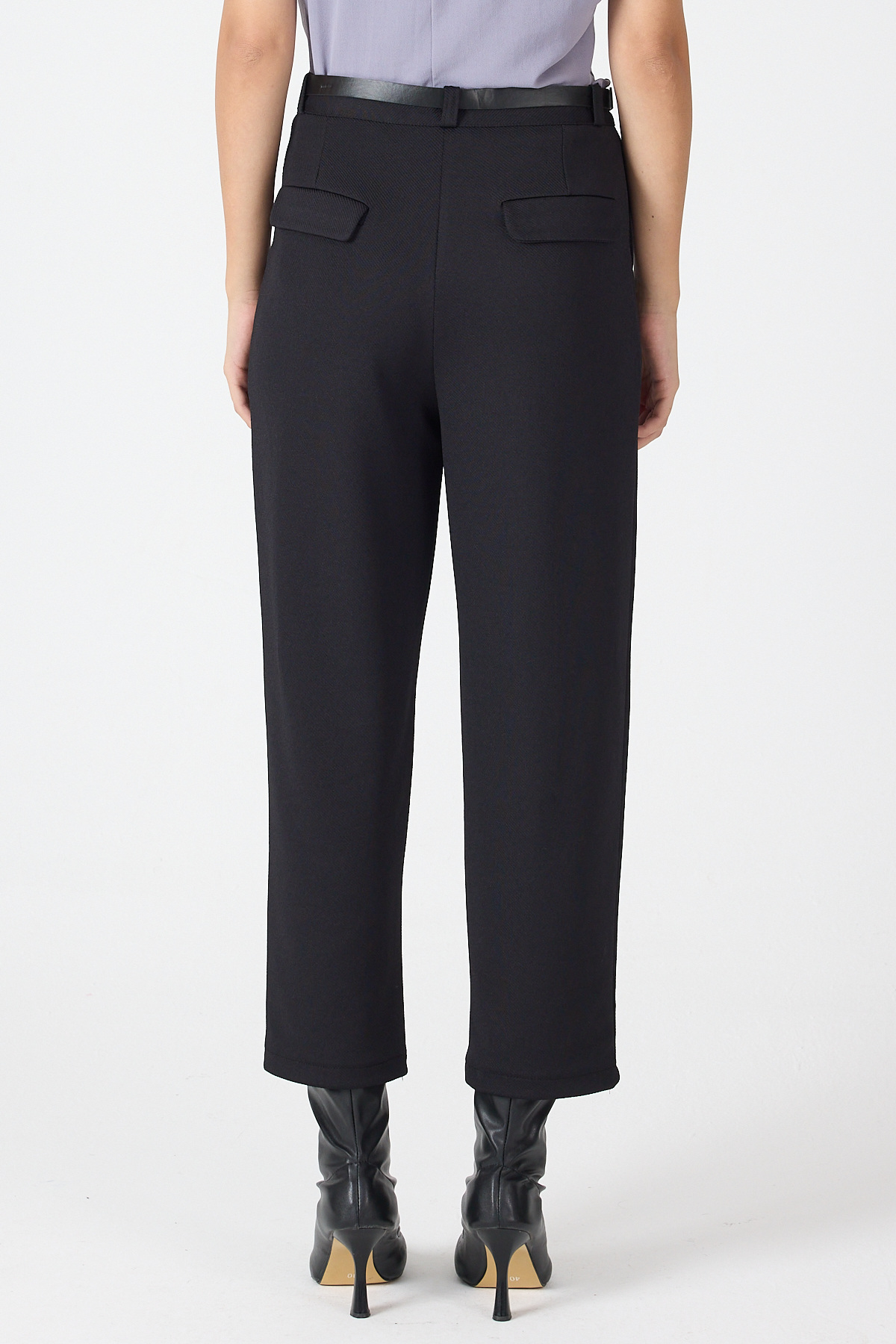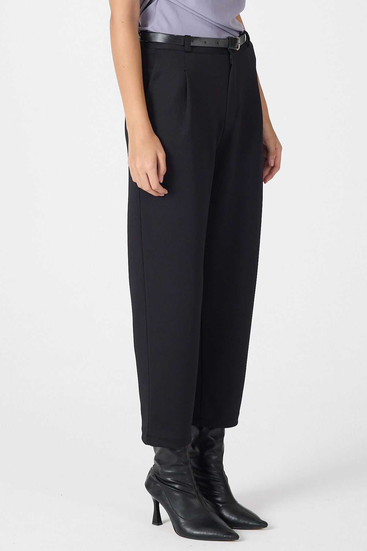 Siyah Pileli Kemerli Kadın Kumaş Pantolon 8120A
