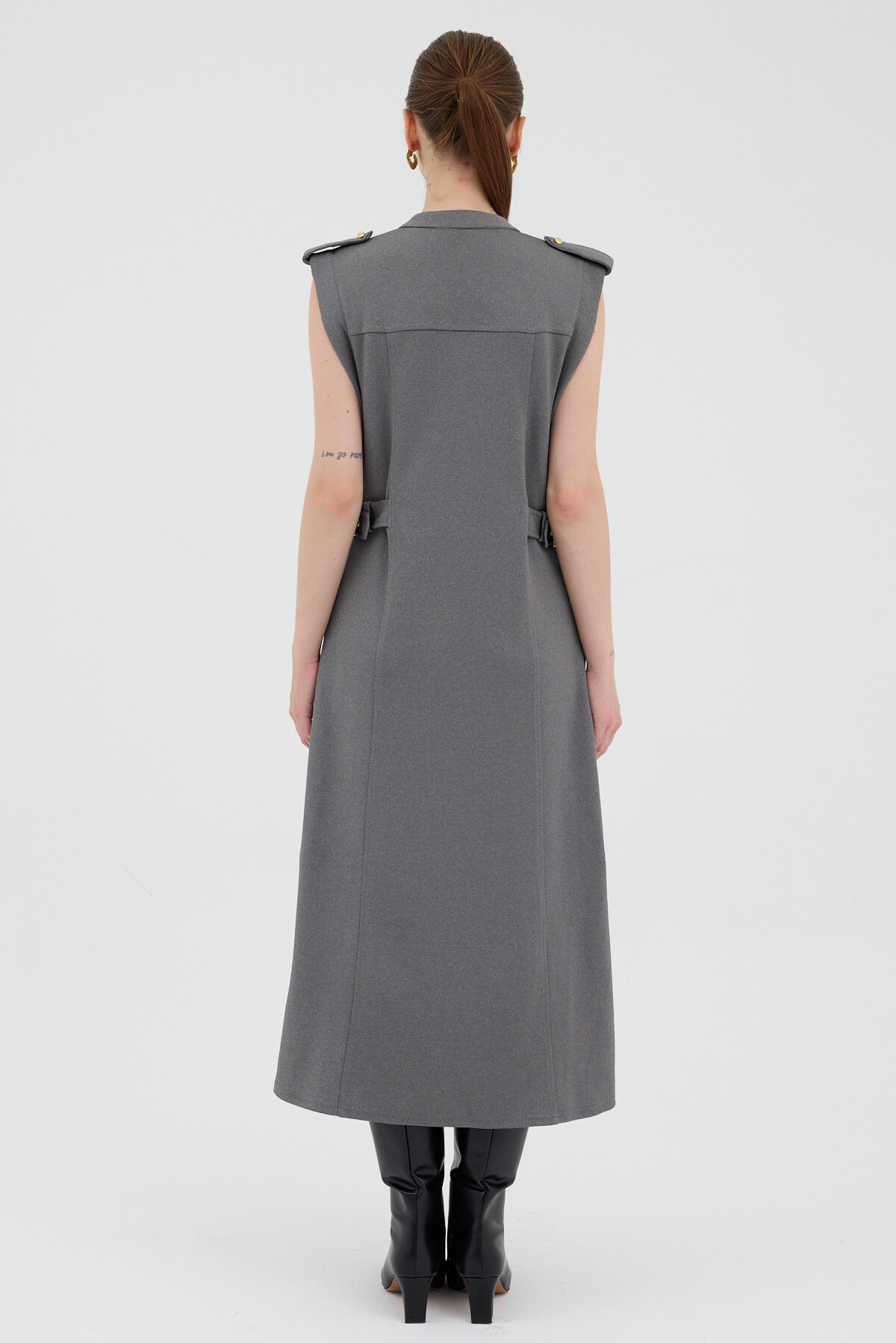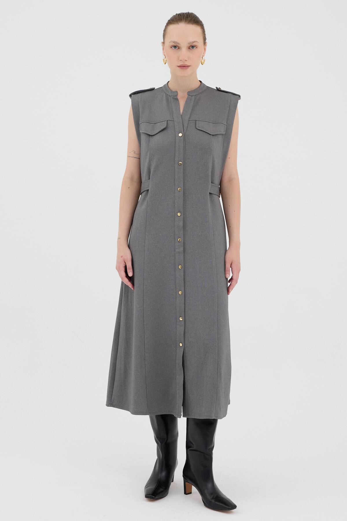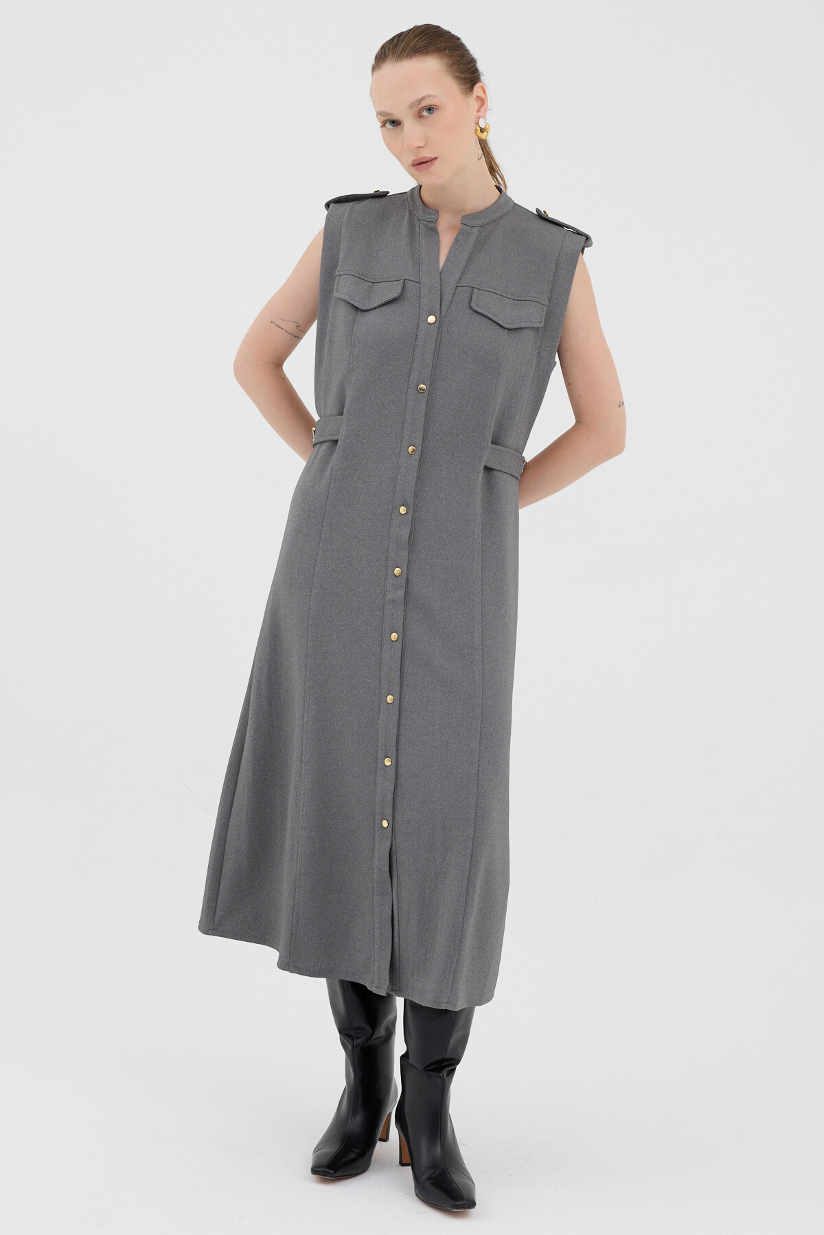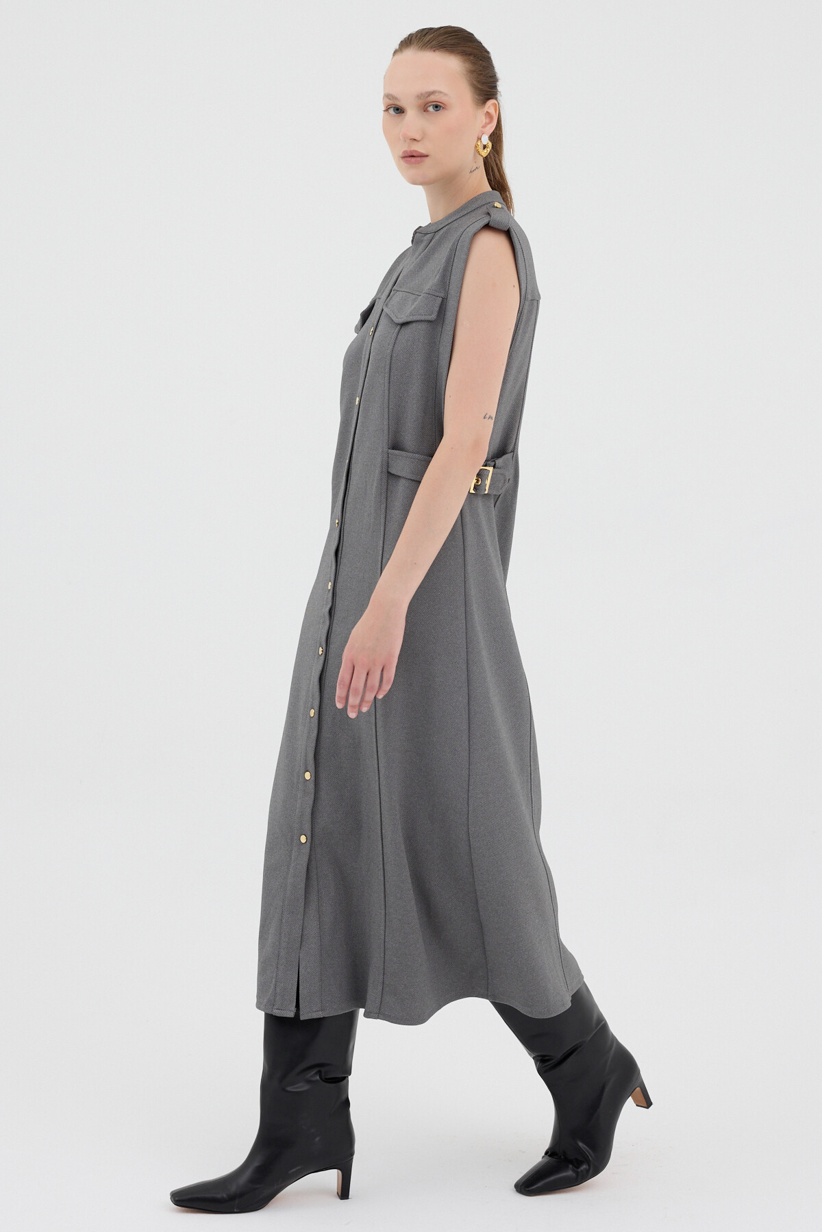 Antrasit Gold Düğme Detaylı Midi Elbise 8125A