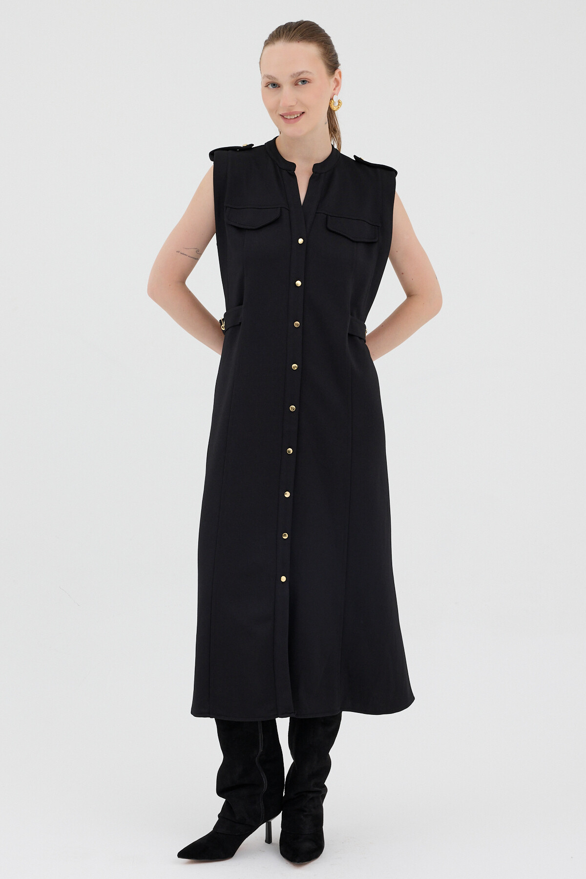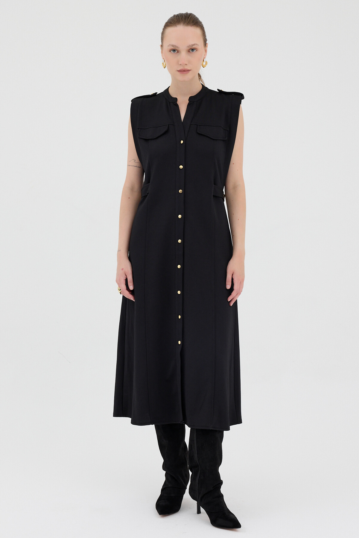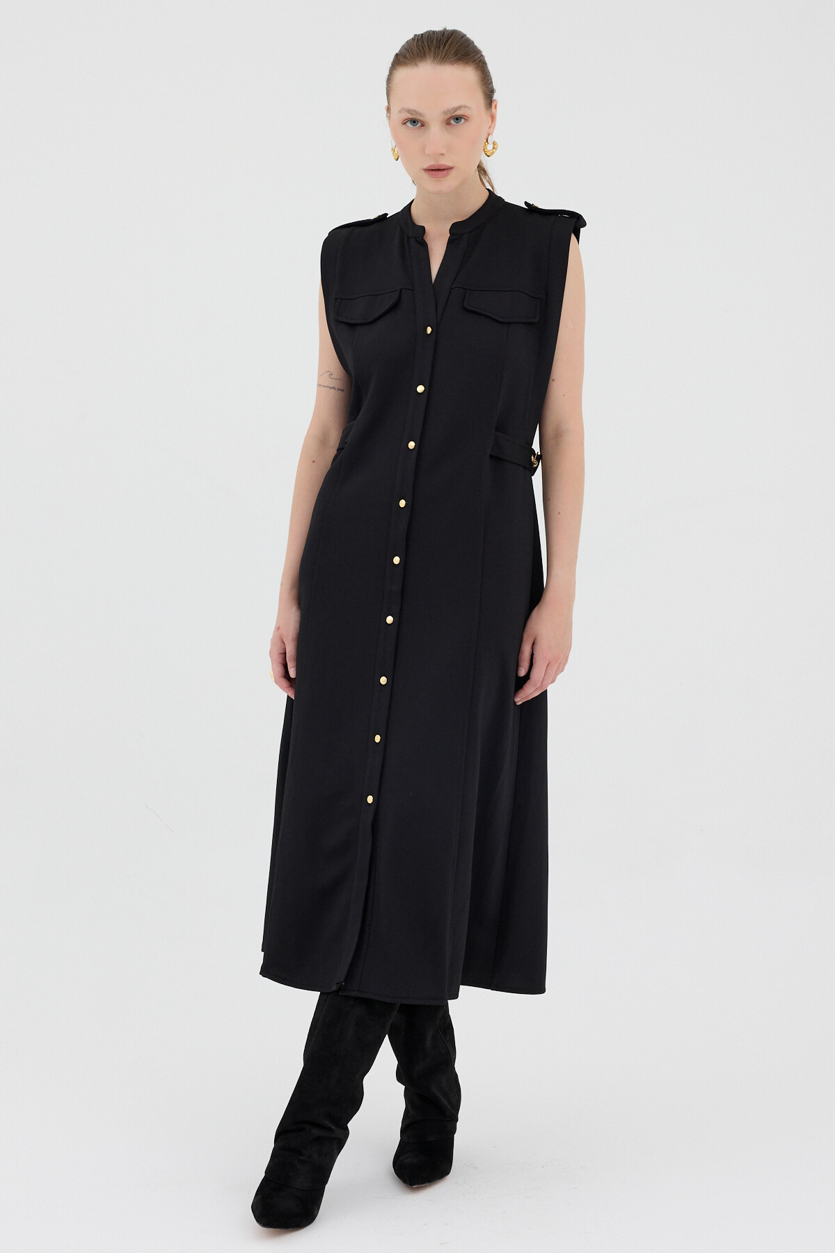 Siyah Gold Düğme Detaylı Midi Elbise 8125A
