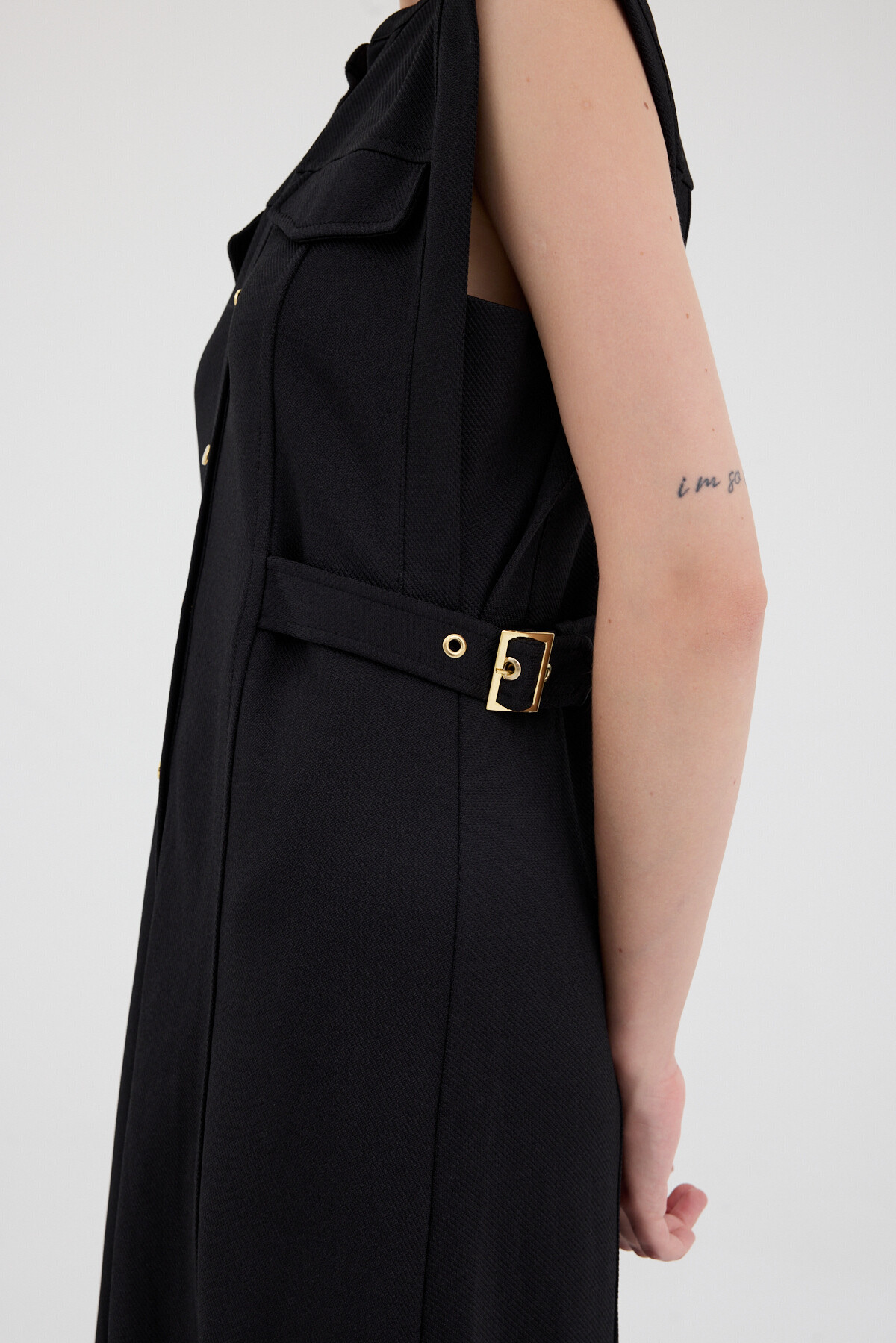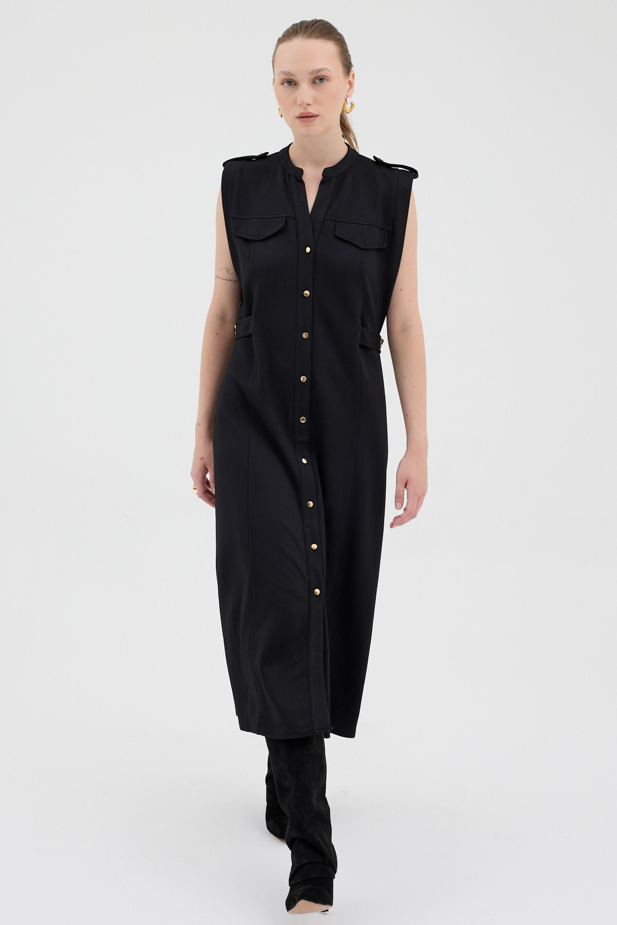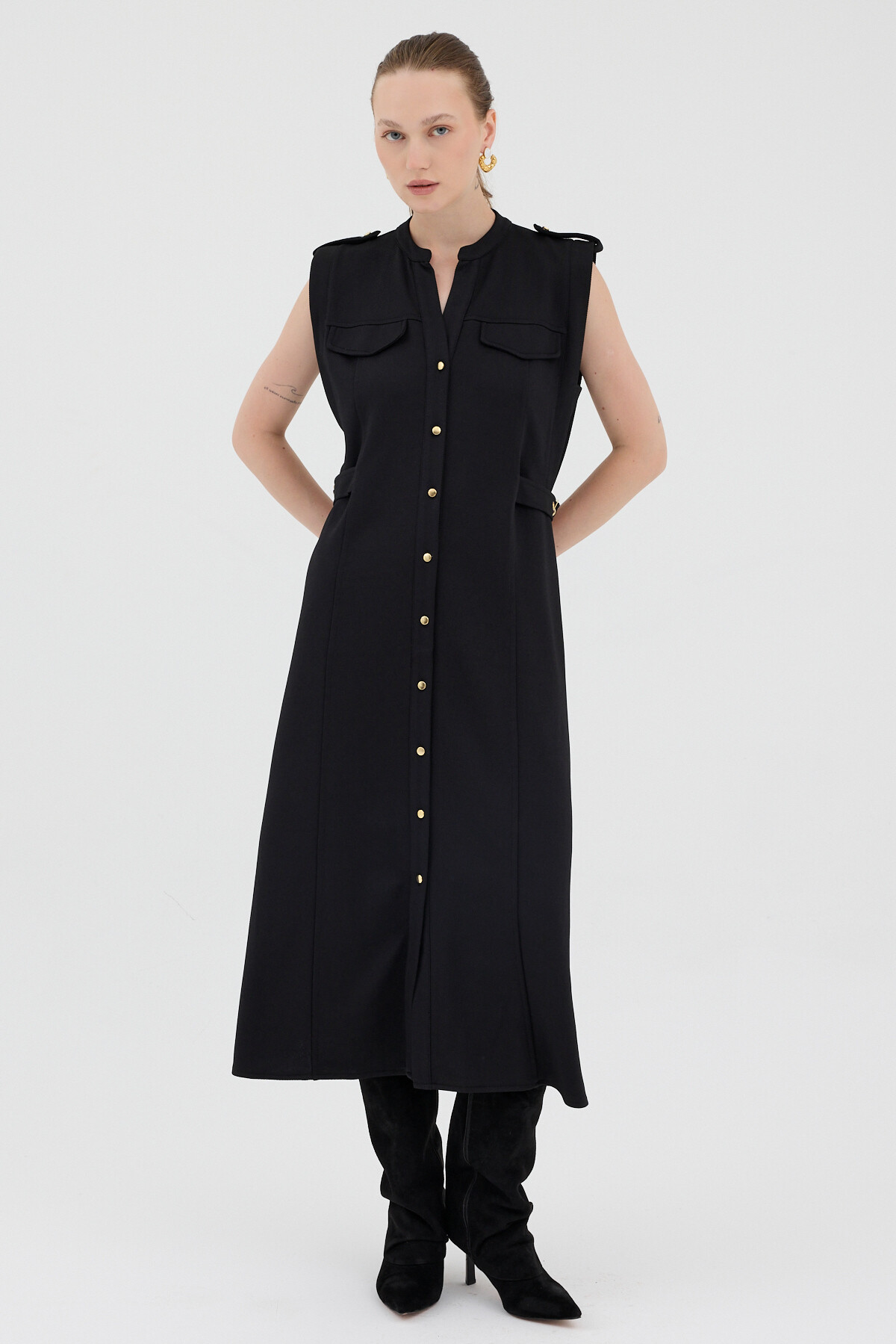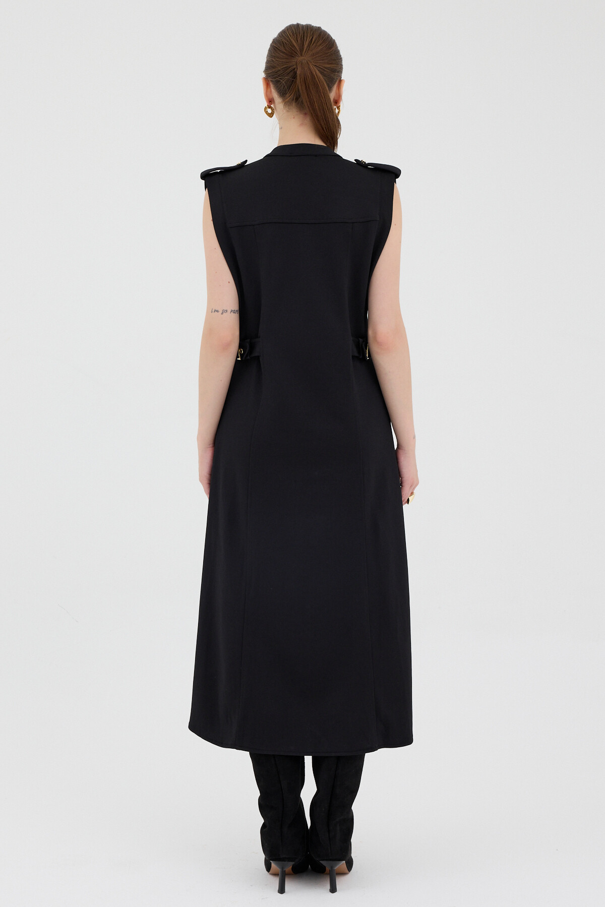 Siyah Gold Düğme Detaylı Midi Elbise 8125A