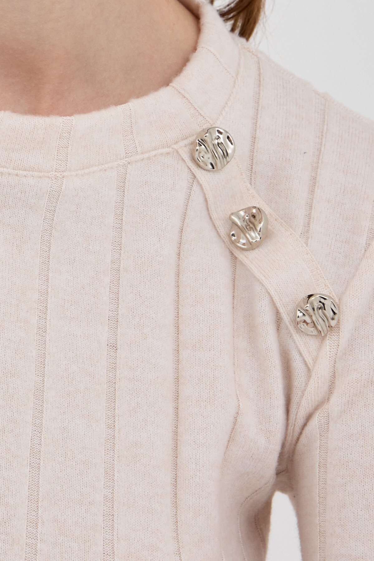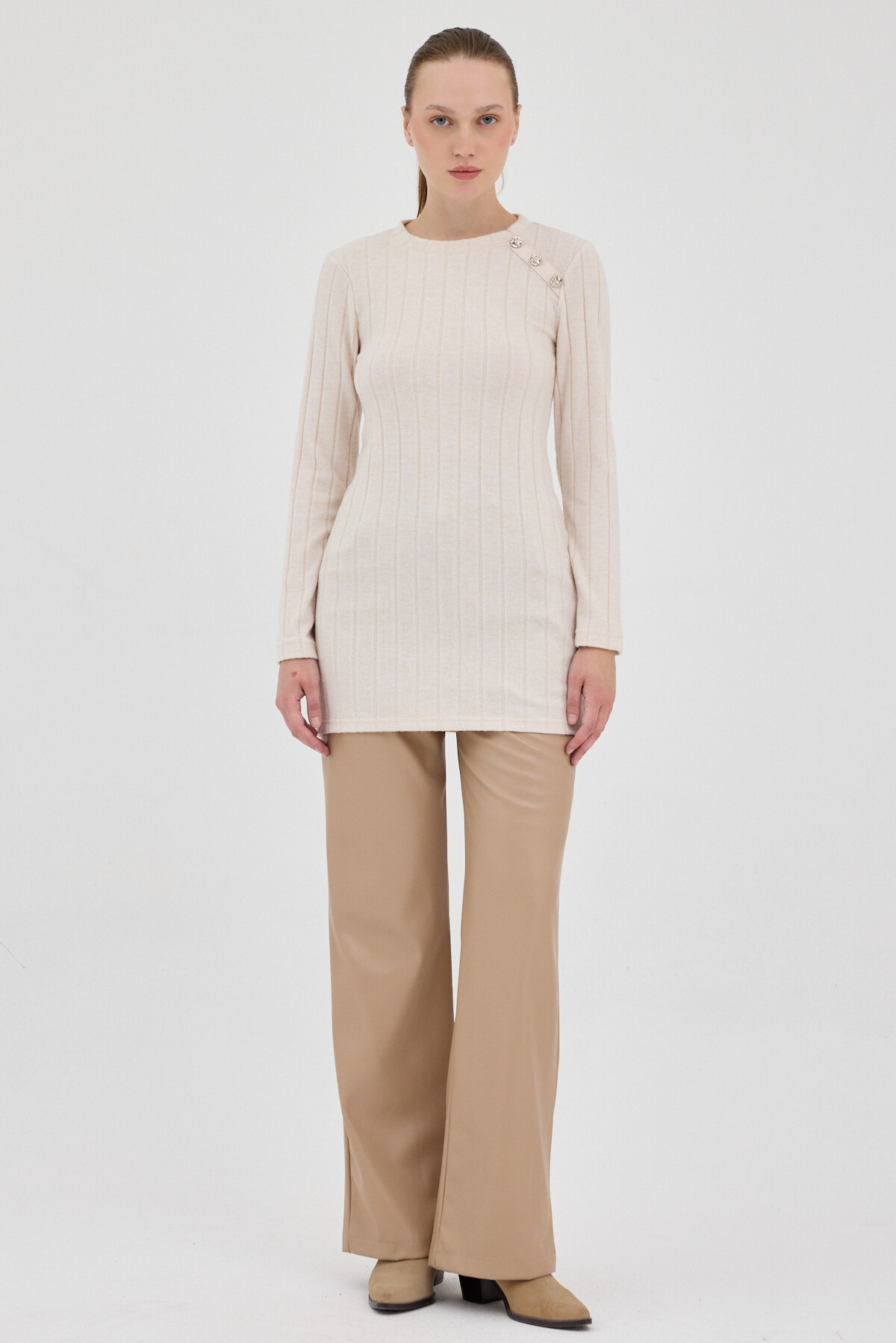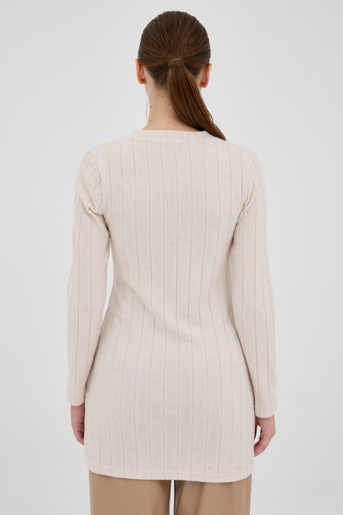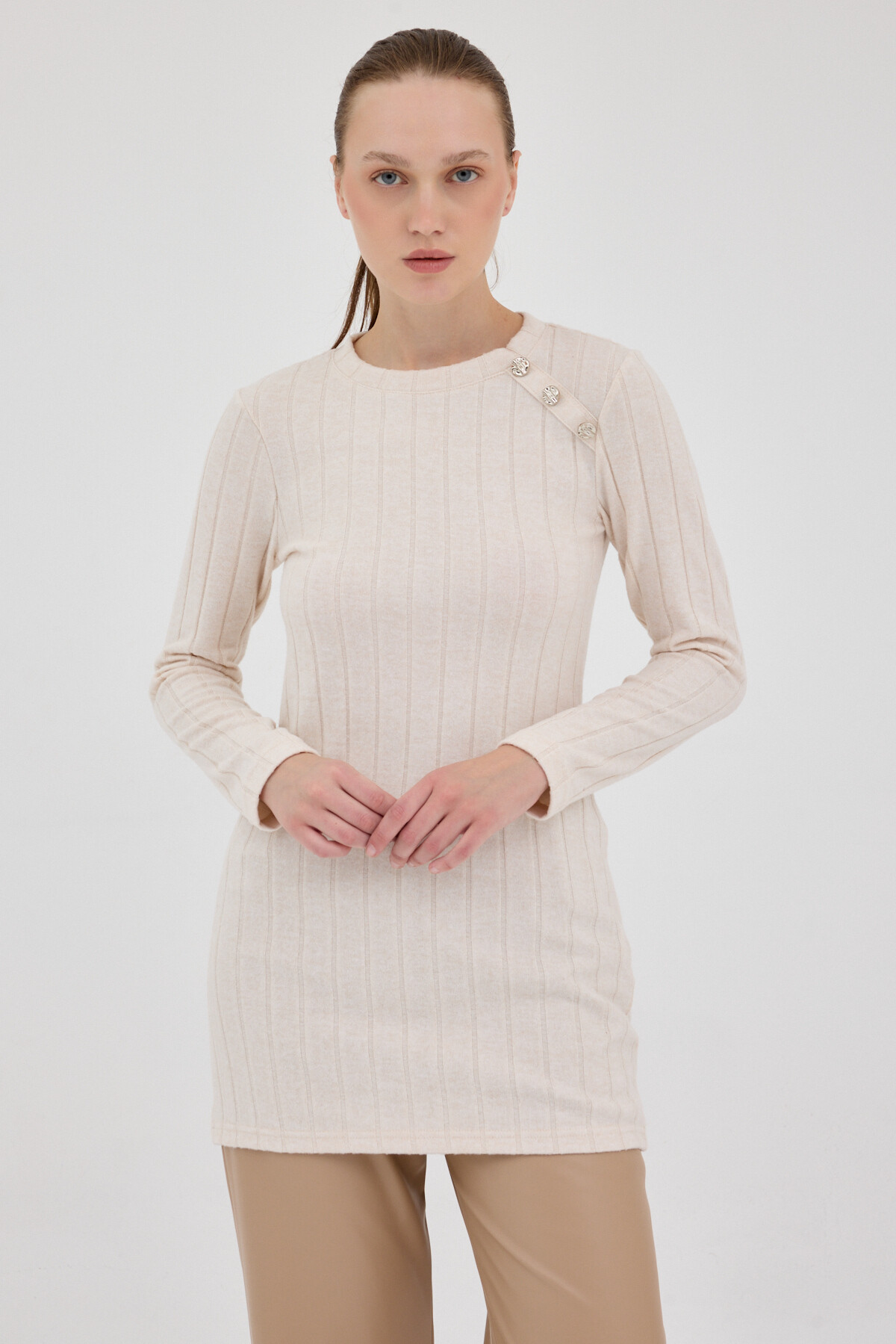 Bej Düğme Detaylı Çizgili Triko Tunik 8132A