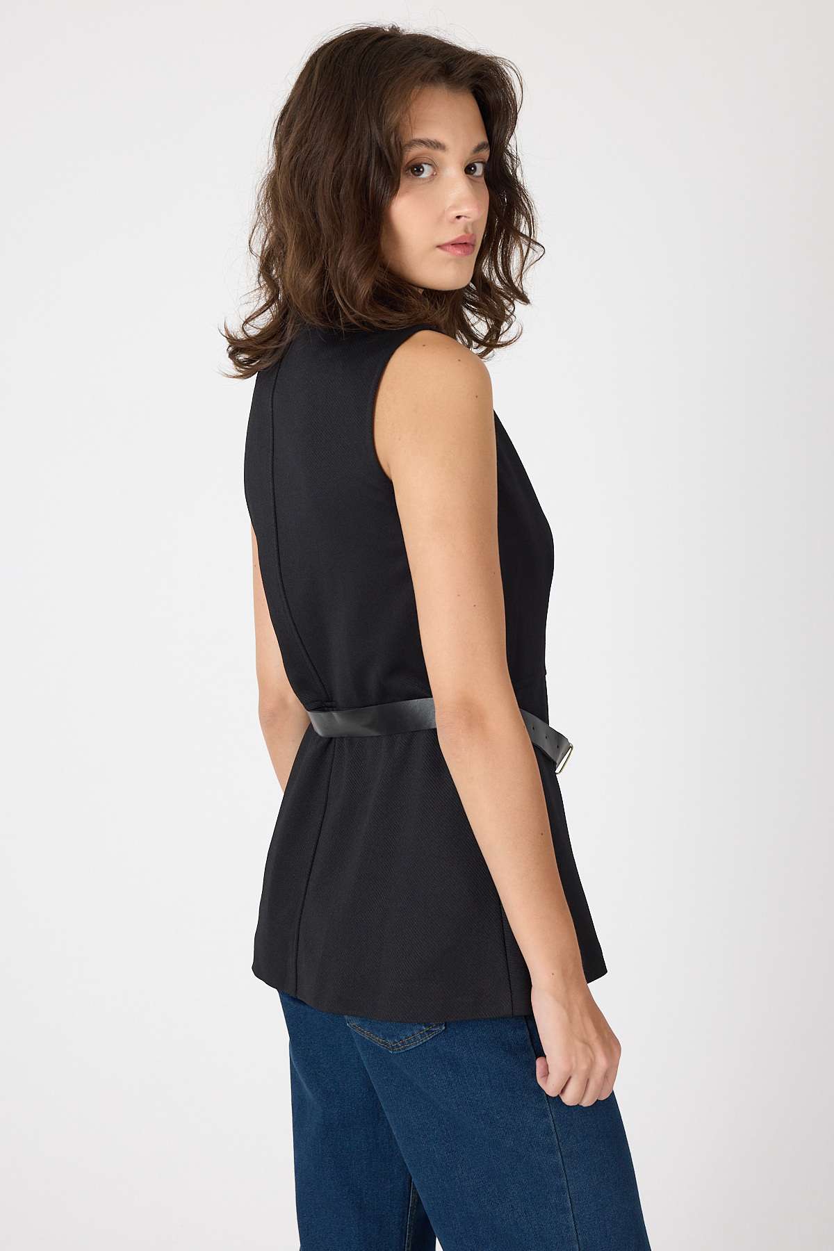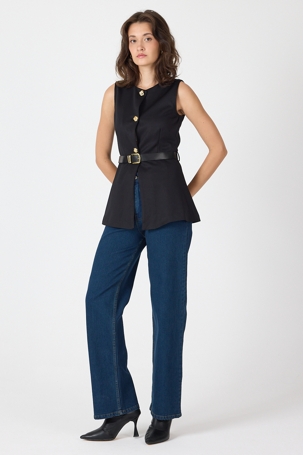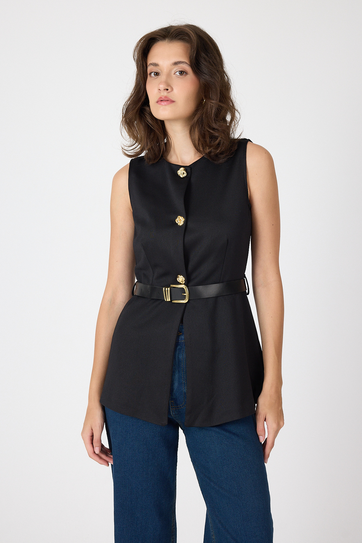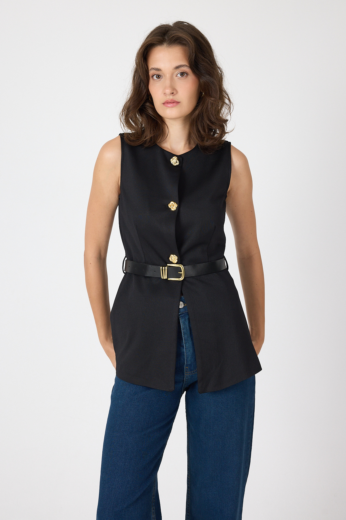 Siyah Gold Düğmeli Kemerli Yelek 8145A