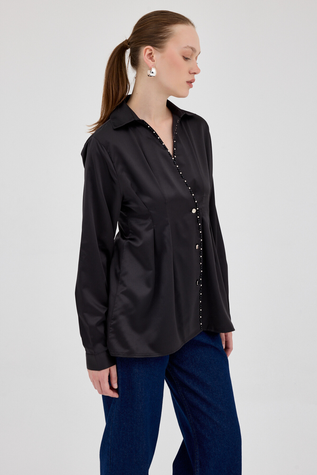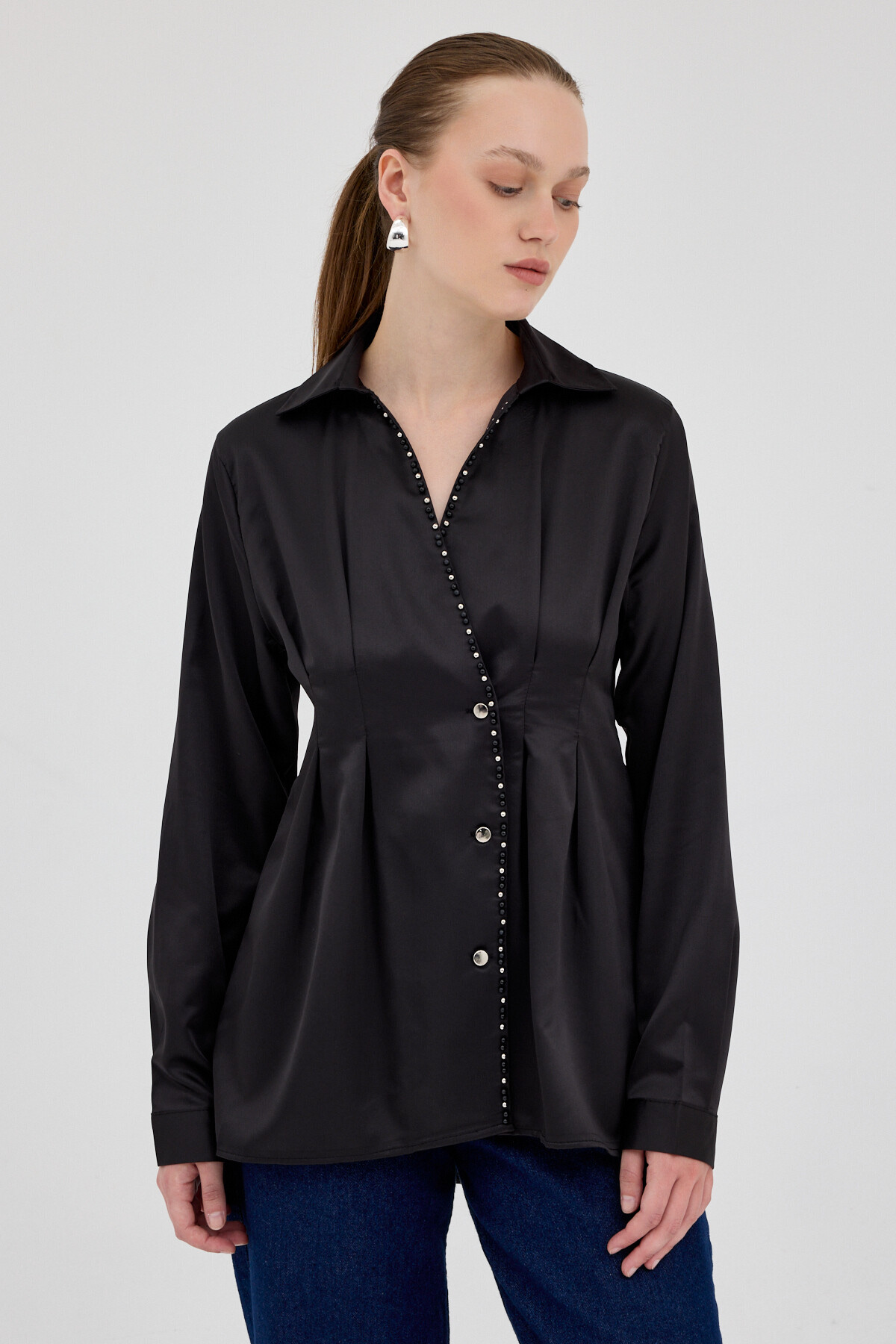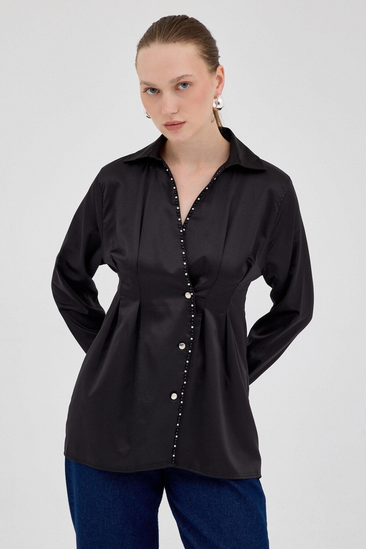 Siyah Kruvaze Kesim Taş İşlemeli Kadın Saten Gömlek 8149A