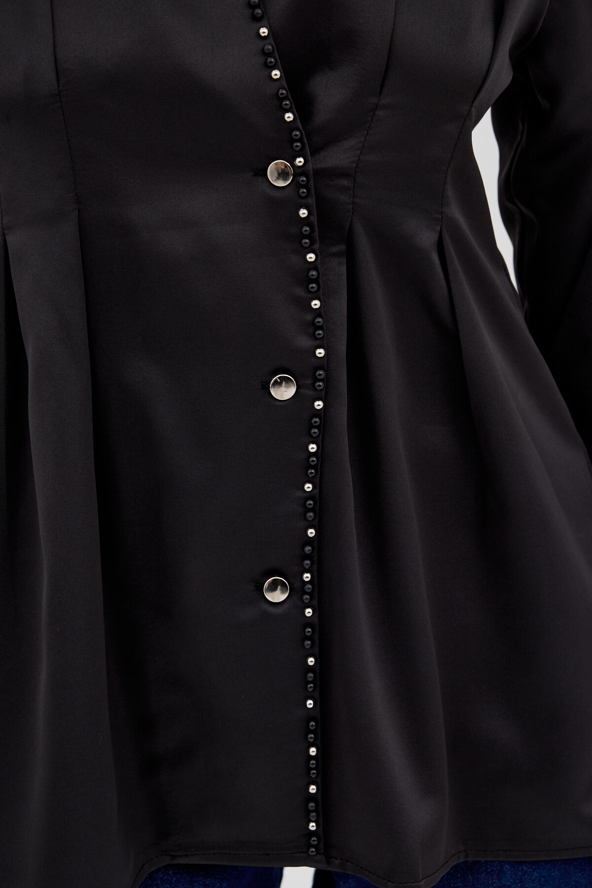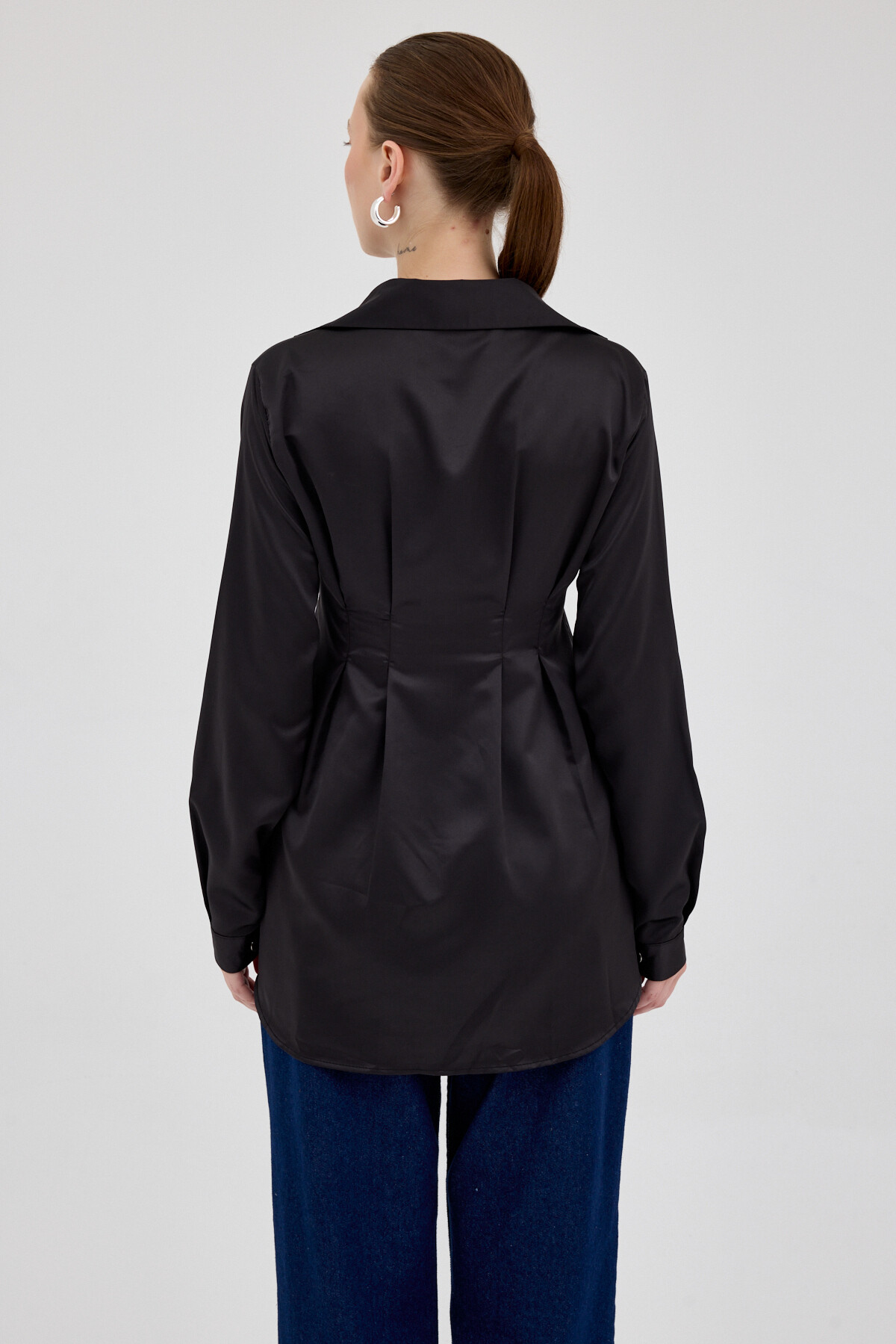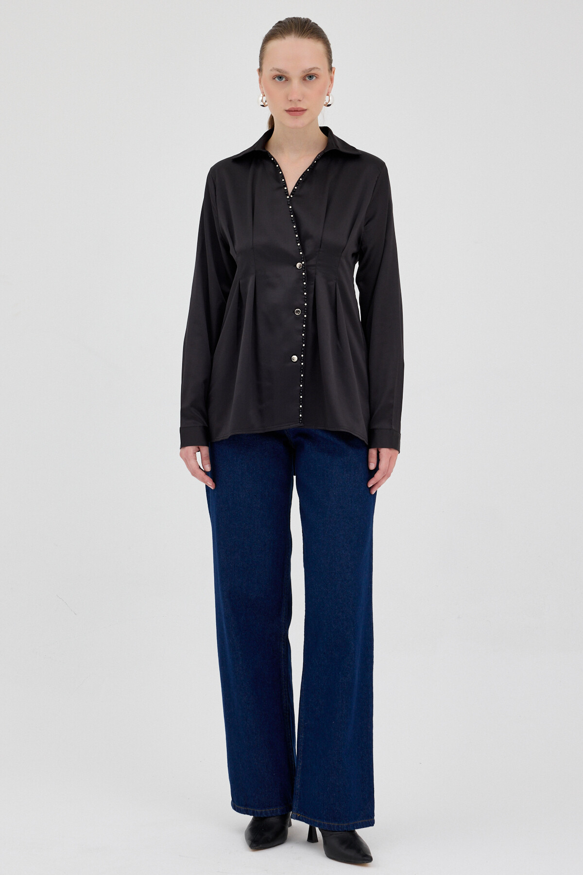 Siyah Kruvaze Kesim Taş İşlemeli Kadın Saten Gömlek 8149A