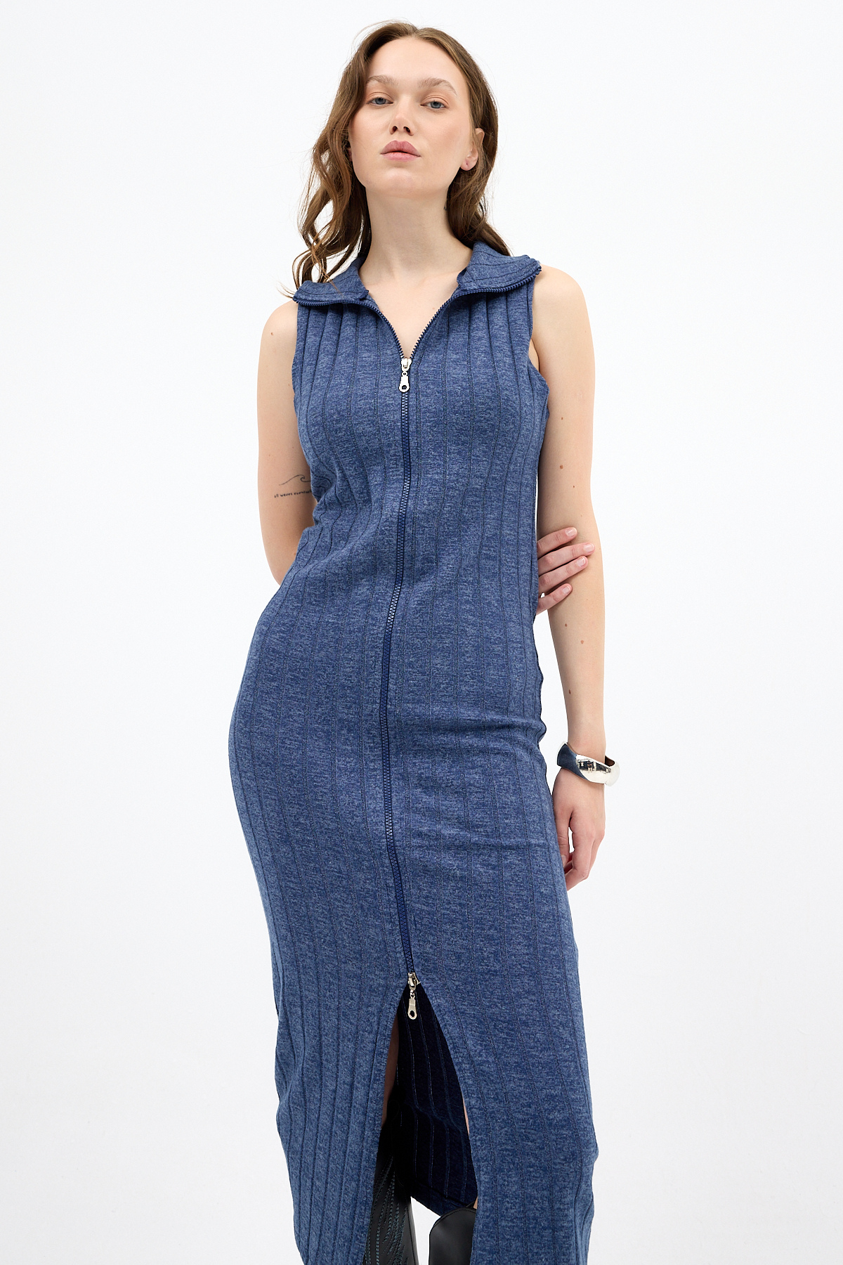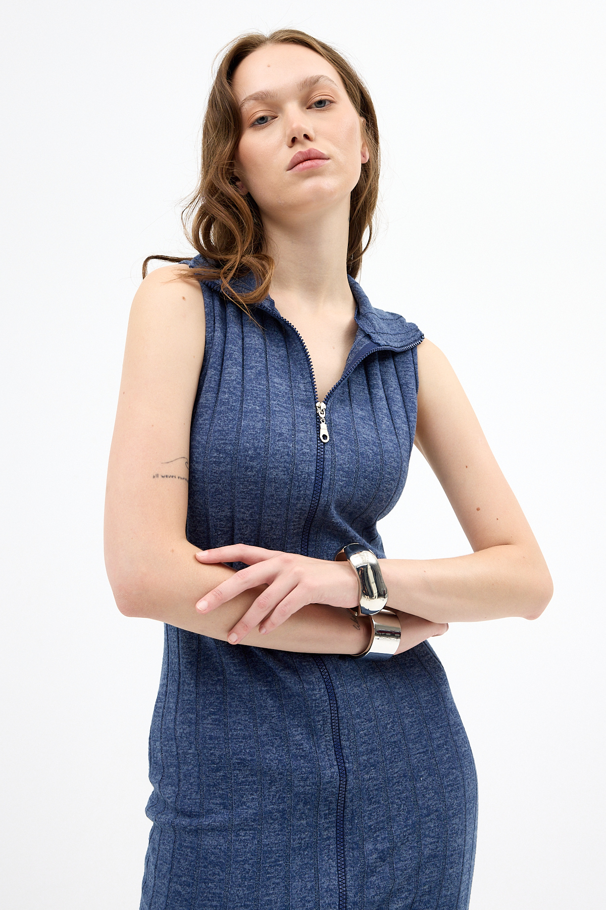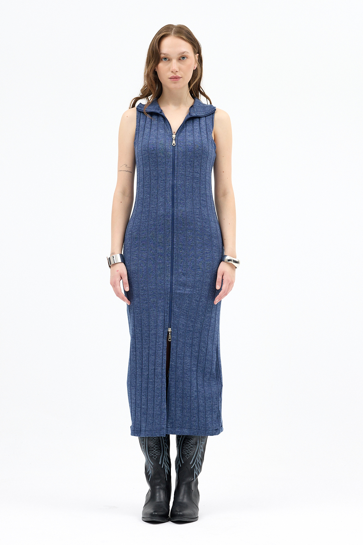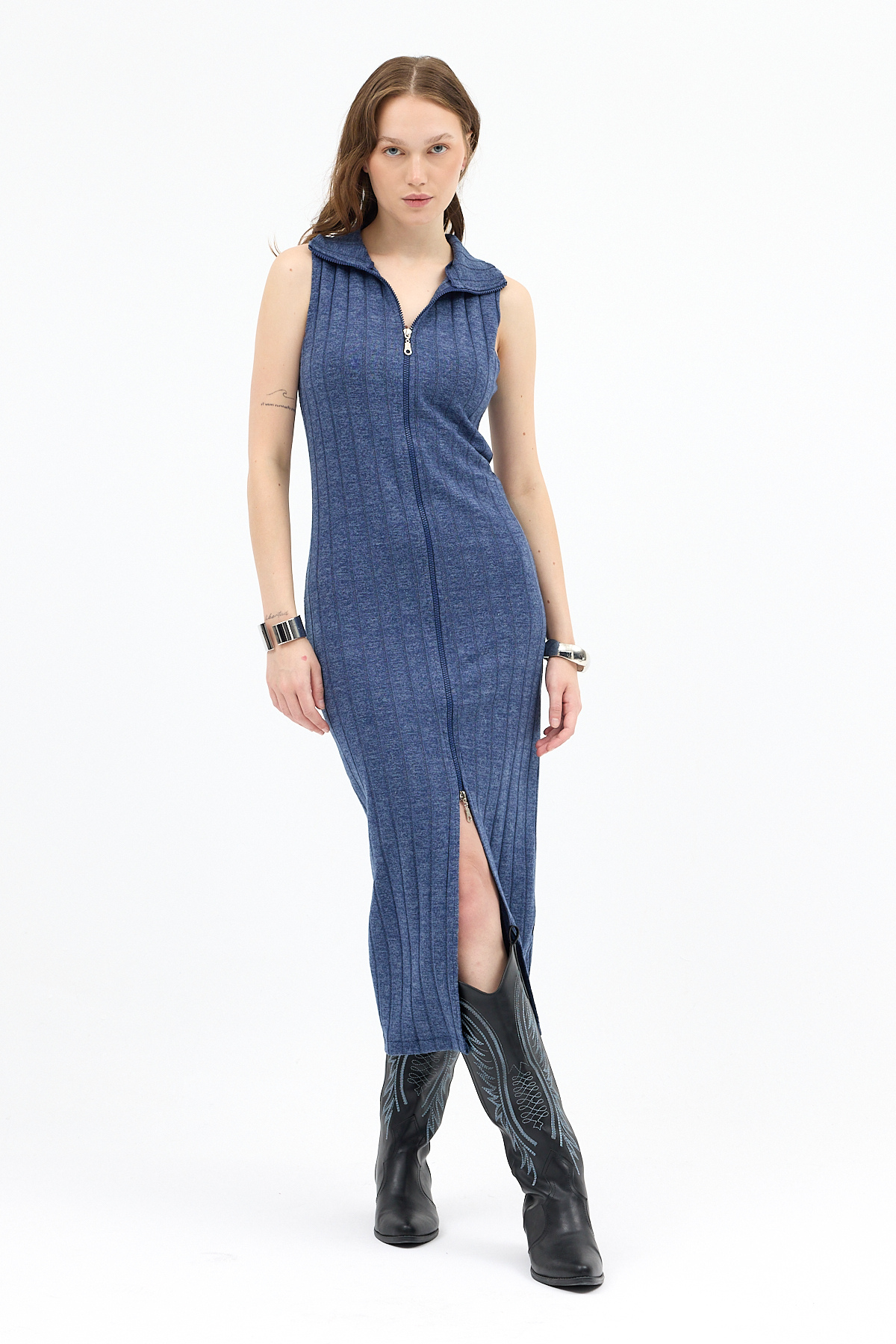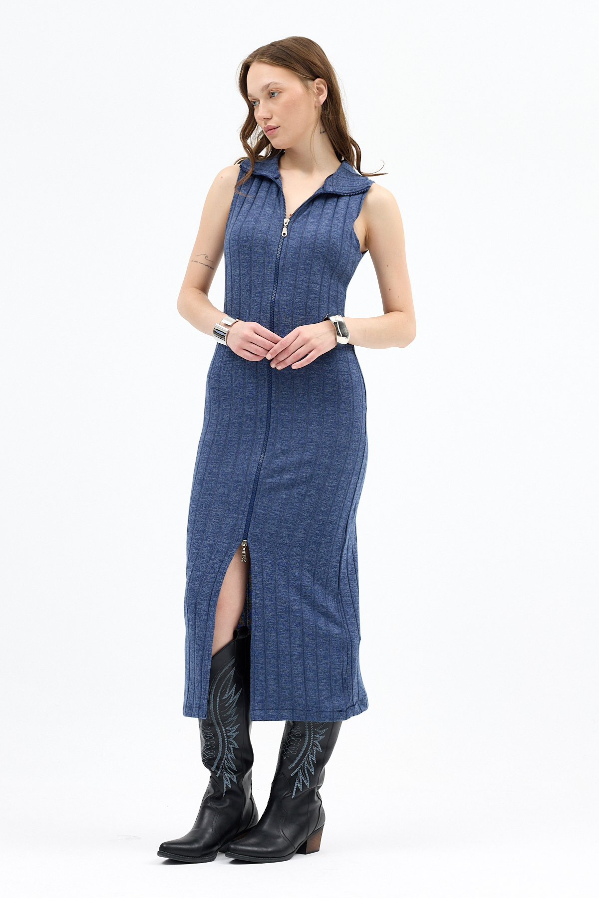 İndigo Fermuarlı Dik Yaka Triko Elbise 8152A