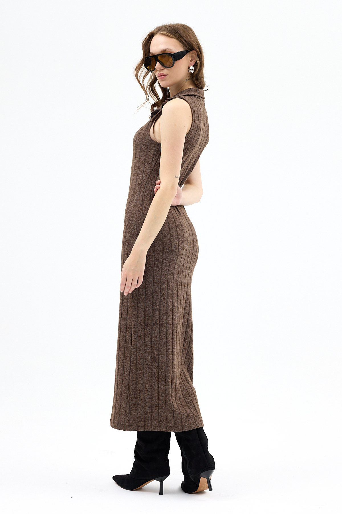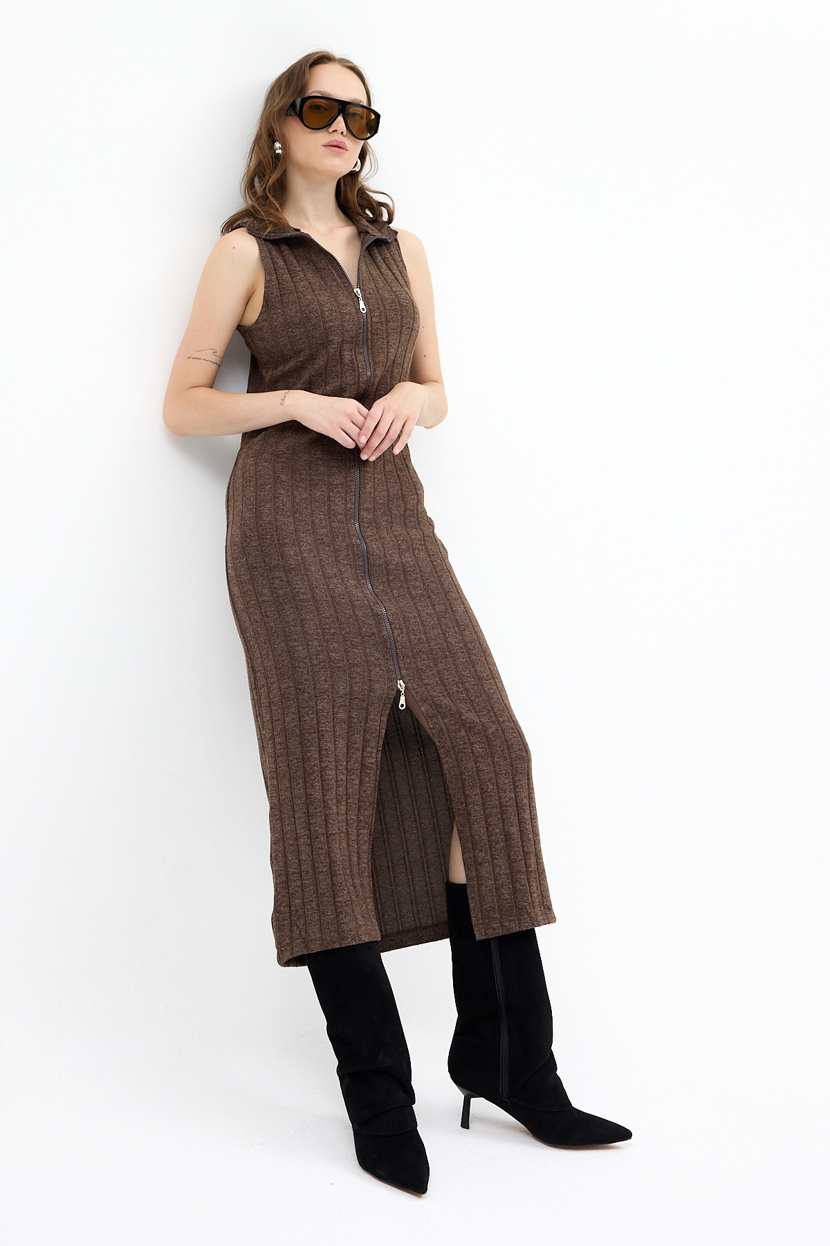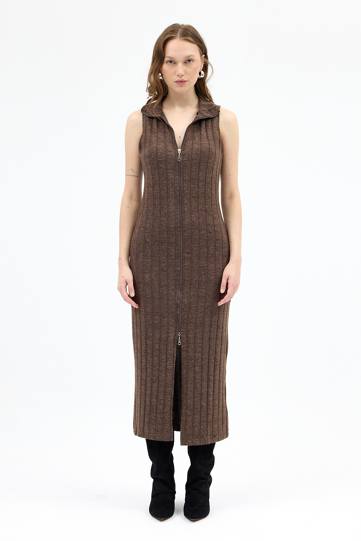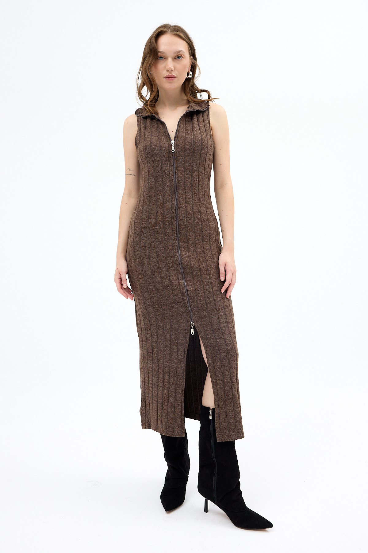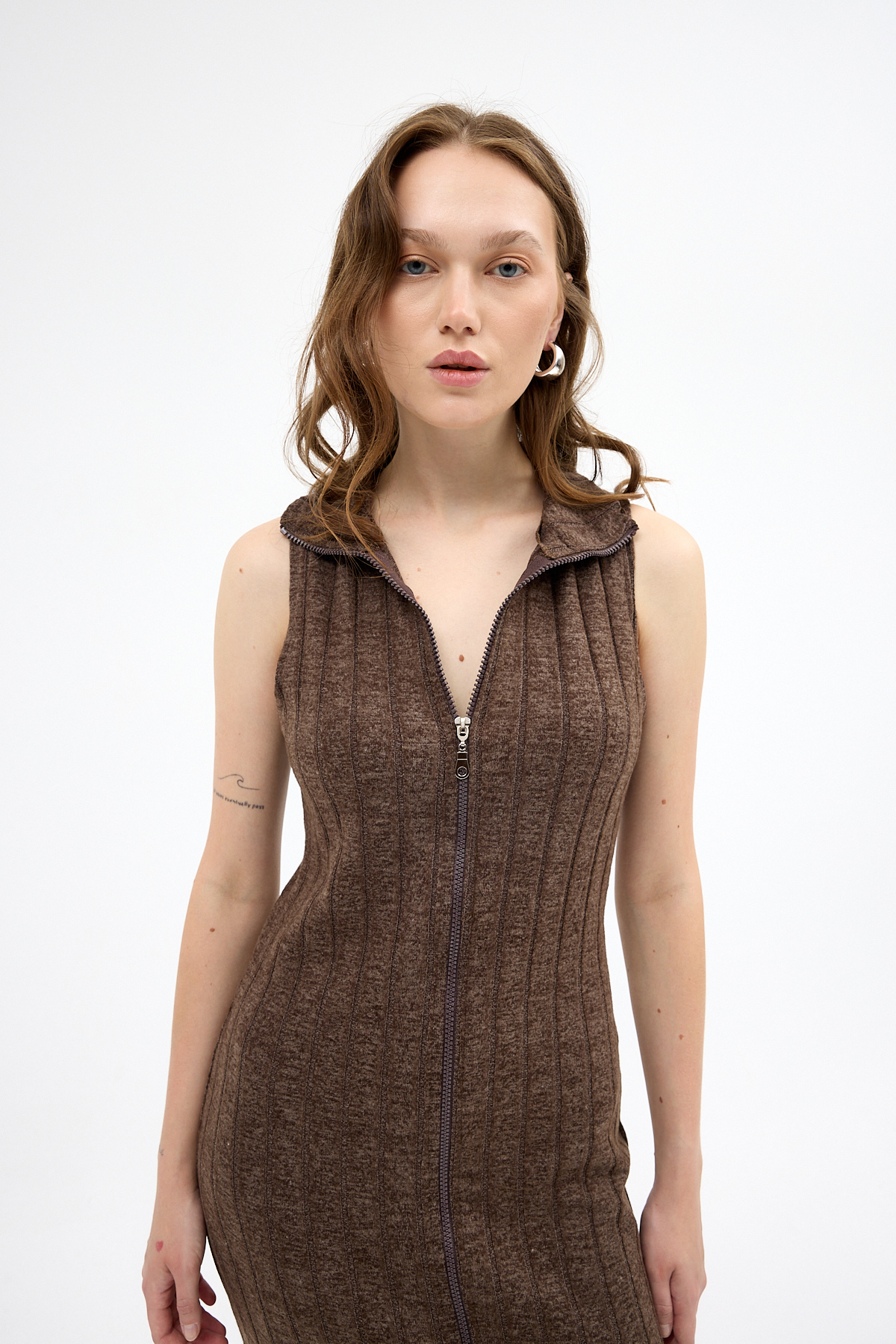 Kahve Fermuarlı Dik Yaka Triko Elbise 8152A