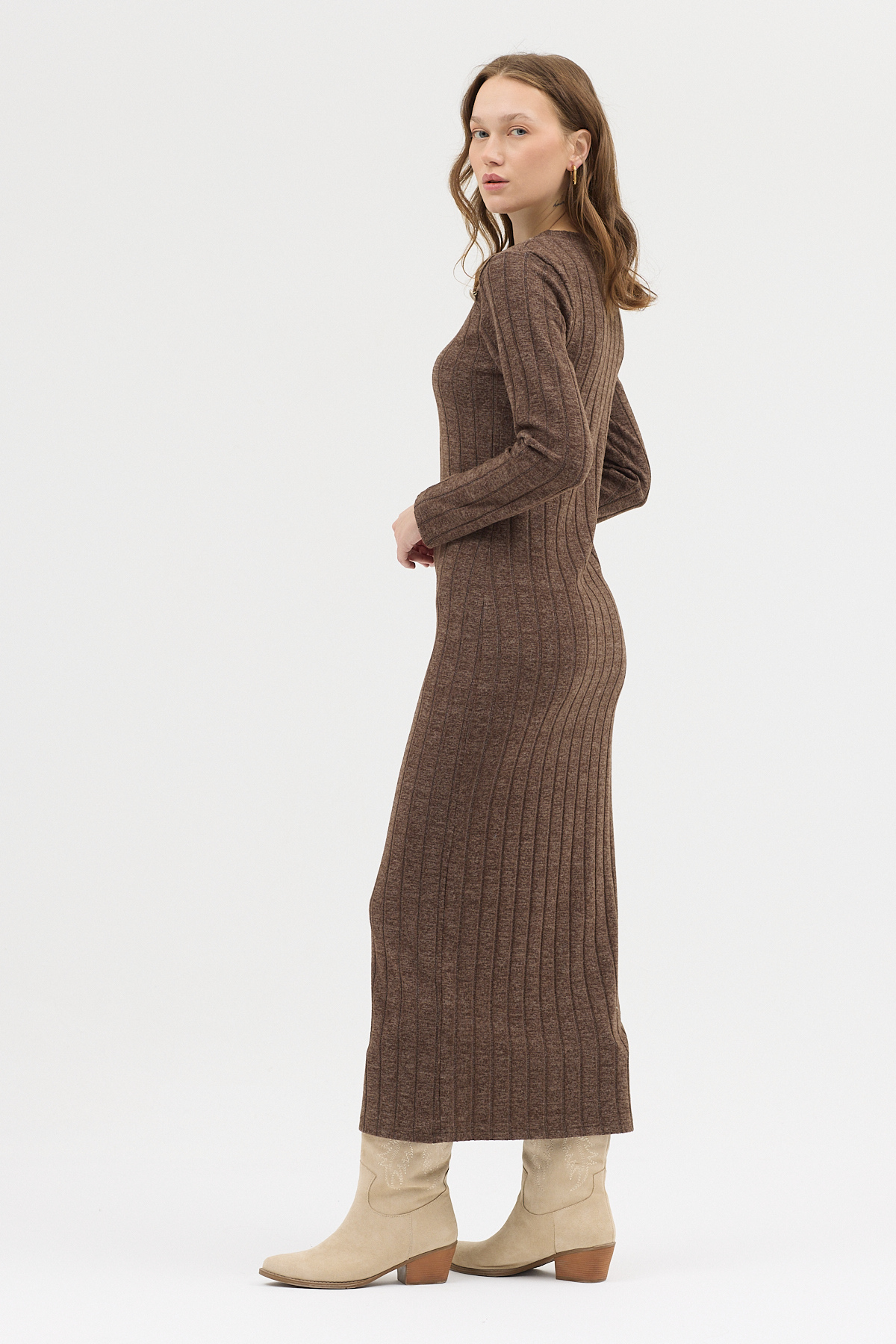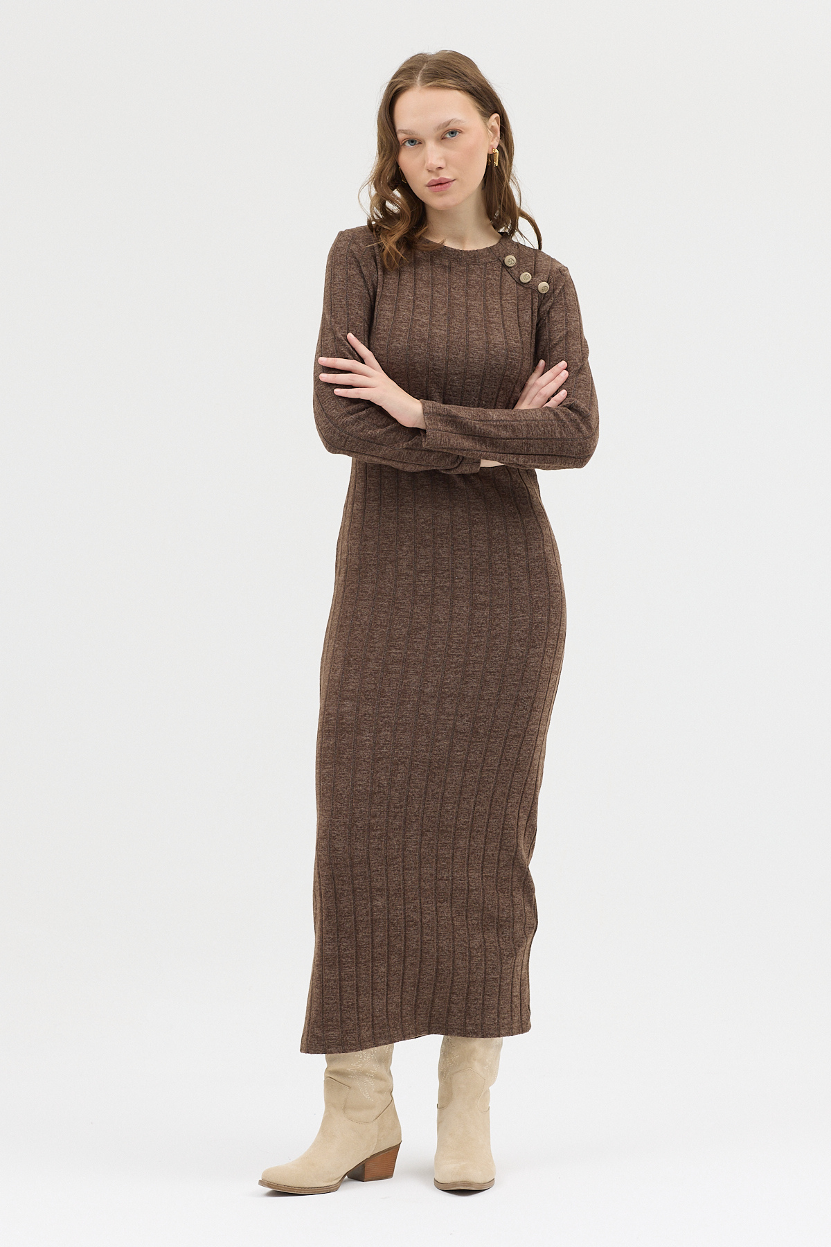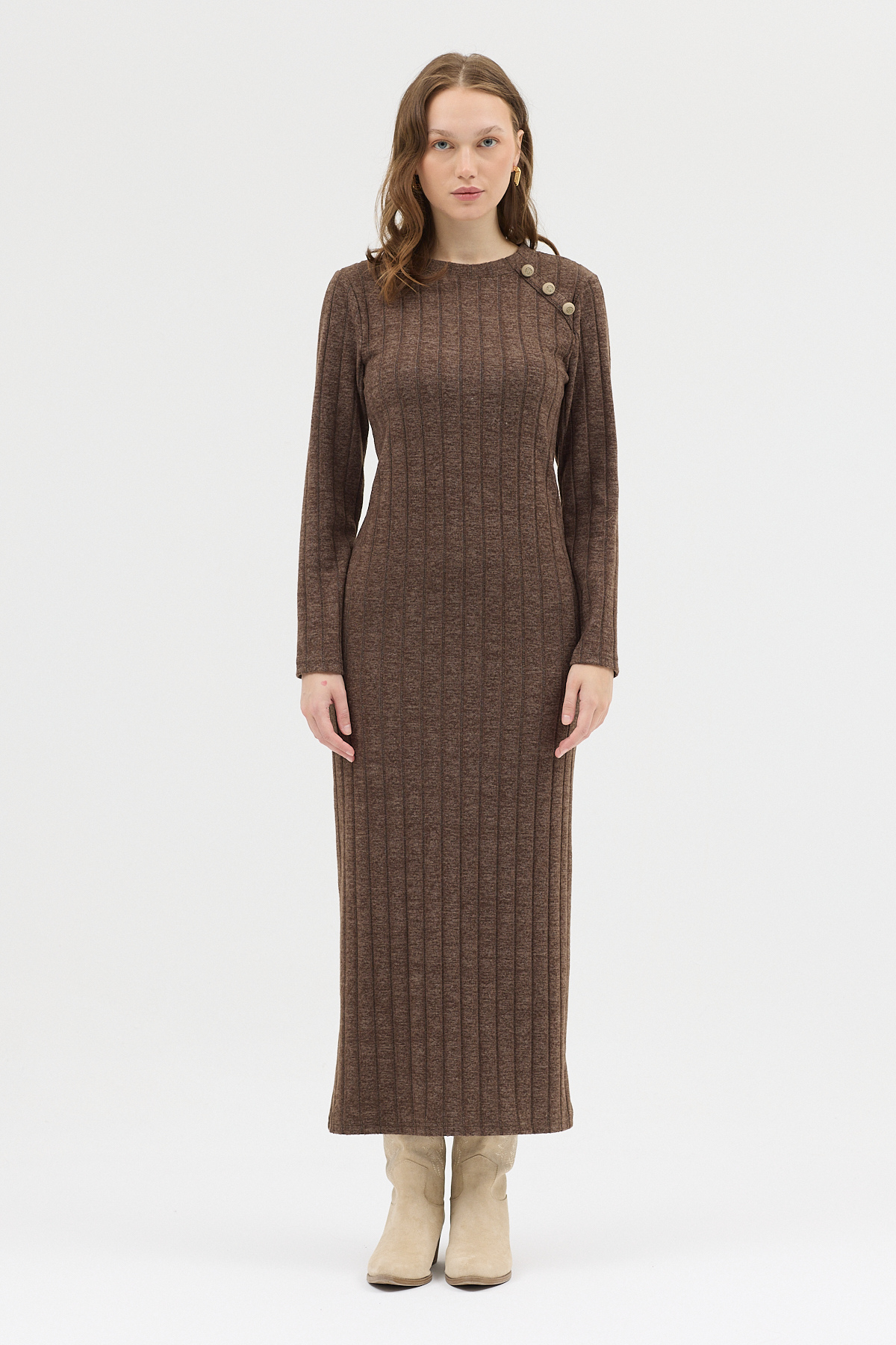 Kahve Omuz Düğme Detaylı Triko Uzun Elbise 8154A