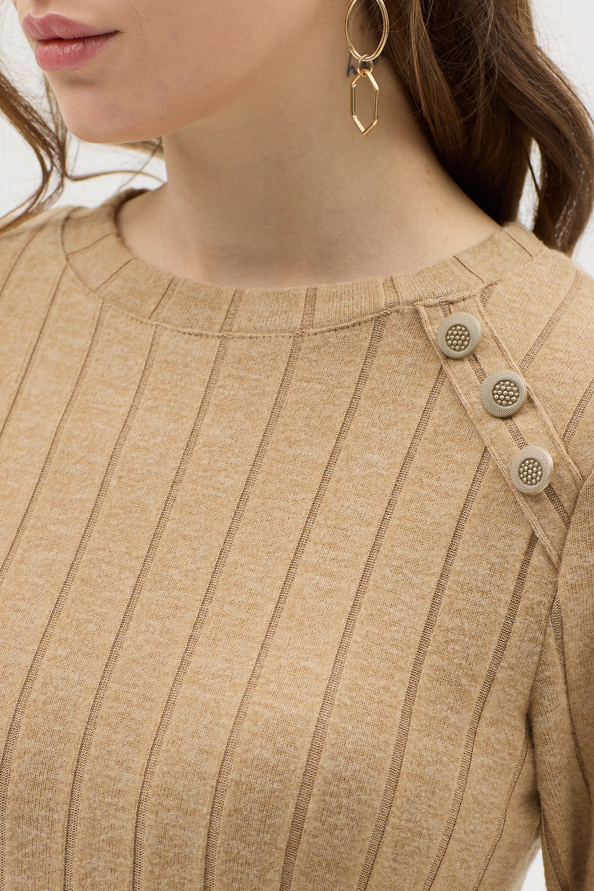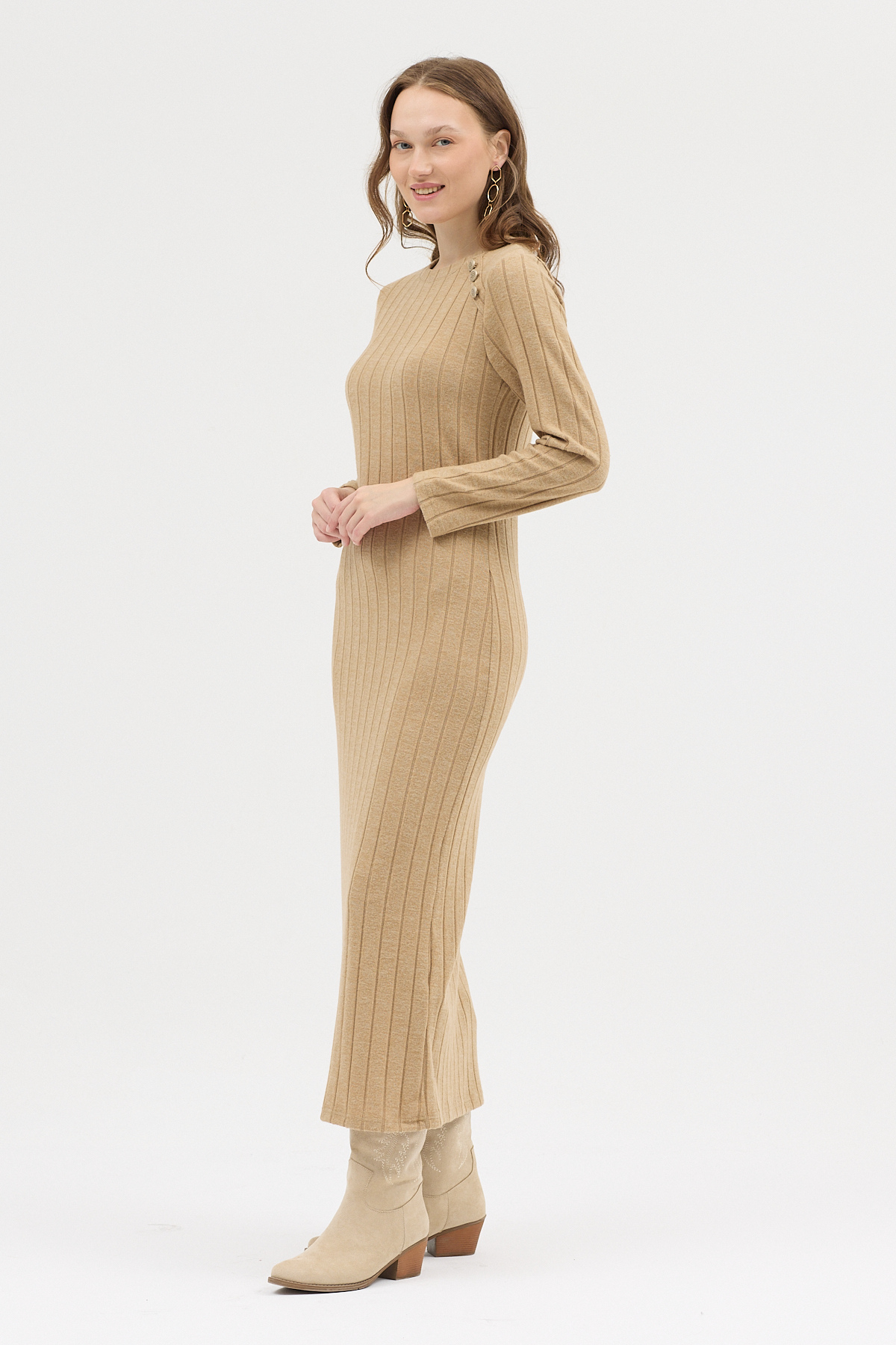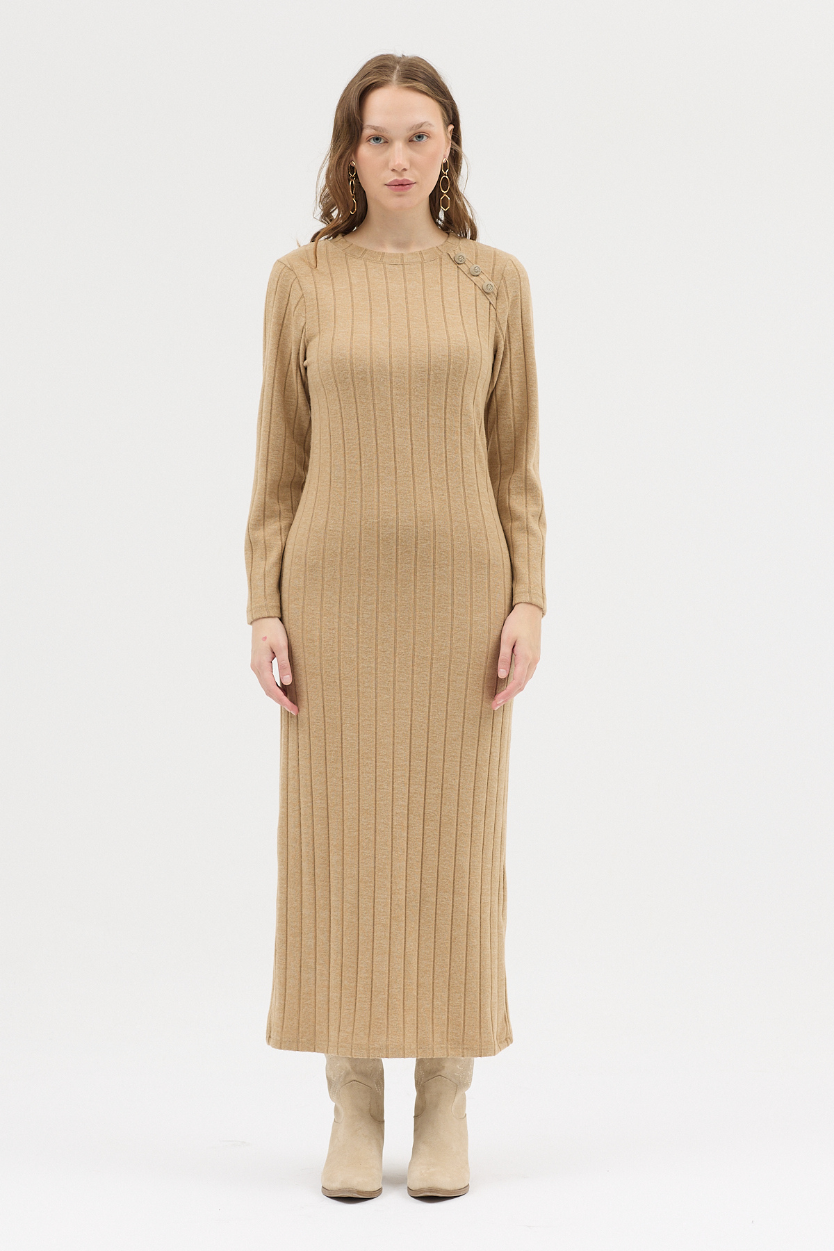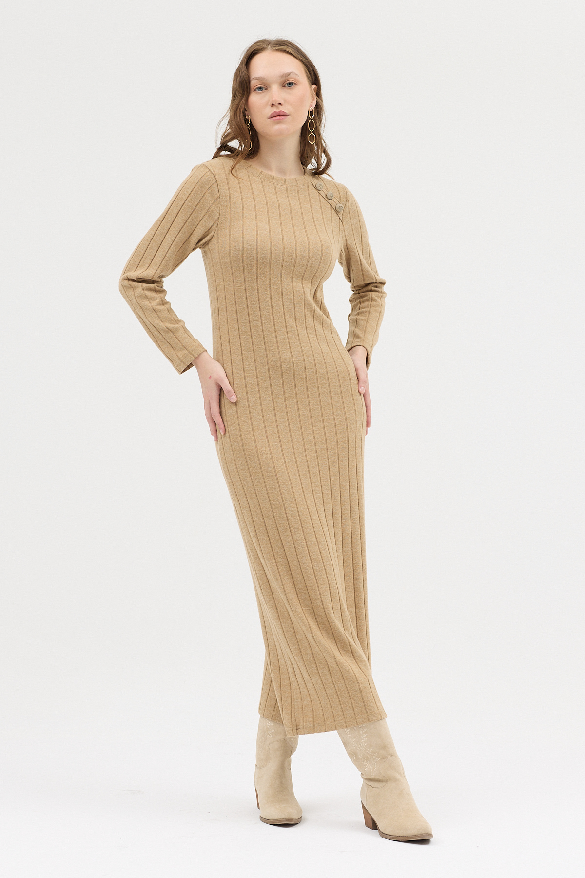 Vizon Omuz Düğme Detaylı Triko Uzun Elbise 8154A