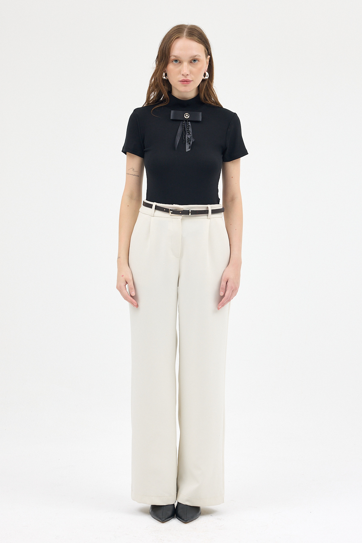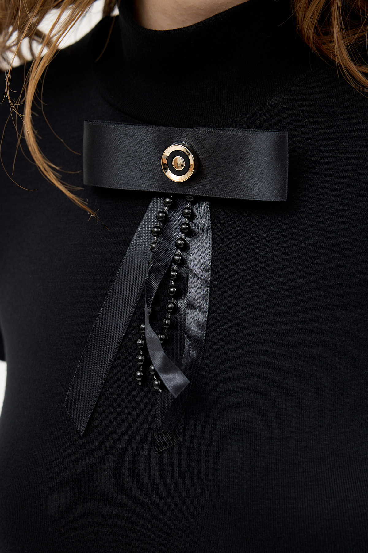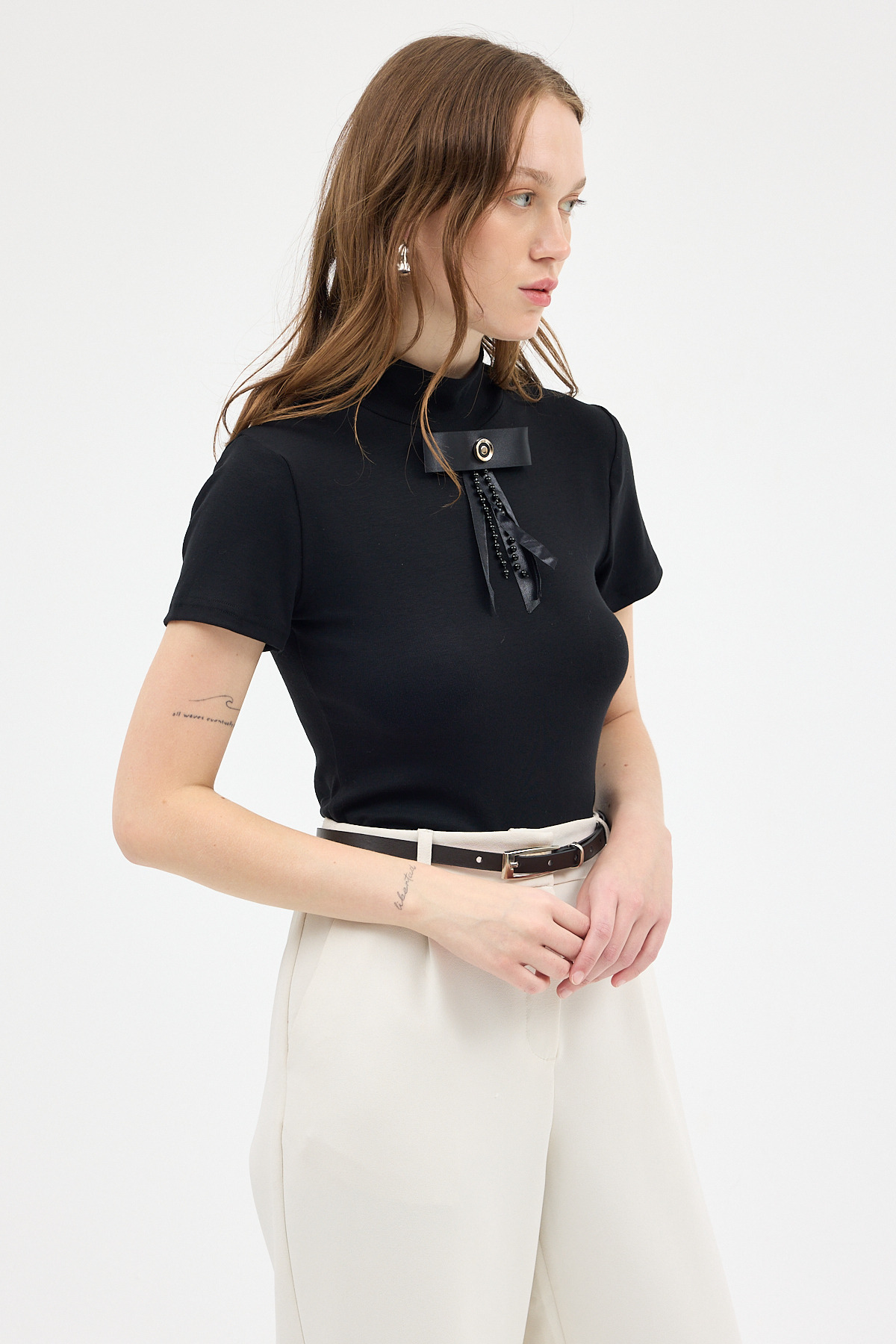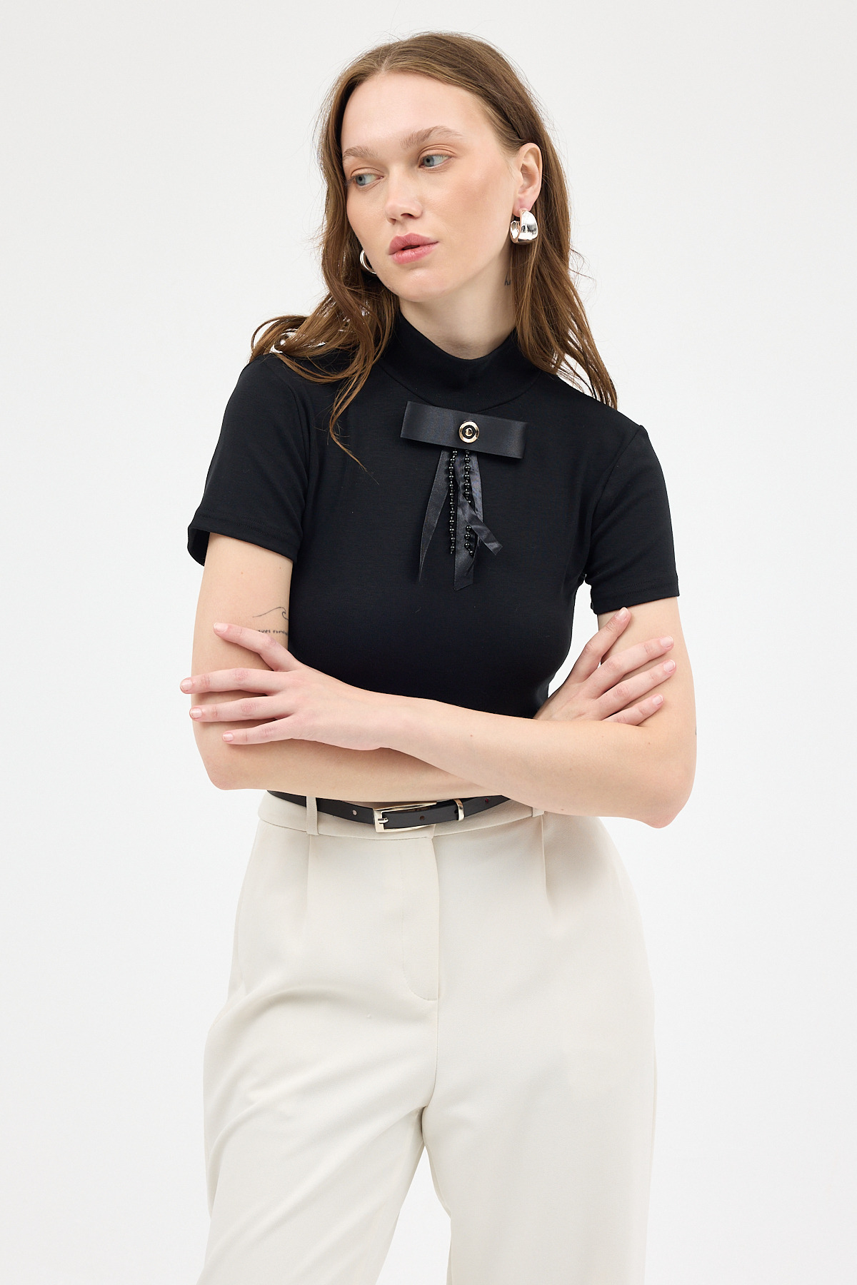 Siyah Yumuşak Dokulu Fiyonk Detaylı Yüksek Yaka Kadın Bluz 8184A