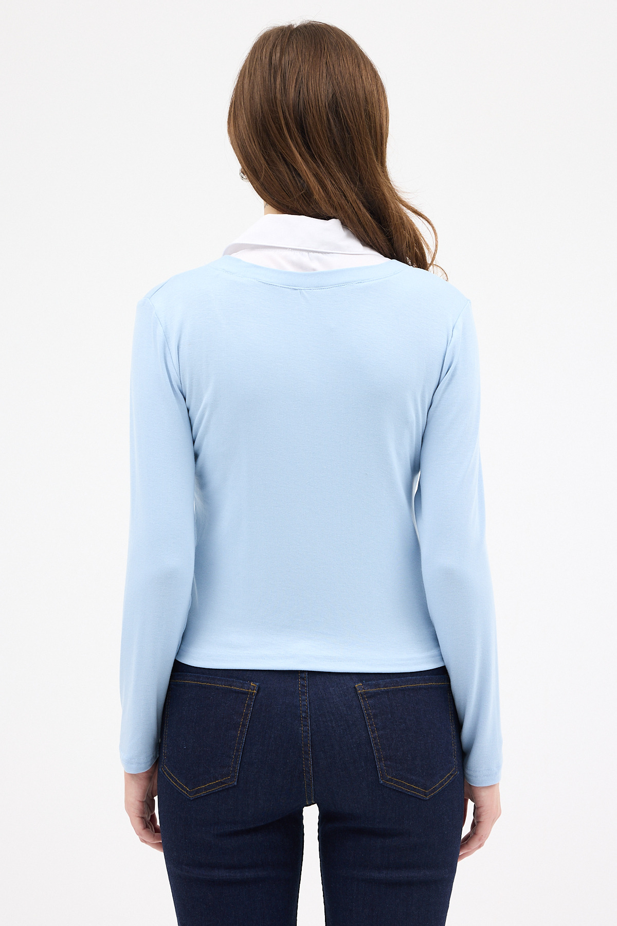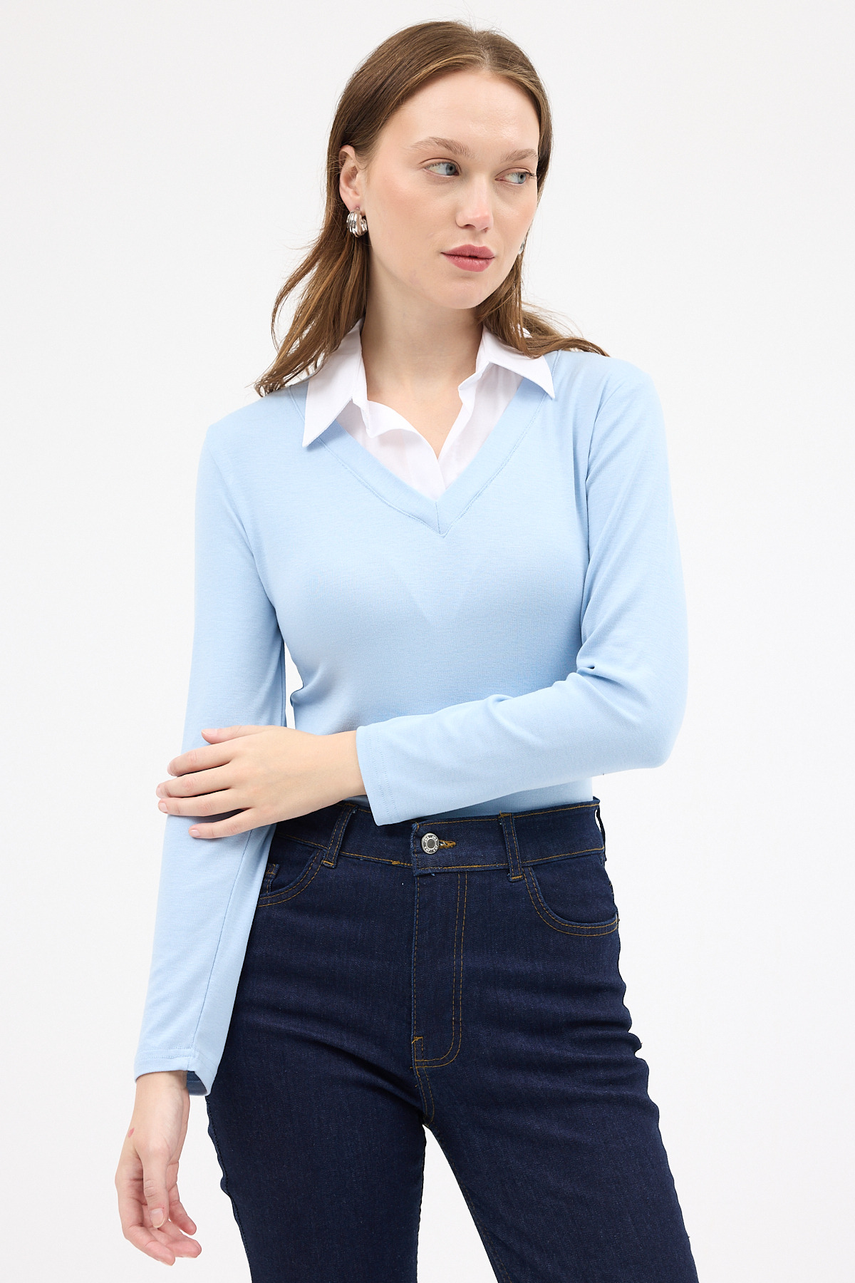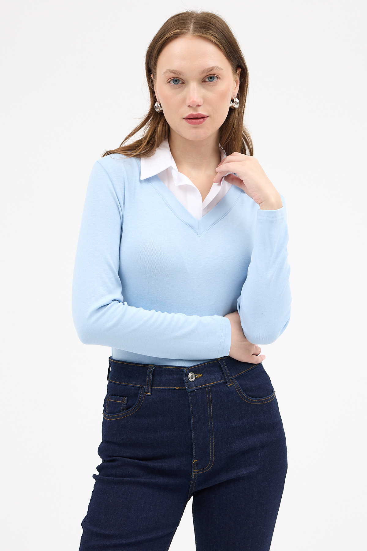 Mavi Yumuşak Dokulu Gömlek Yaka Görünümlü Bluz 8198A