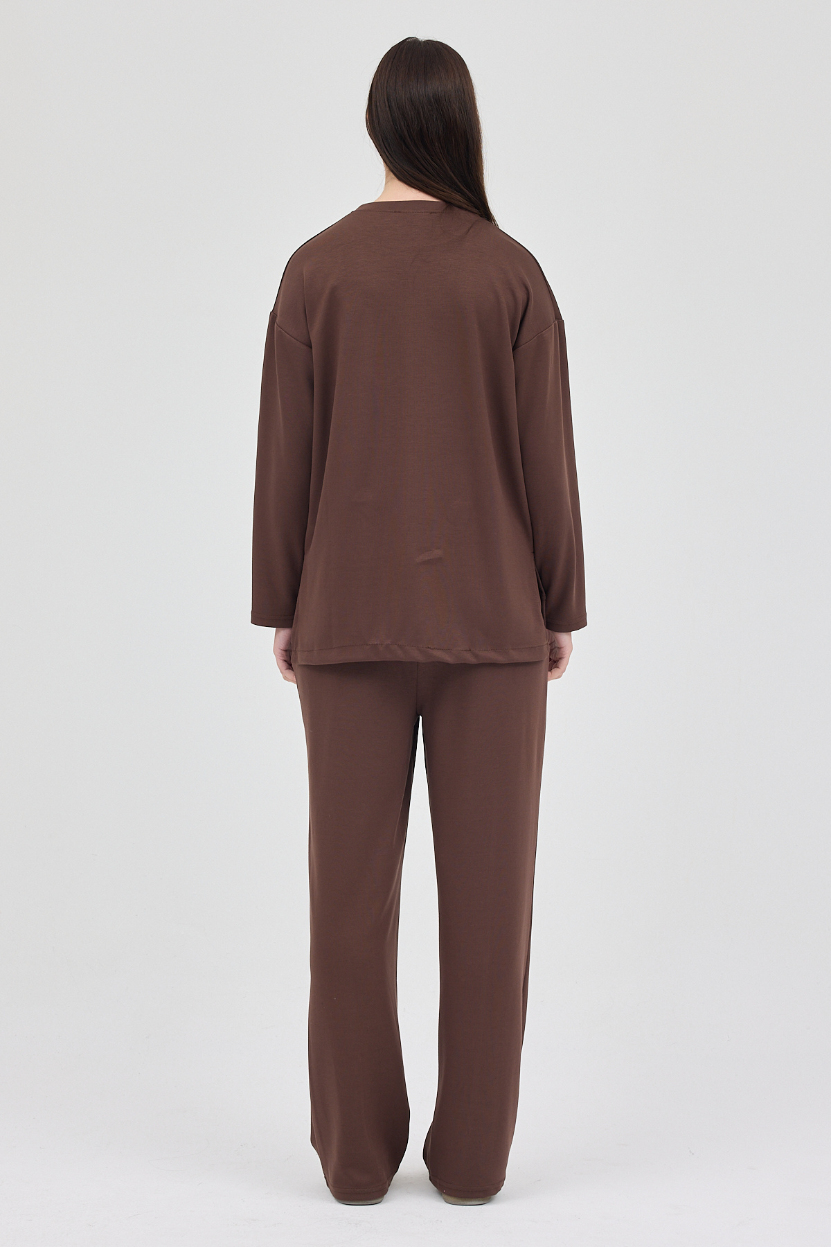 Kahve Bisiklet Yaka Kadın Pantolon Takım 8213A