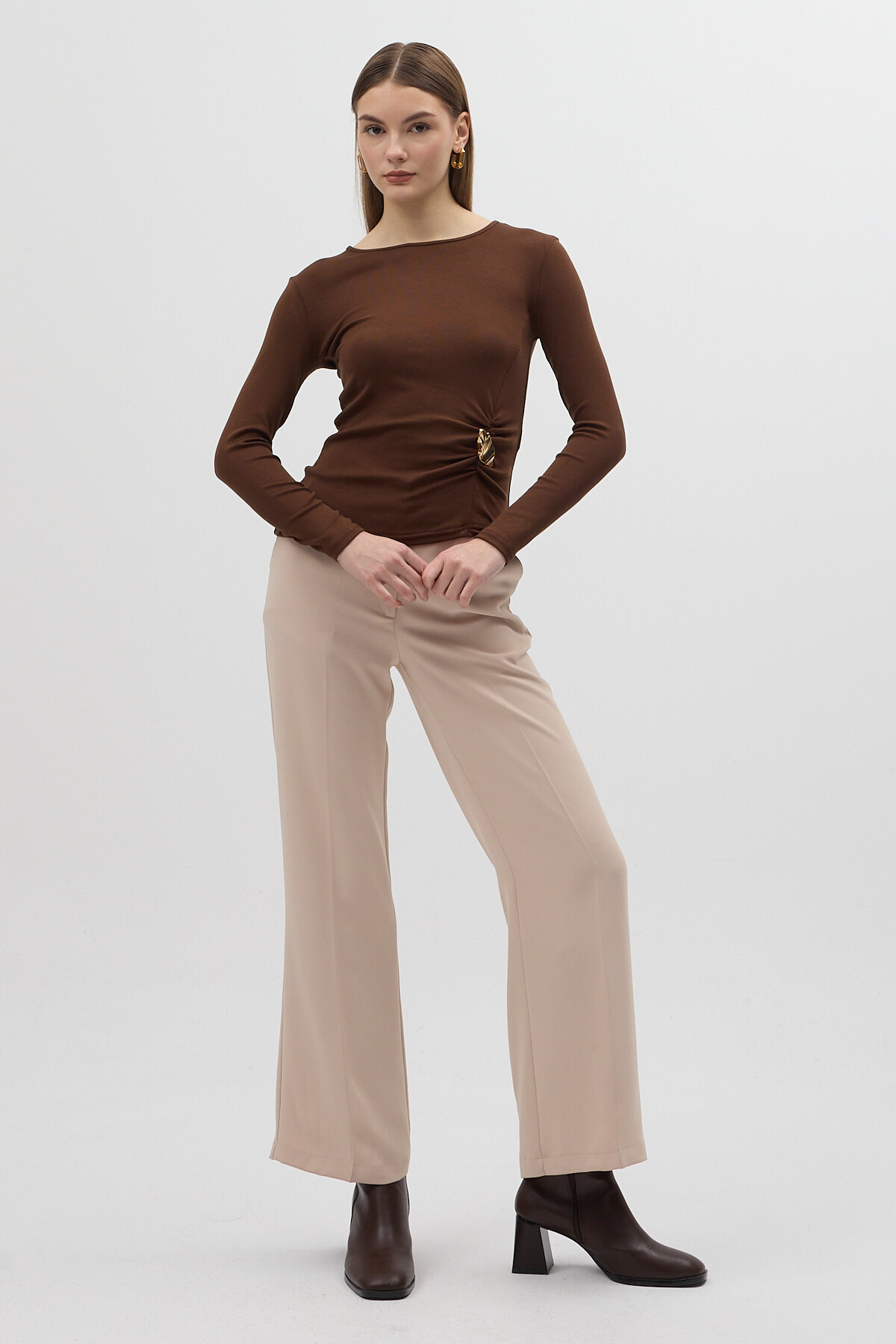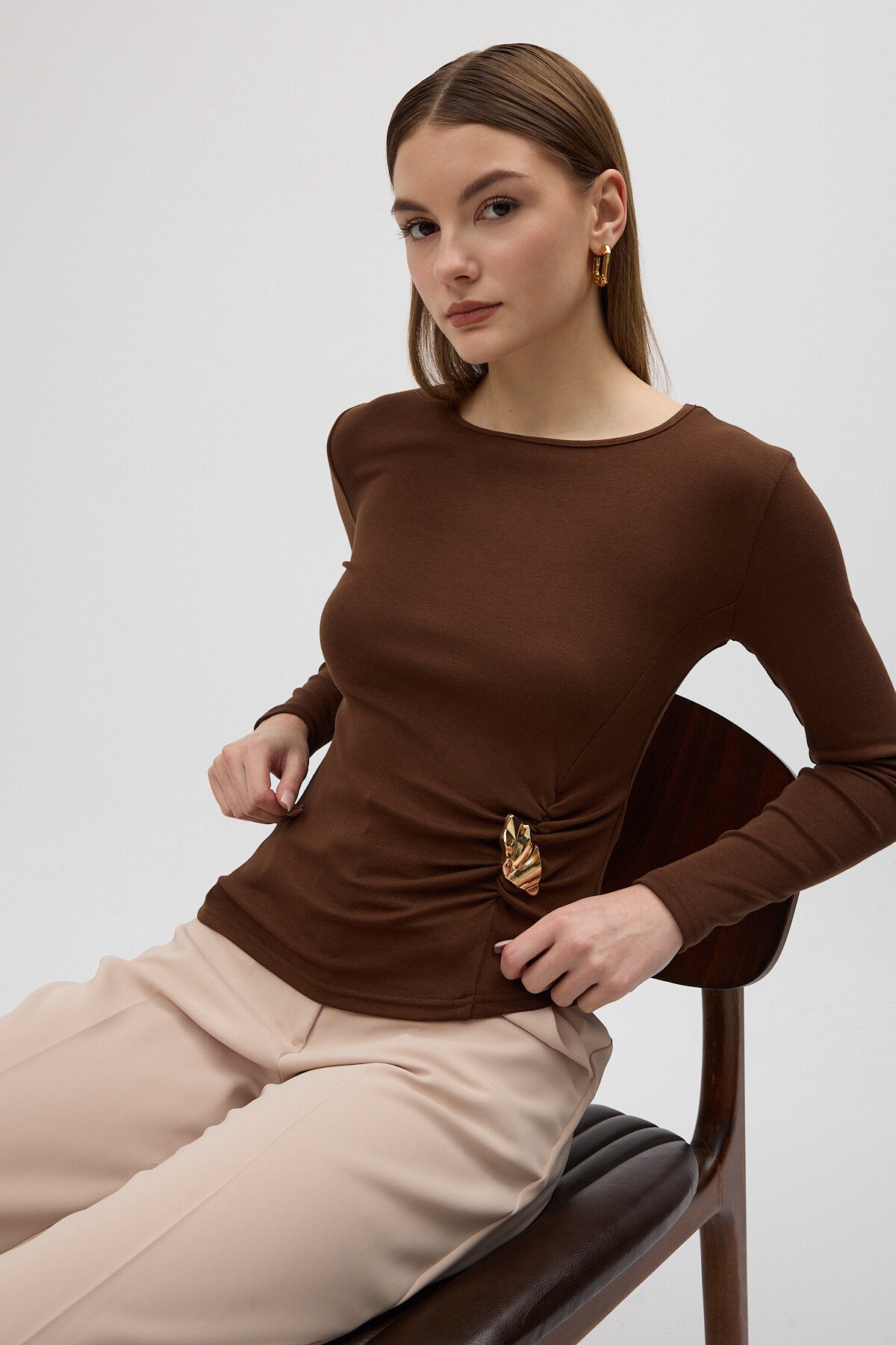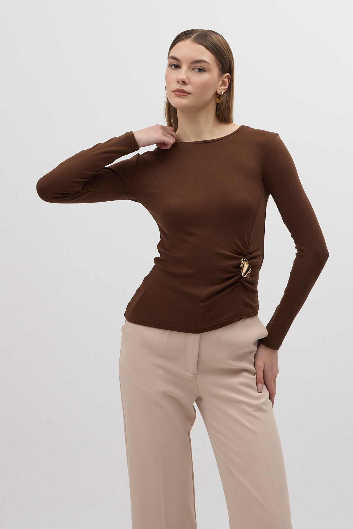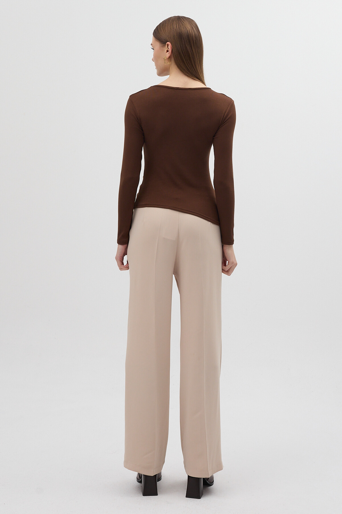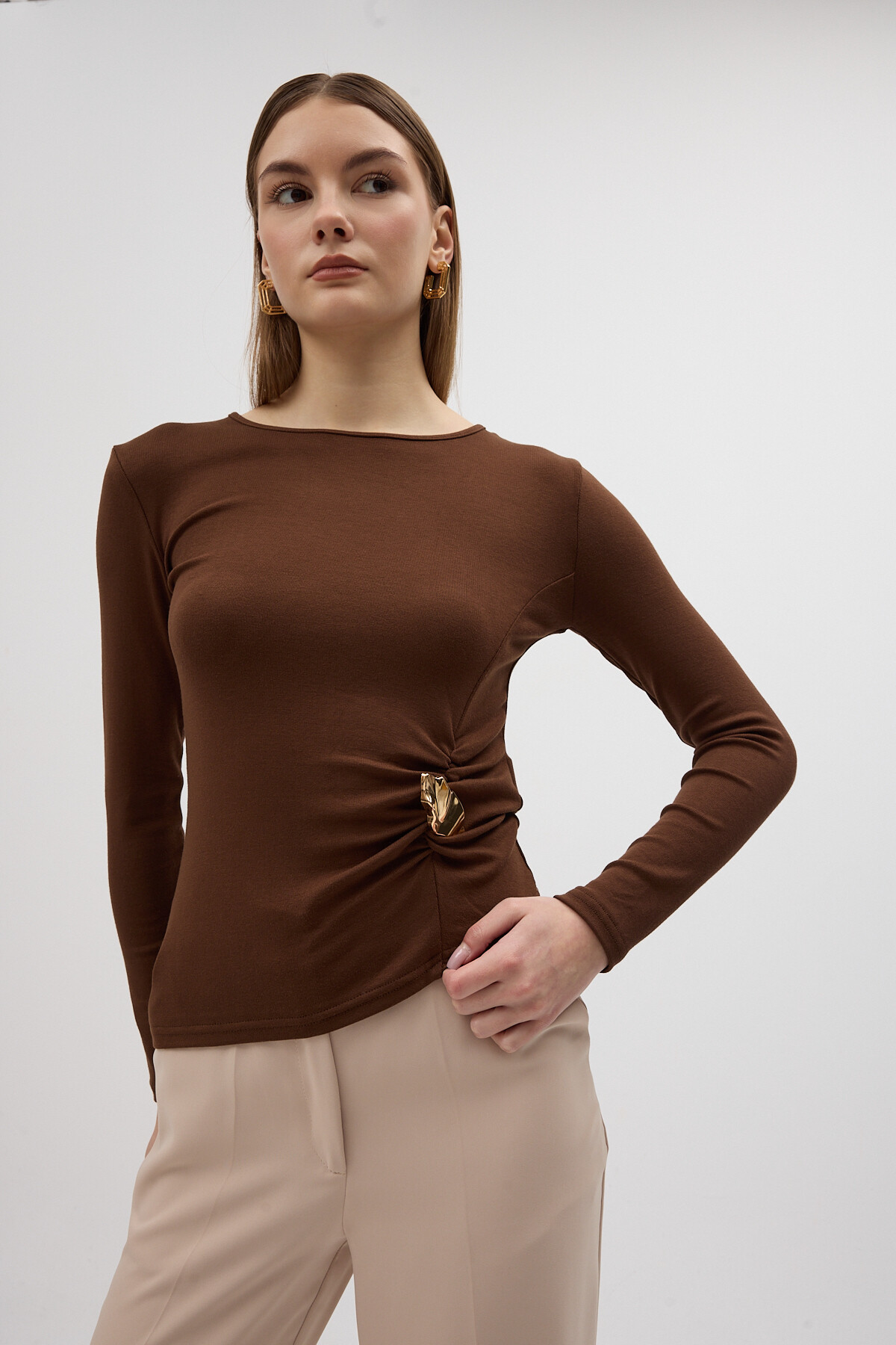 Kahverengi Bel Toka Detaylı Uzun Kollu Bluz 8221A