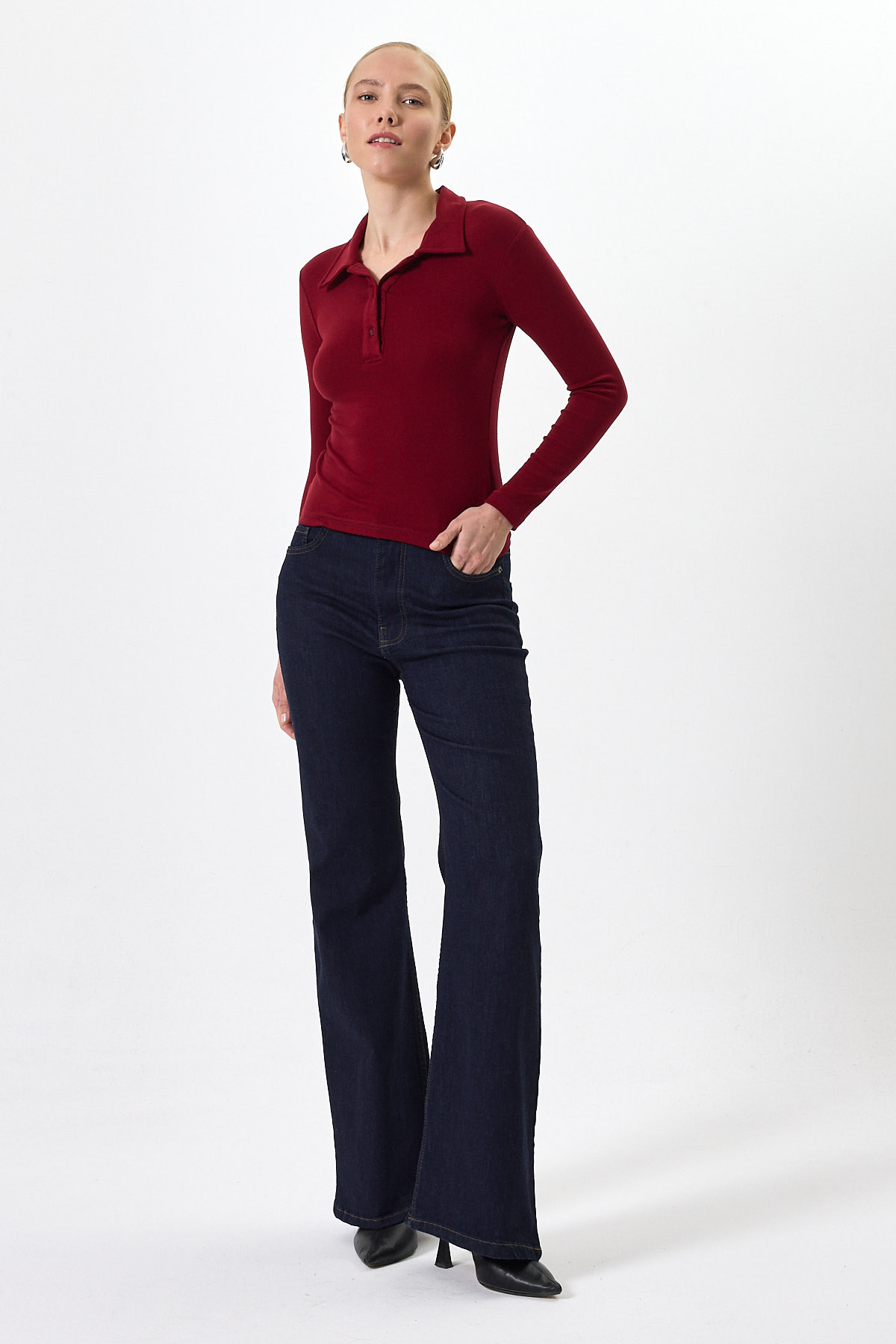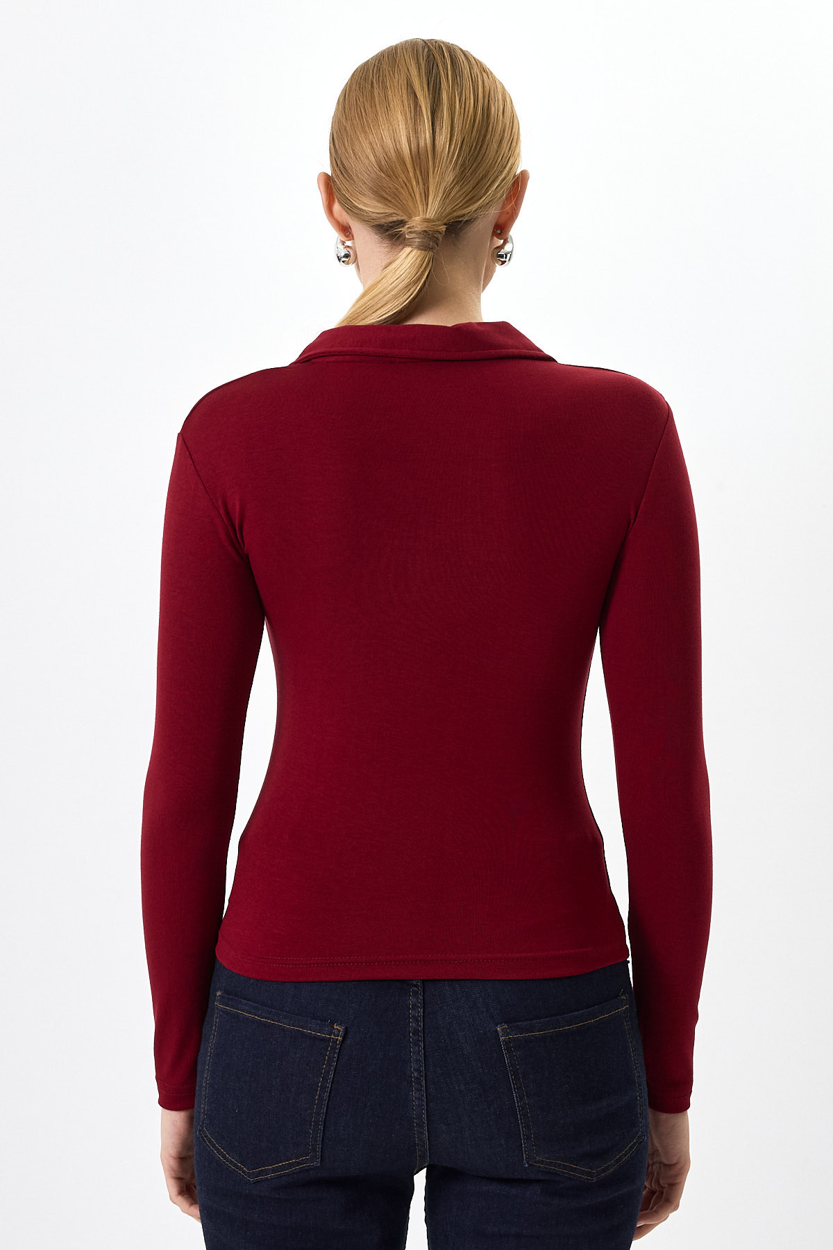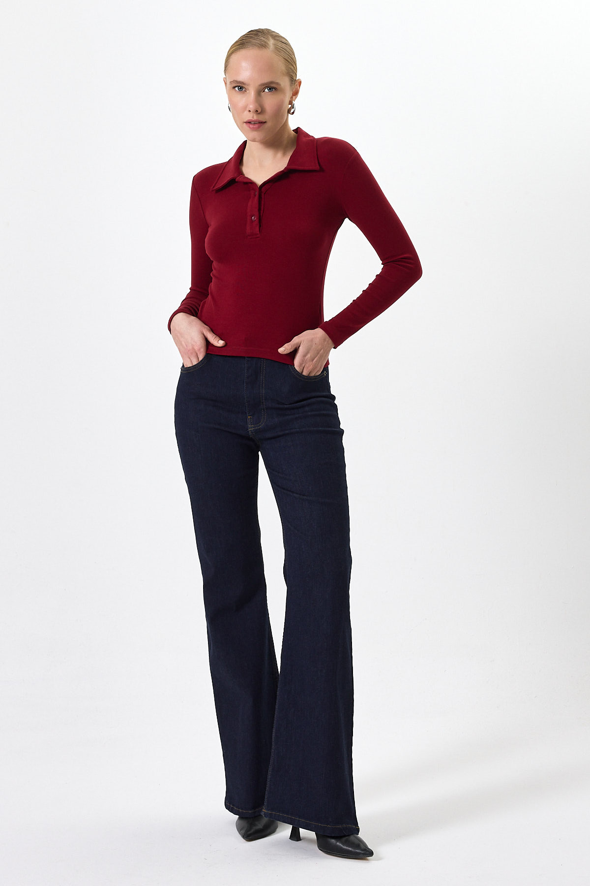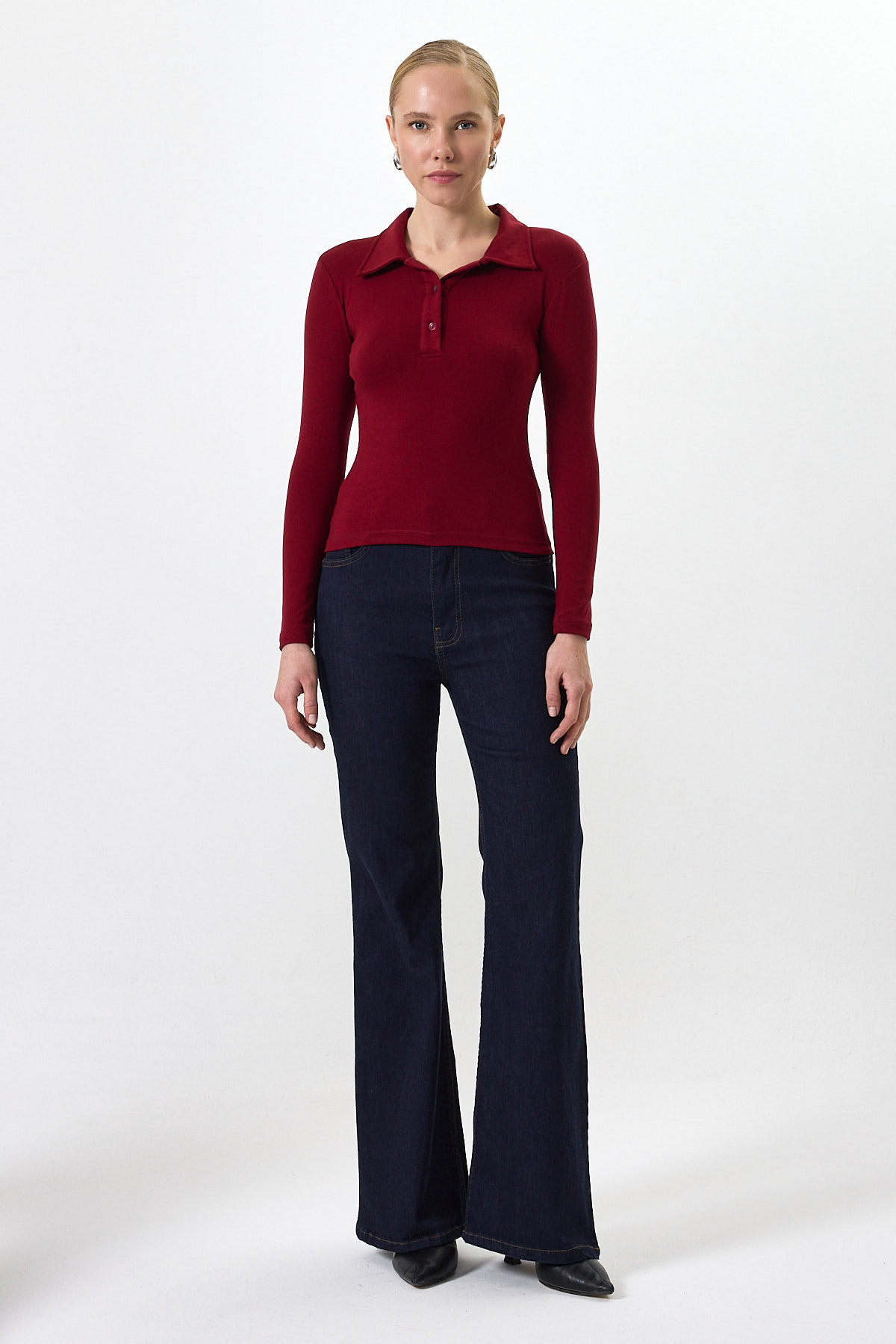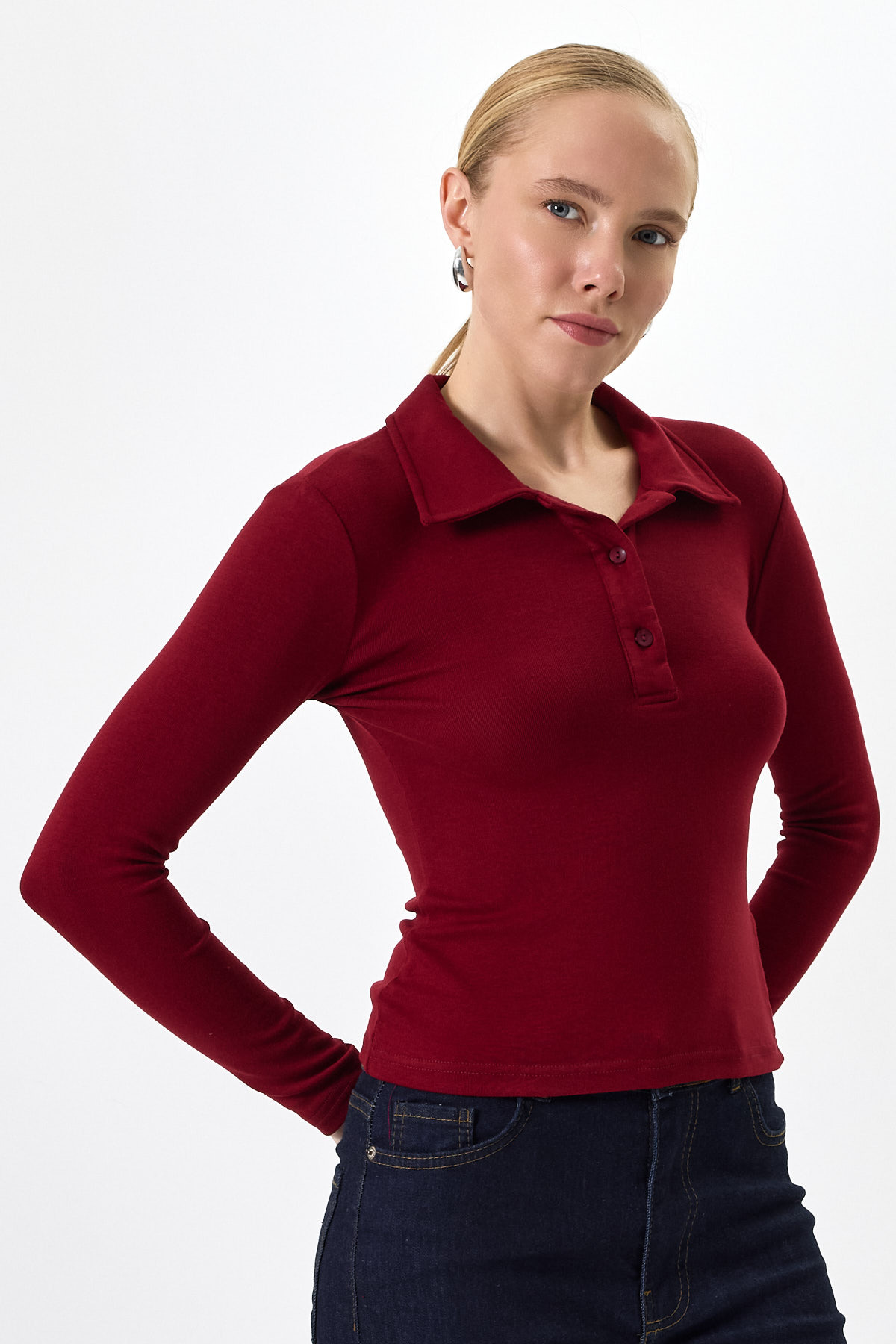 Pembe Polo Yaka Düğmeli Uzun Kollu Bluz 8222A