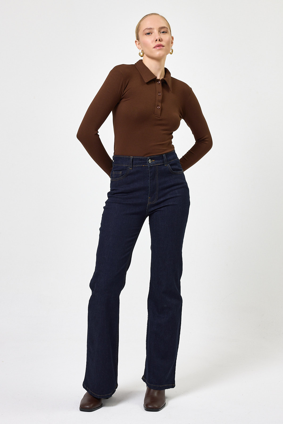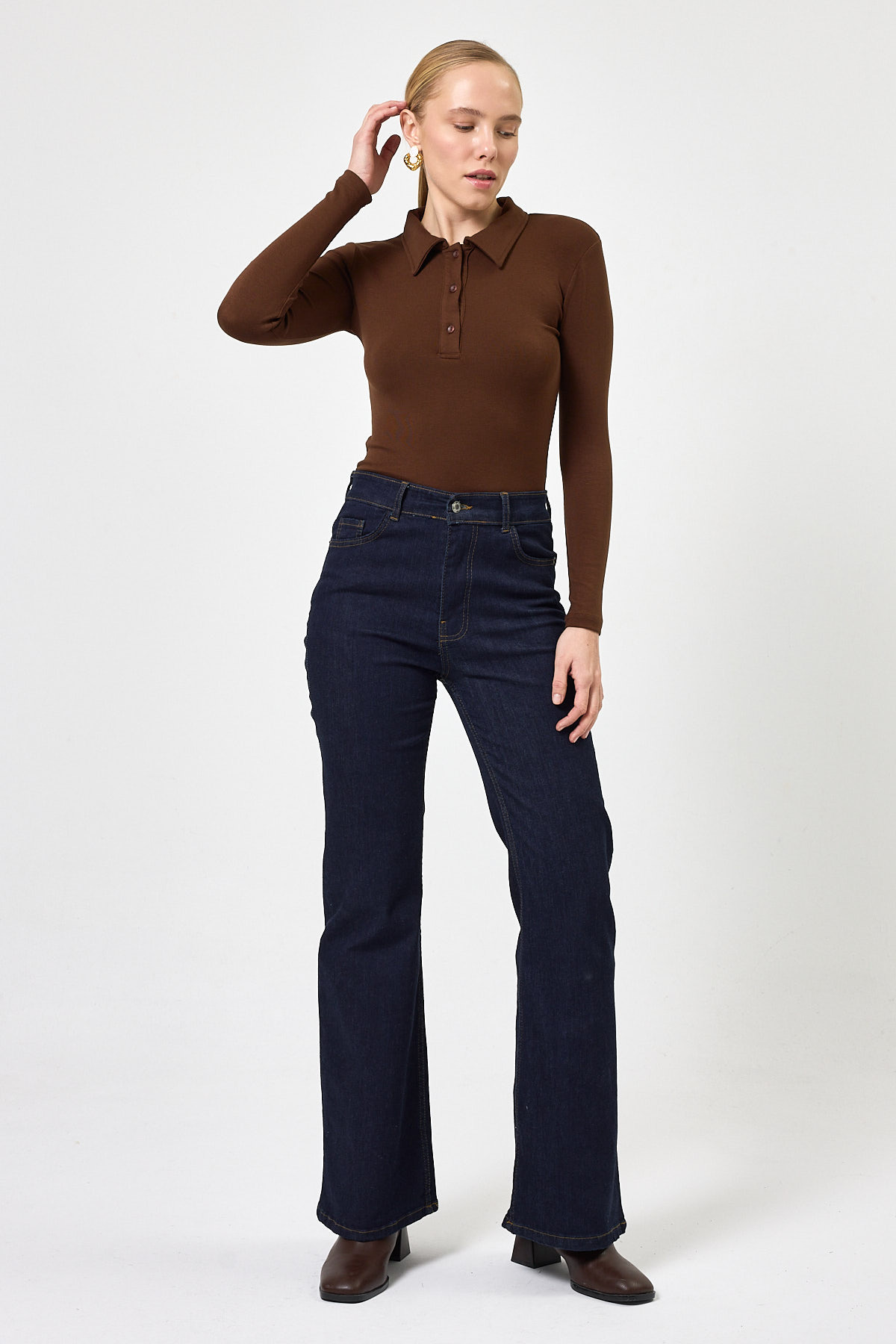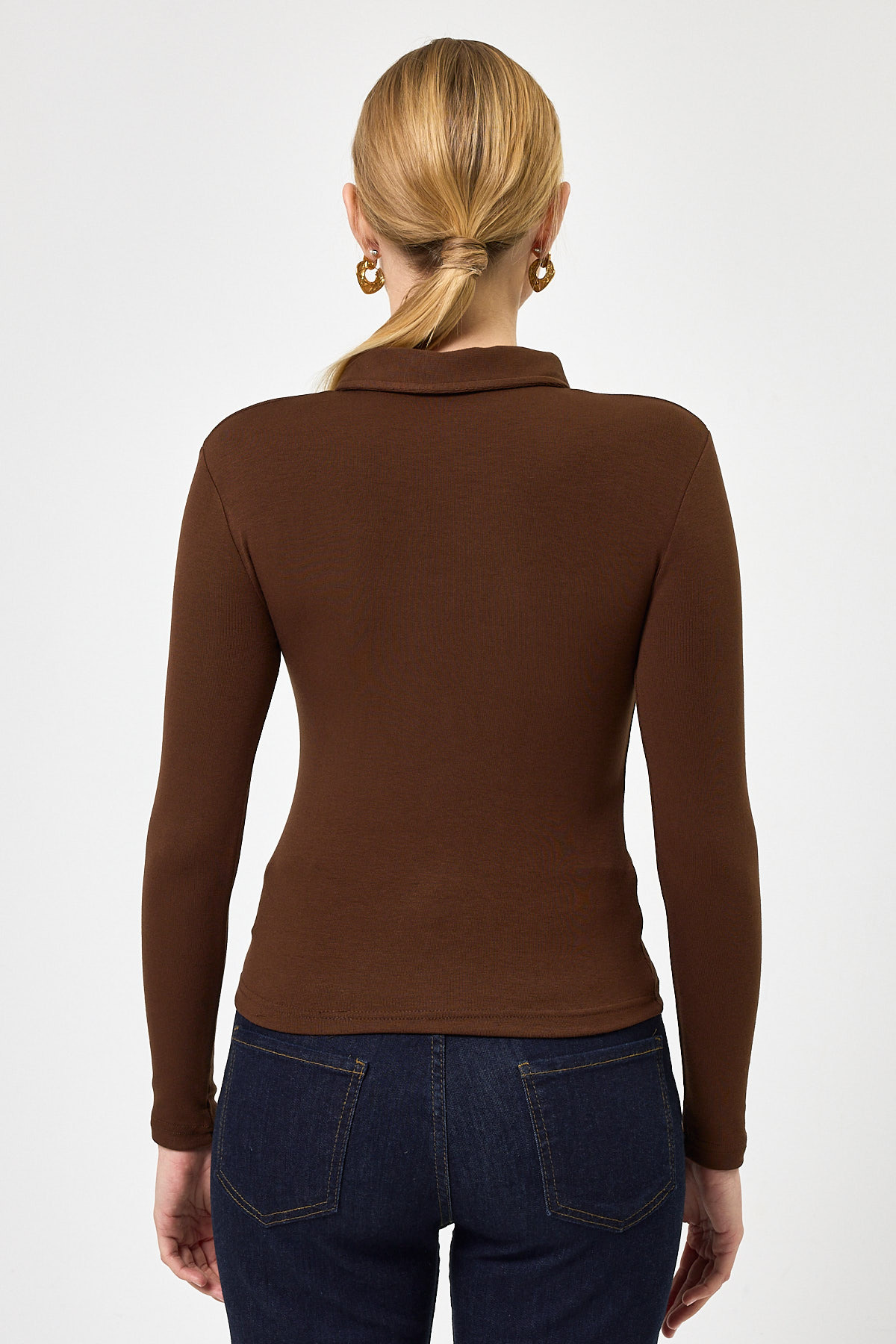 Kahverengi Polo Yaka Düğmeli Uzun Kollu Bluz 8222A