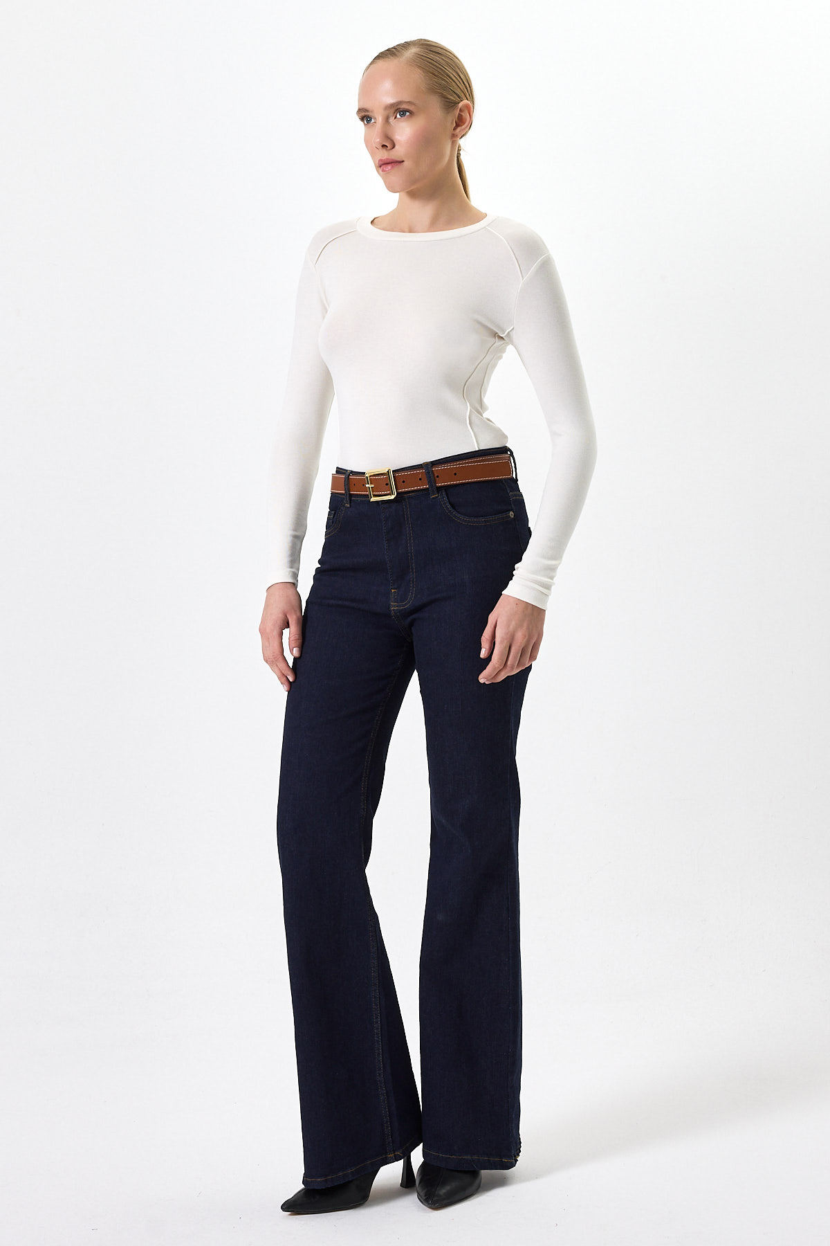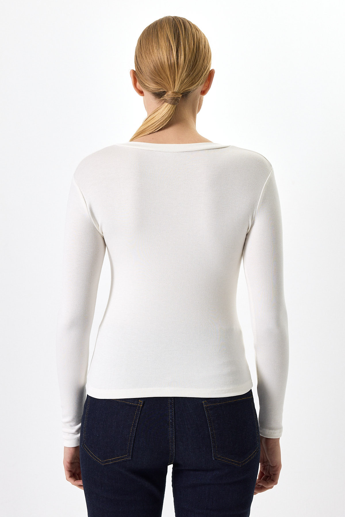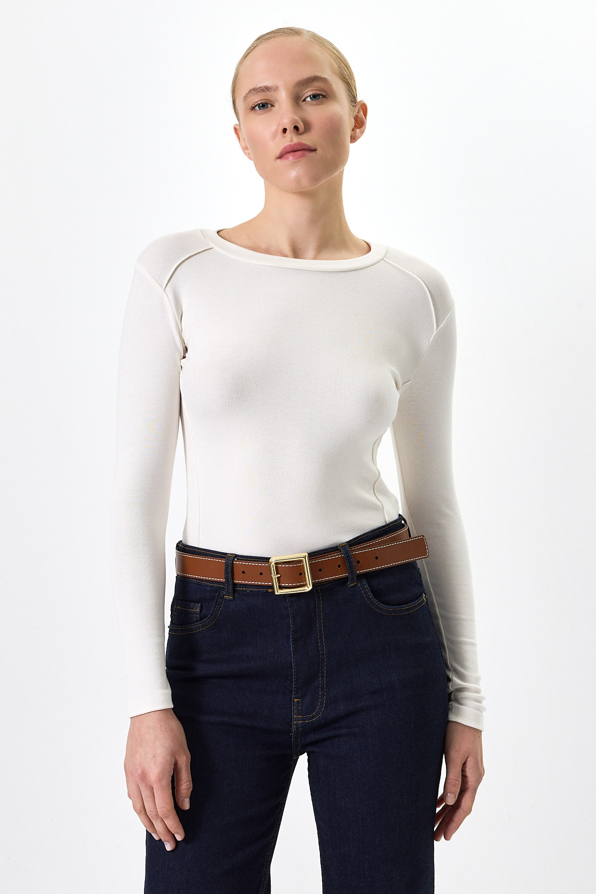 Ekru Uzun Kollu Bisiklet Yaka Dikiş Detaylı Kadın Body 8223A