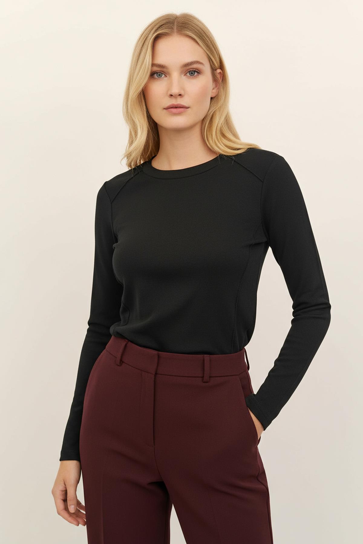 Siyah Kare Yaka Uzun Kollu Fitilli Kadın Body 8267A