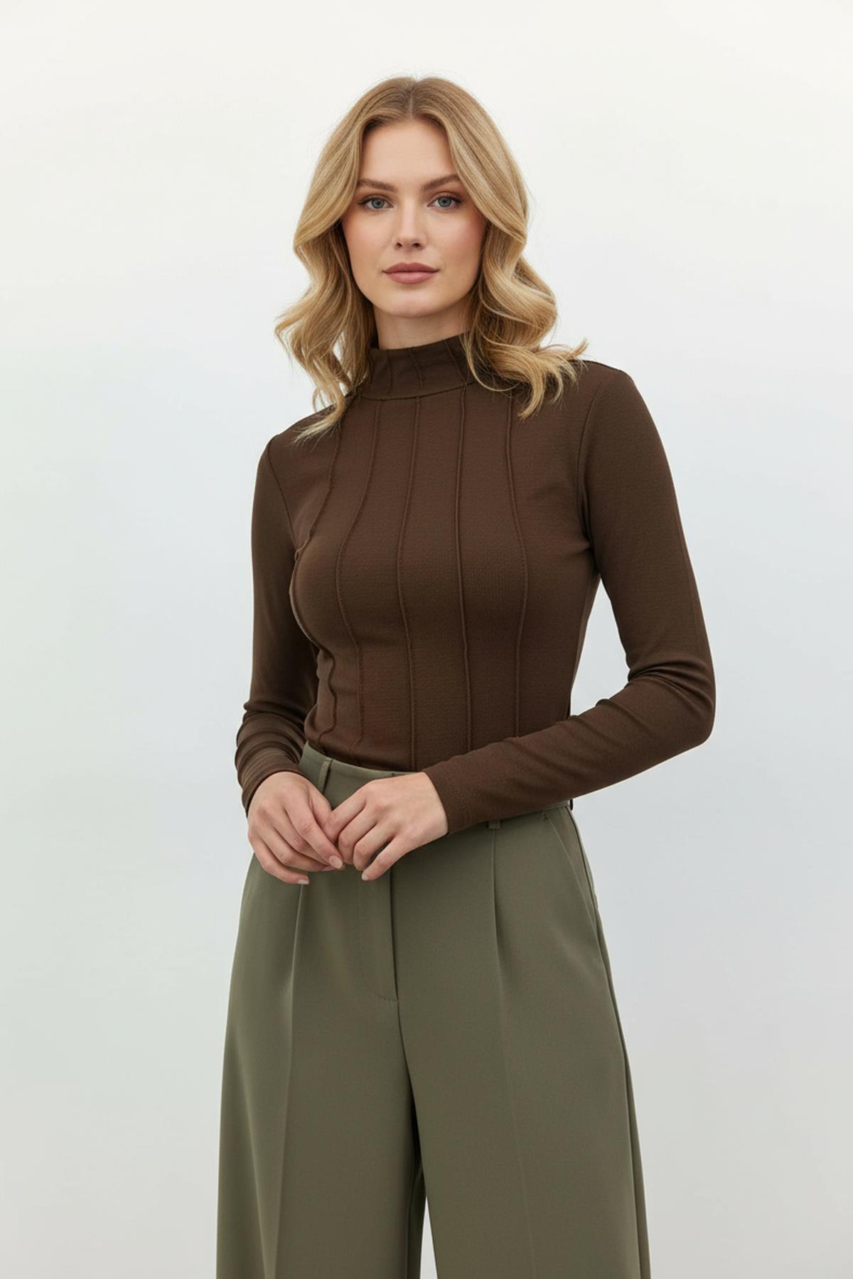 Kahverengi Kare Yaka Uzun Kollu Fitilli Kadın Body 8267A