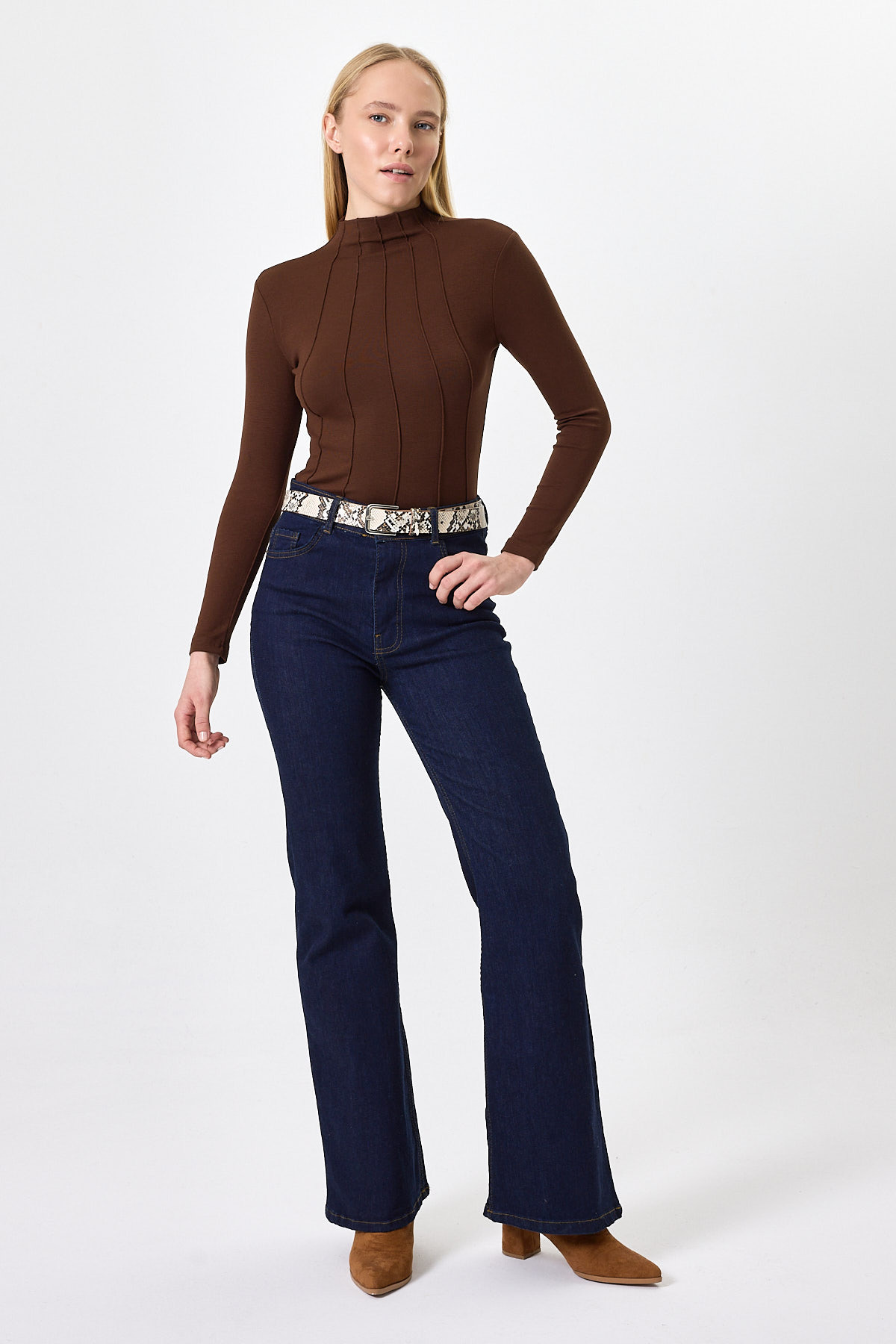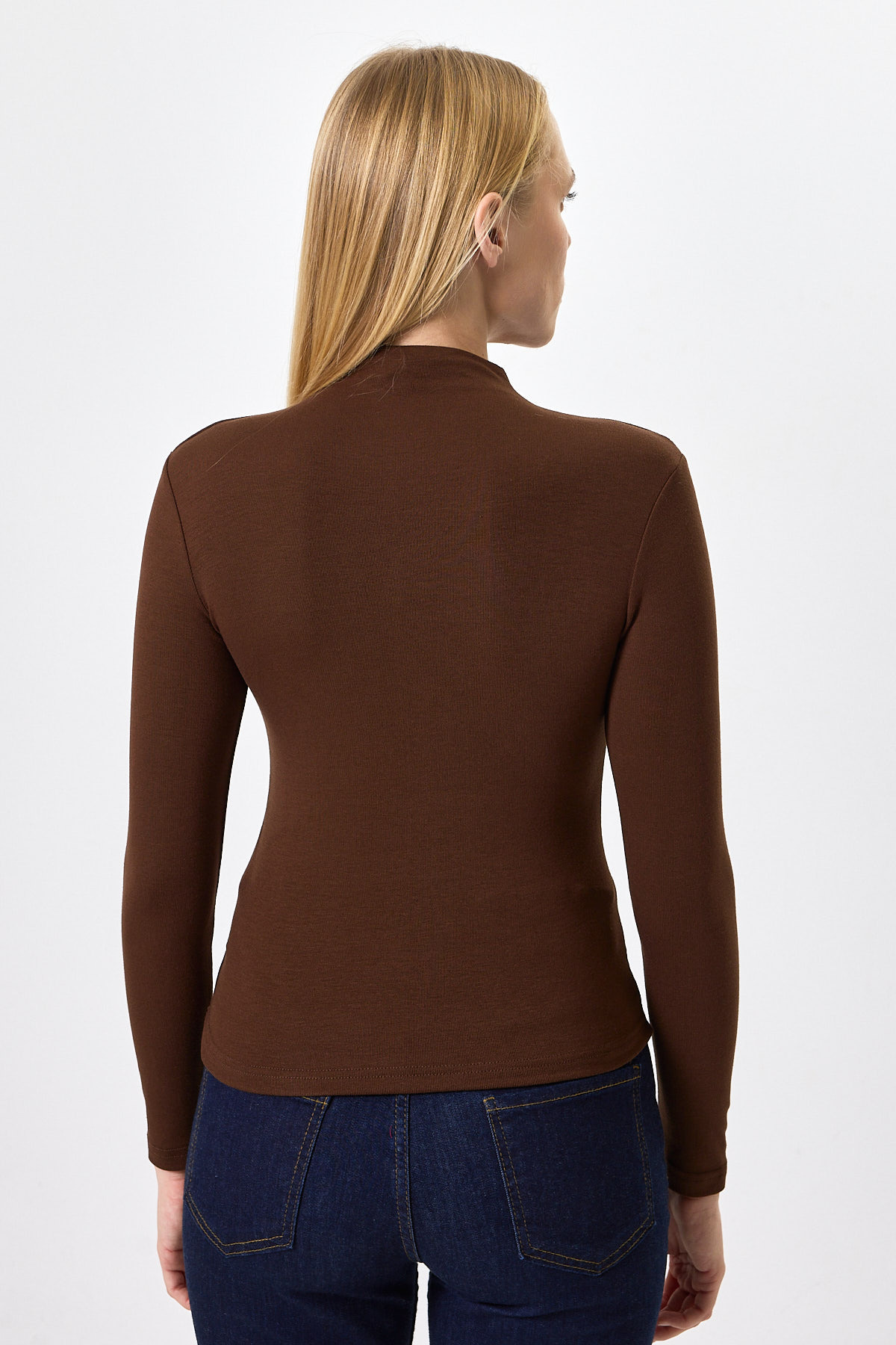 Kahverengi Uzun Kollu Yarım Balıkçı Yaka Dikiş Detaylı Kadın Body 8225A