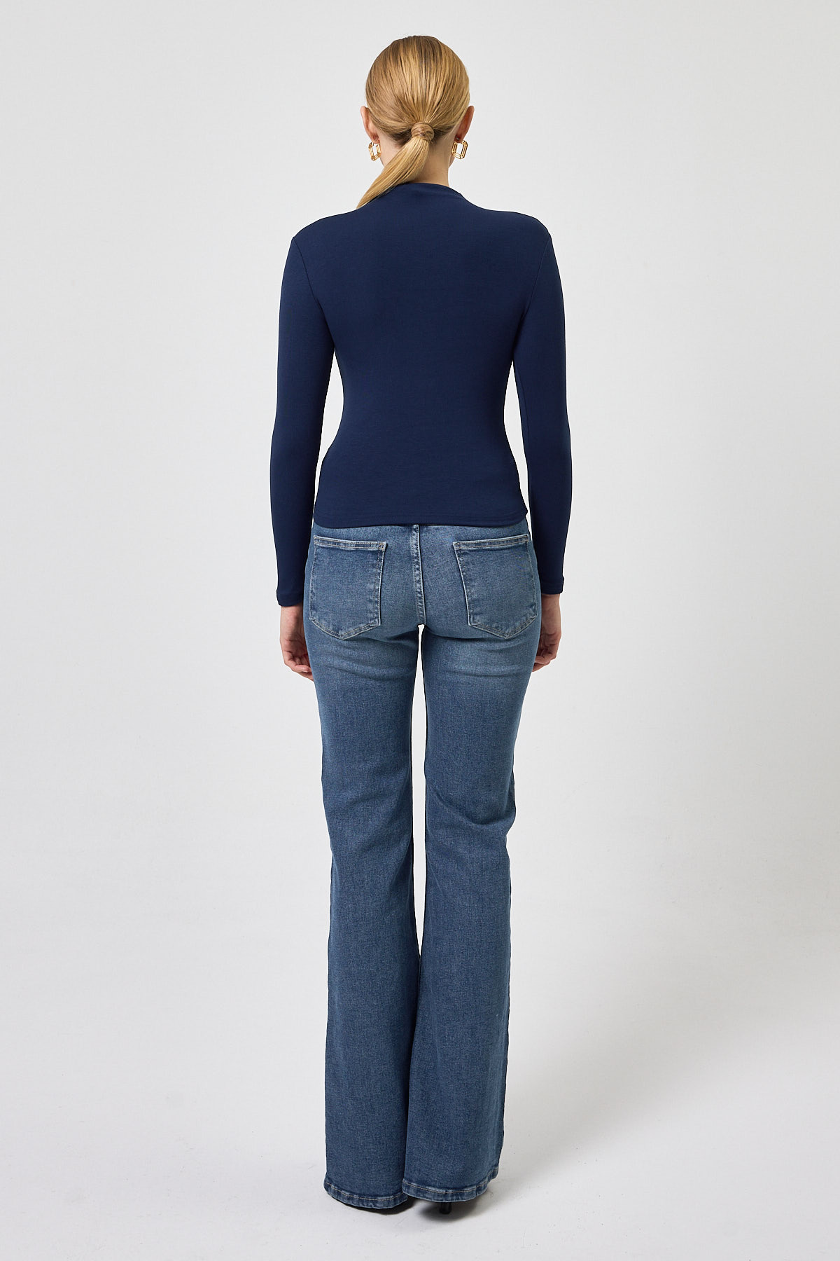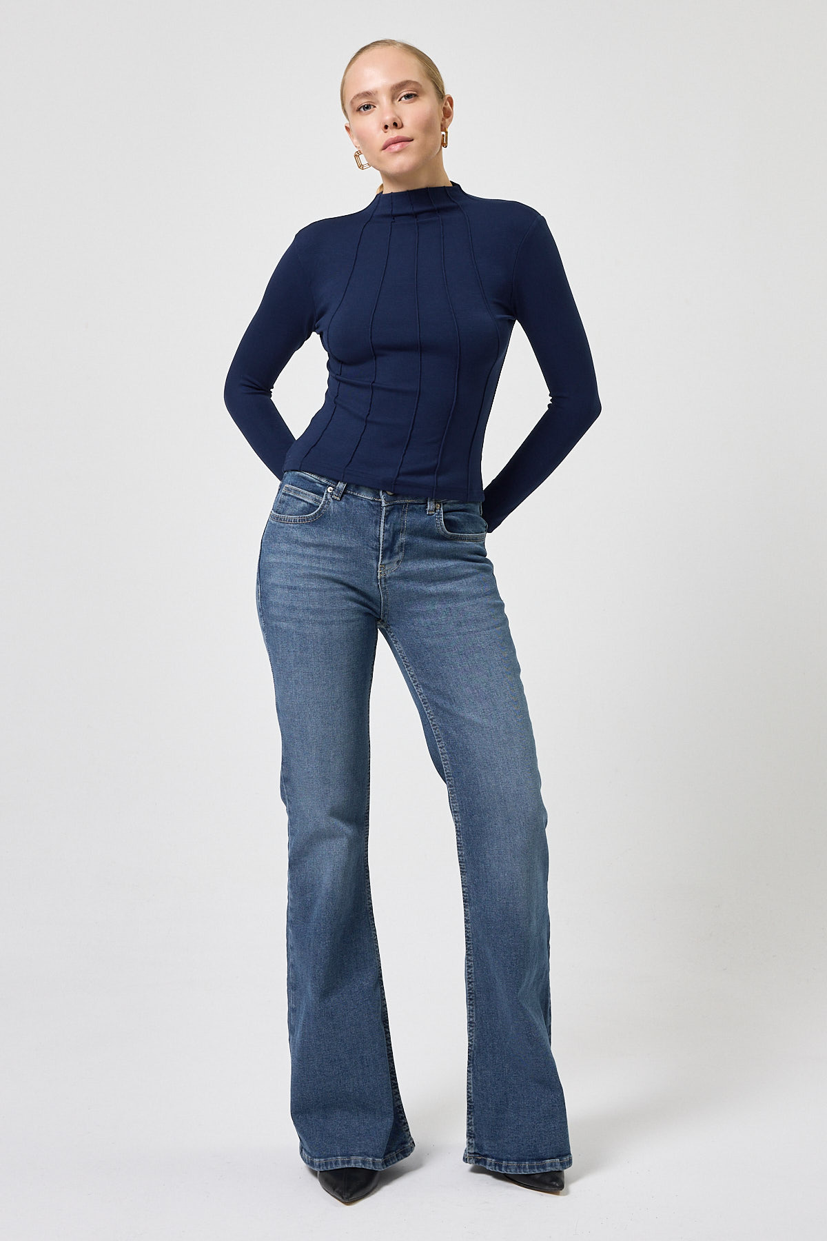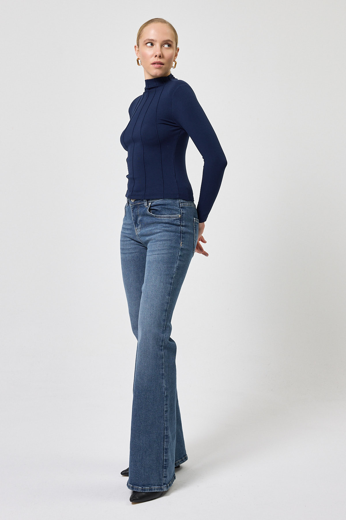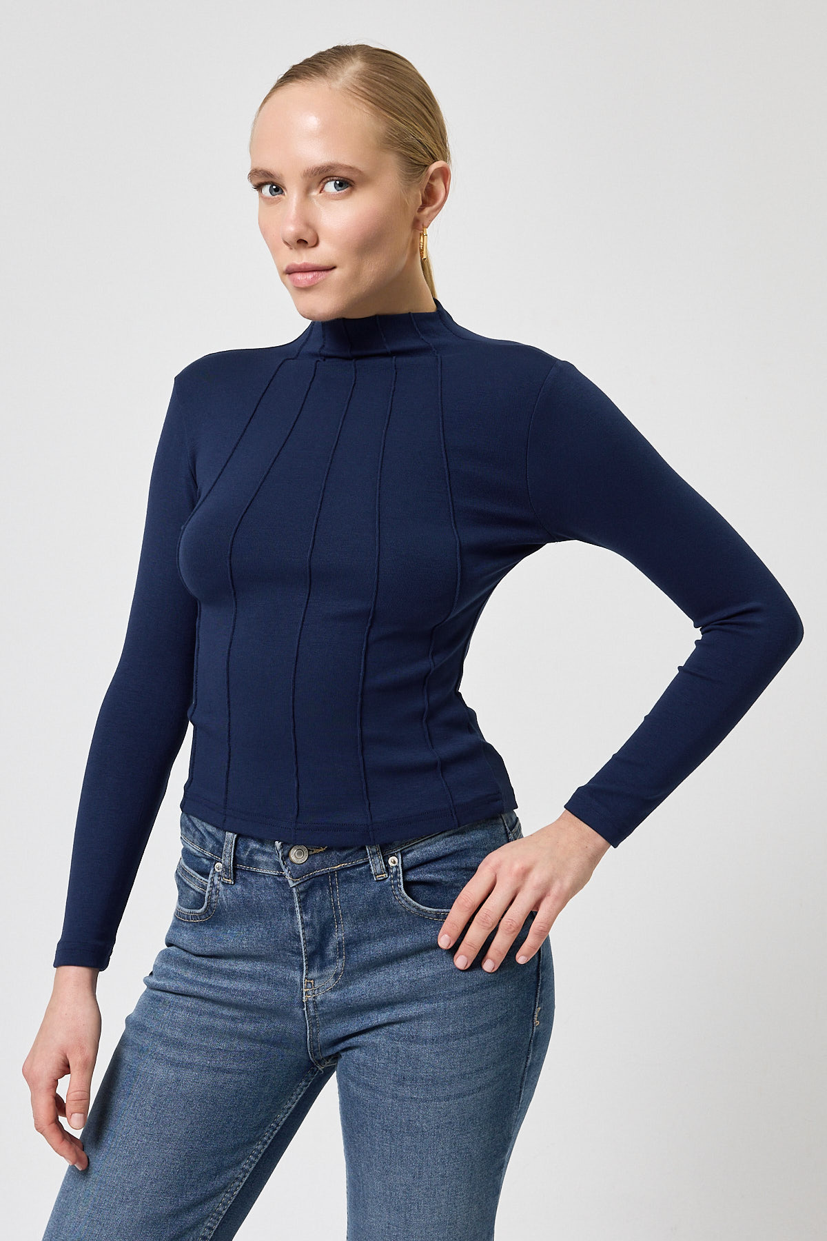 Lacivert Uzun Kollu Yarım Balıkçı Yaka Dikiş Detaylı Kadın Body 8225A
